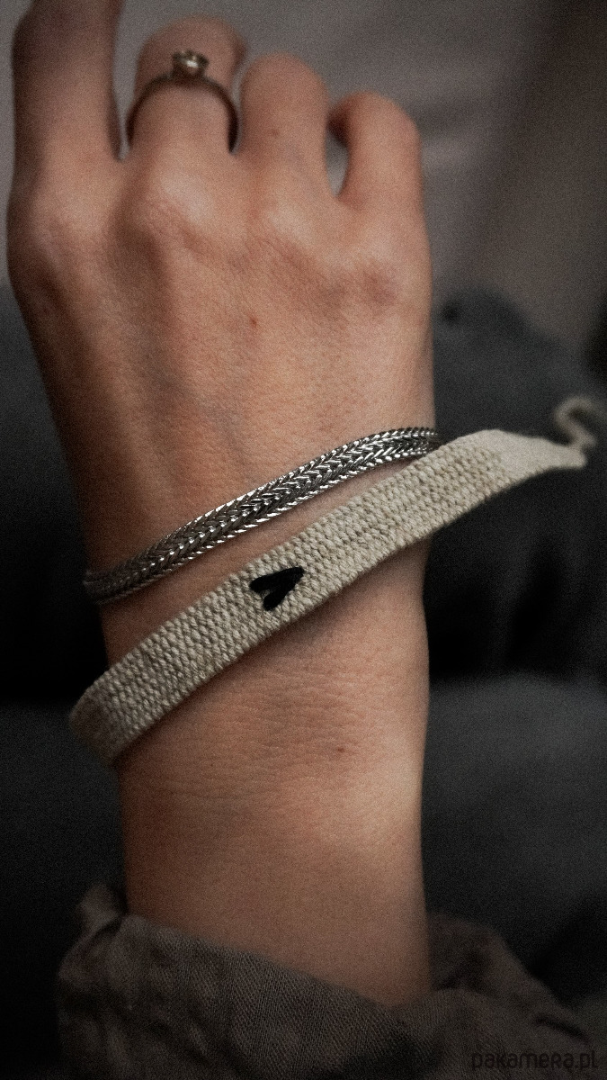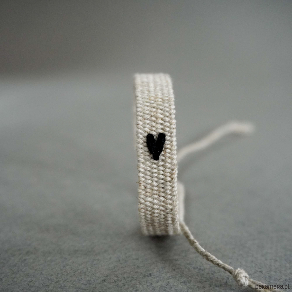 Śliczna, bransoletka ręcznie tkana z haftowanym serduszkiem wykonana z mieszanki lnu i bawełny. Szerokość około 1 cm , długość części tkanej około 14,15 cm plus sznureczki do samodzielnego wiązania na supełek (należy go mocno zawiązać). Polecam serdecznie ♡