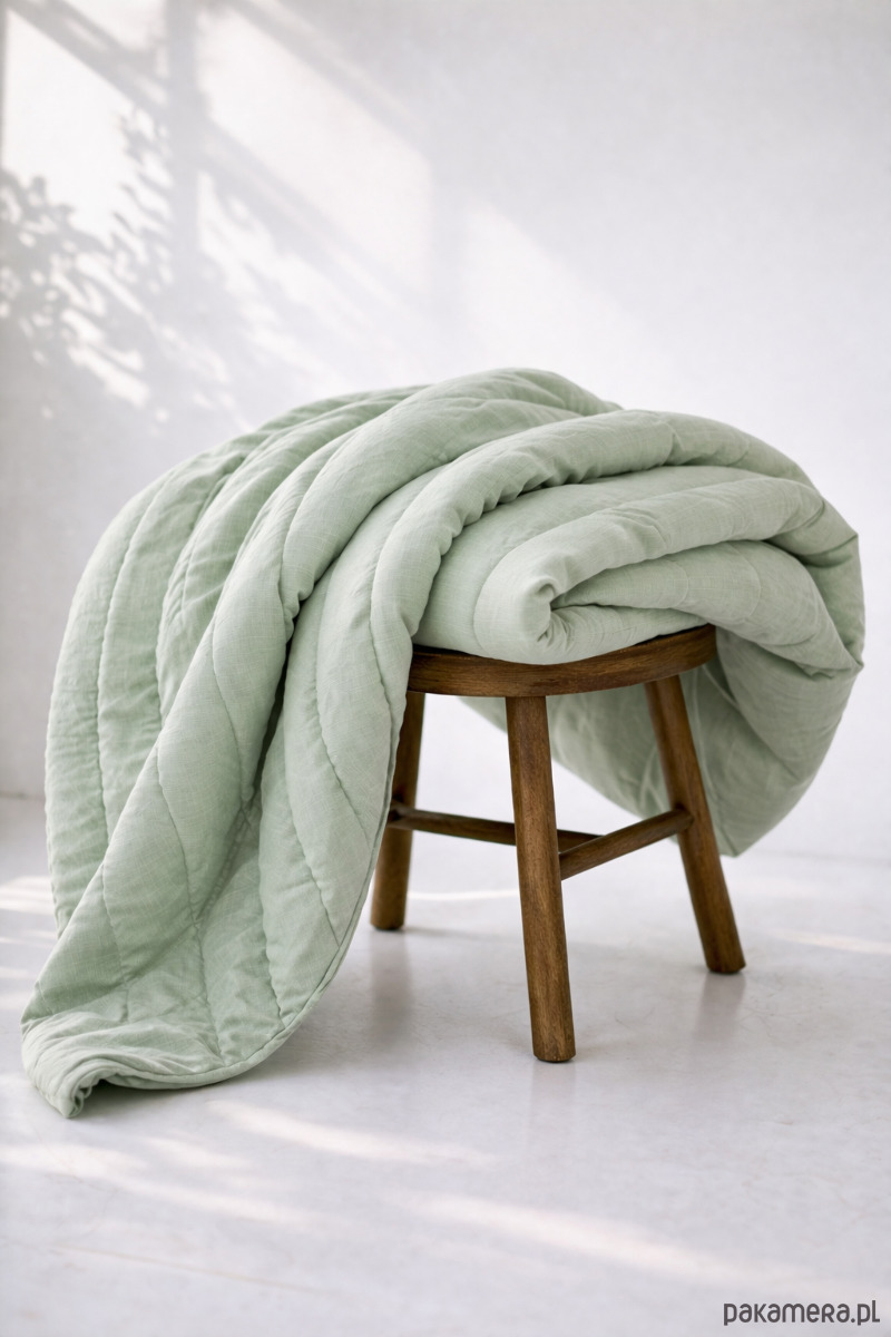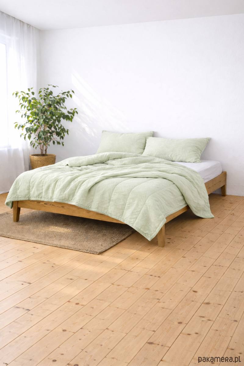 140×200 cm · 100% len · wypełnienie 200 g/m² · pikowanie co 20 cm · Polska produkcja