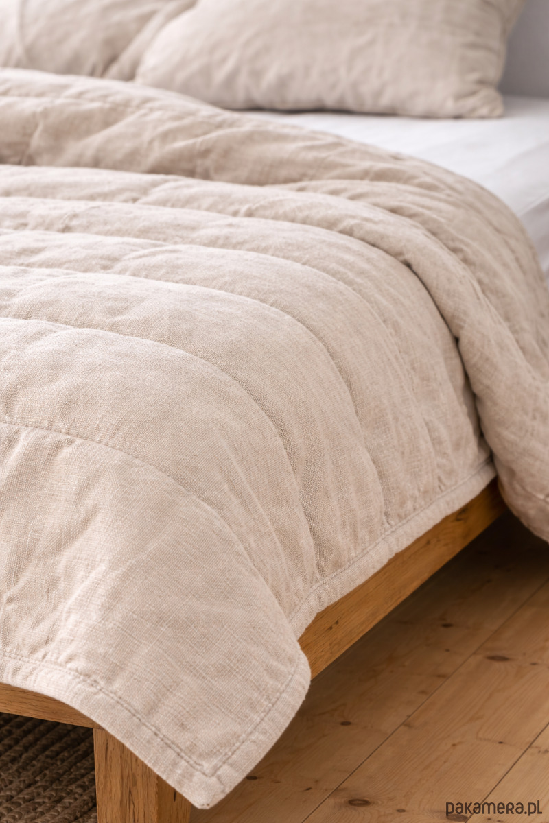 140×200 cm · 100% len · wypełnienie 200 g/m² · pikowanie co 20 cm · Polska produkcja