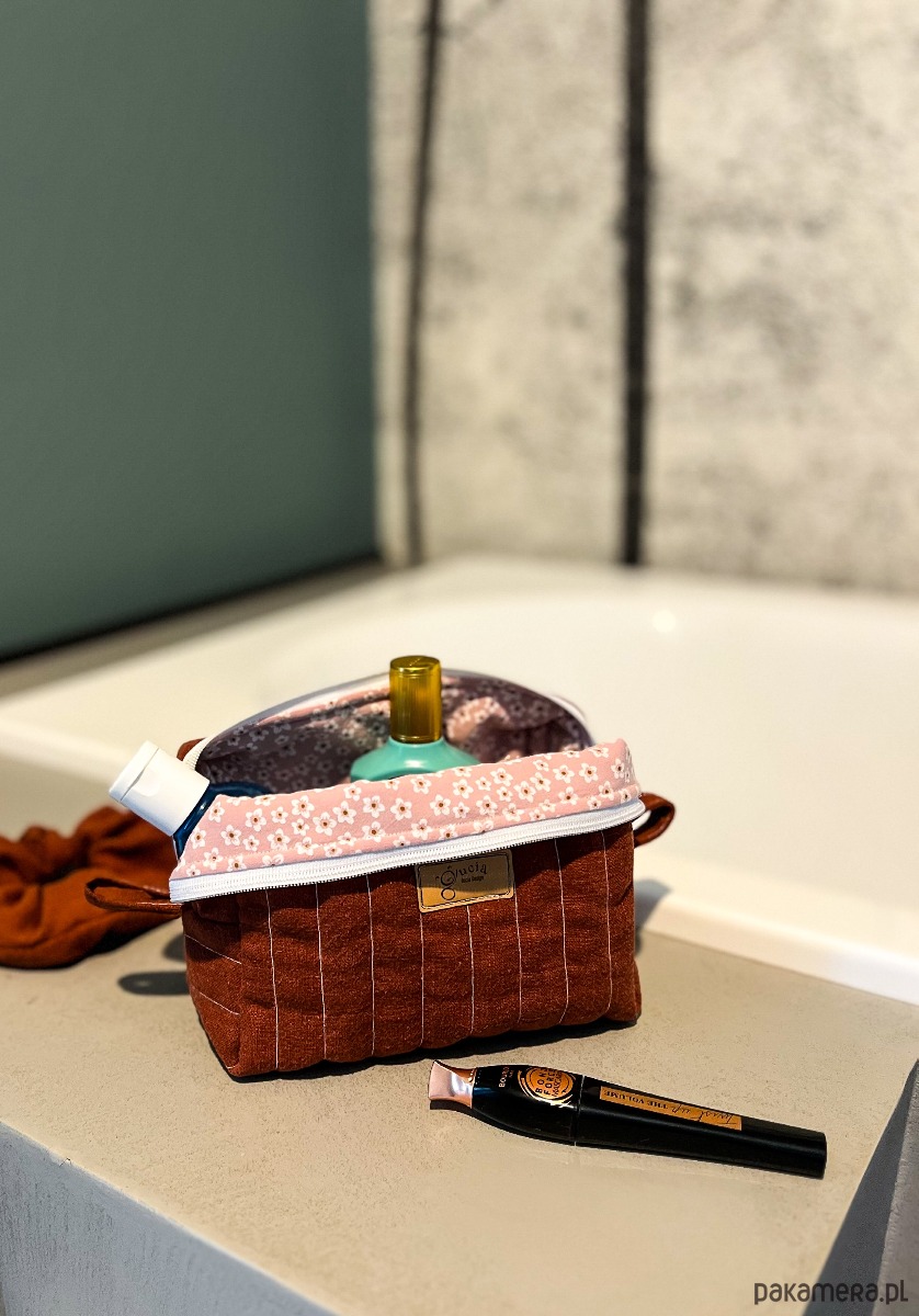 🌿 Lniana kosmetyczka box — bordowa, wykonana ręcznie z naturalnego lnu z bawełnianą , kwiatową podszewką, o wymiarach 17 × 11 × 8,5 cm. Zamykana na solidny zamek, zapewnia bezpieczne przechowywanie Twoich ulubionych kosmetyków i drobiazgów.