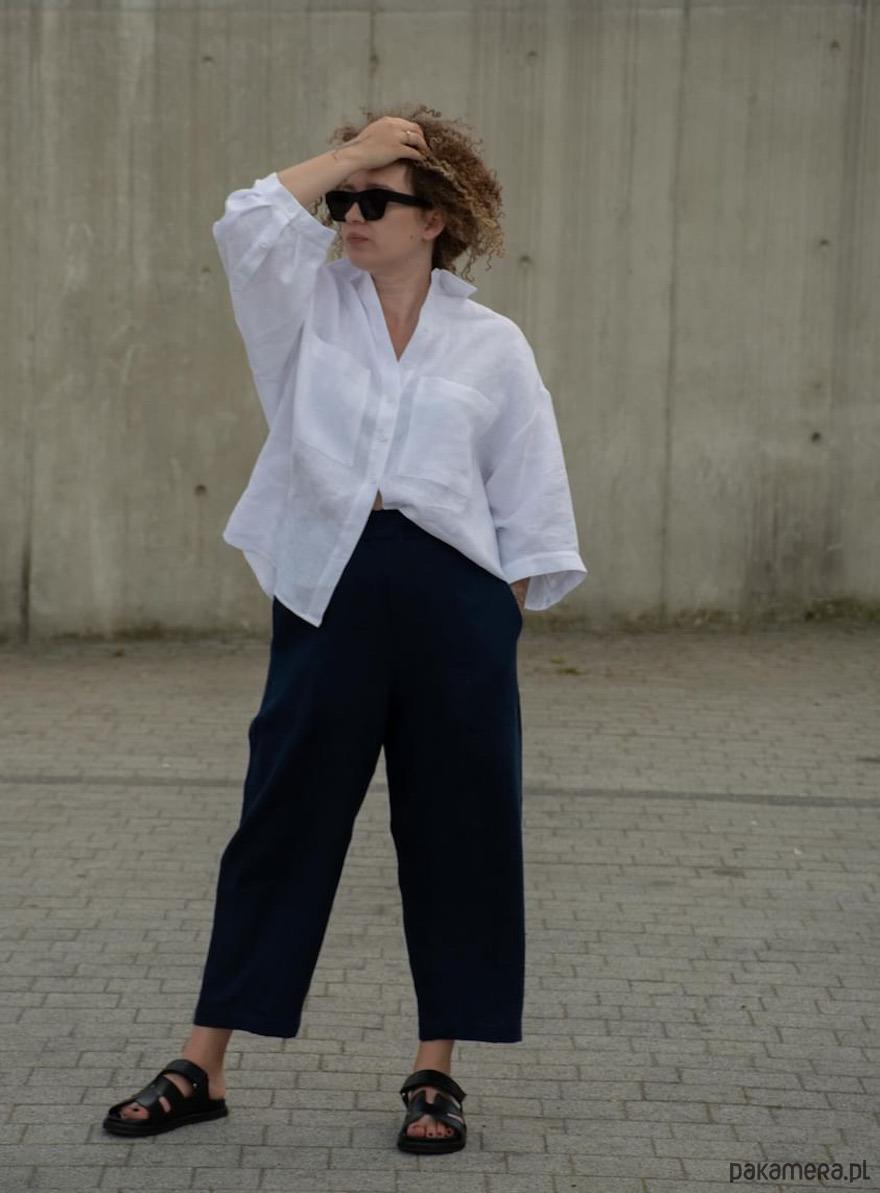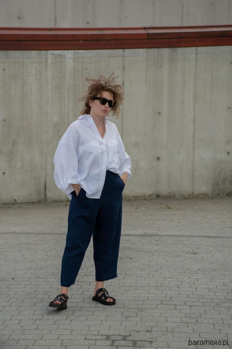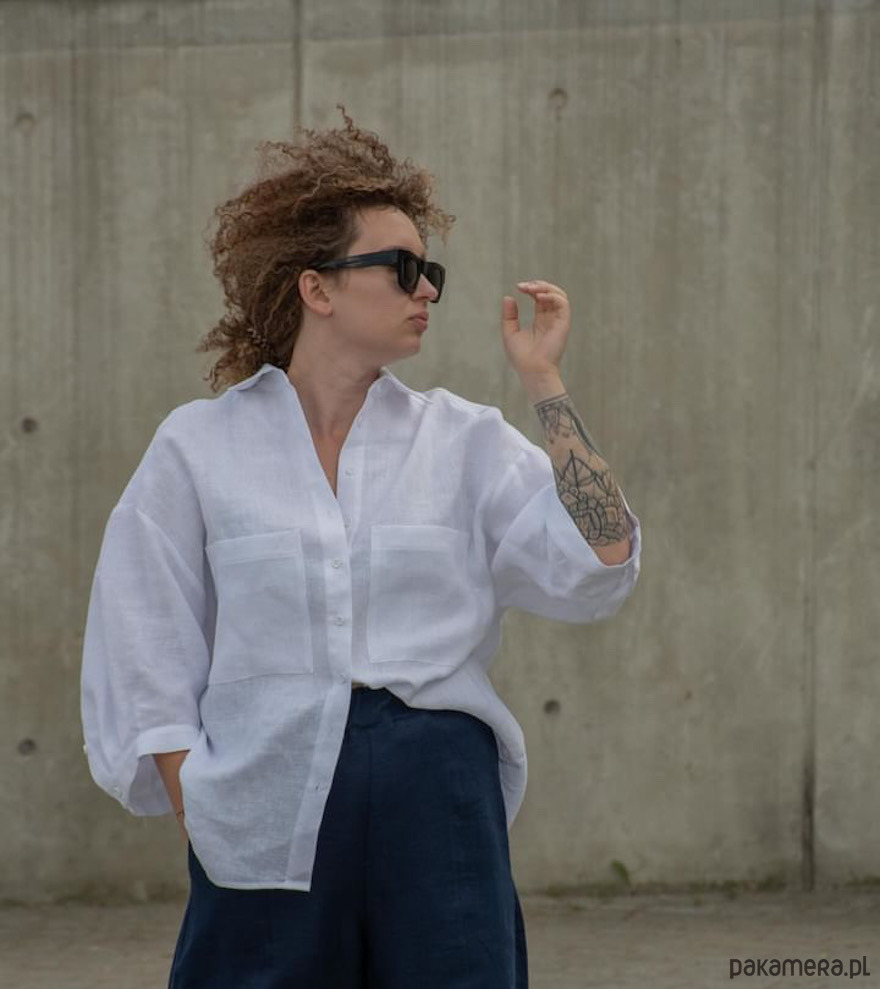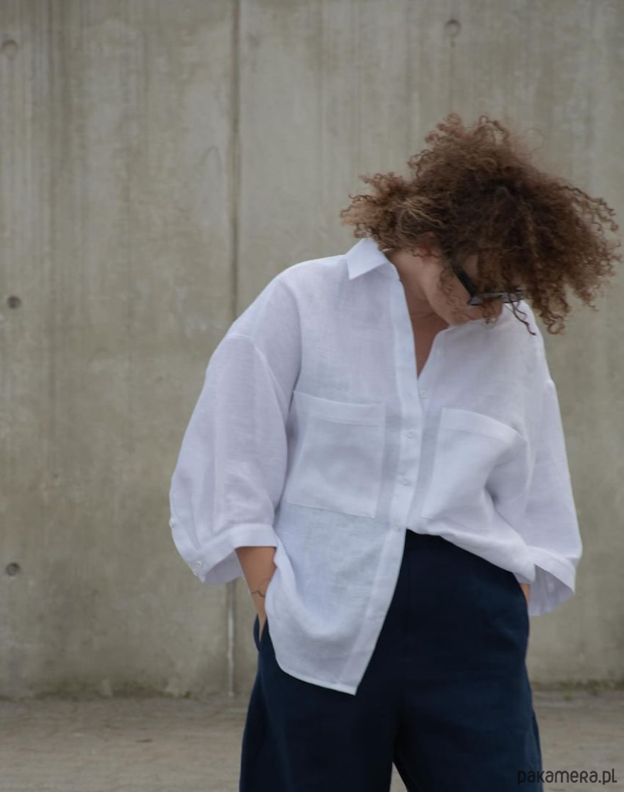 Lniana koszula MARIKO w kolorze białym. Koszula ma krój oversie z prostym wykończeniem na dole. Szerokie rękawy 7/8 wykończone są wąskimi mankietami zapinanymi na guziki. Z przodu dwie duże kieszenie dodają koszuli charakteru.