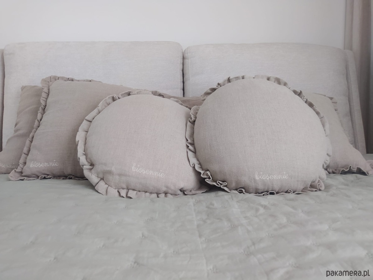 Lniane poduszki dekoracyjne Biosennie łączą w sobie naturalny komfort i elegancką formę. Wypełnione kapokiem – lekkim, antyalergicznym włóknem roślinnym – dopasowują się do kształtu ciała, zapewniając miękkie, ale stabilne podparcie. Każda poduszka uszyta jest z luksusowego lnu 100% w naturalnym, popielato–beżowym odcieniu. Dookoła biegnie lniana falbanka dekoracyjna, a z boku widnieje subtelny, bawełniany haft z logo marki. Grubość lnu sprawia, że tkanina jest przyjemna w dotyku i mniej podatna na gniecenie. Poduszki dostępne są w dwóch kształtach – kwadratowym i okrągłym – i powstają ręcznie w małych partiach u polskich krawców. To sprawia, że każdy egzemplarz jest unikatem. Idealne jako dekoracja kanapy, fotela czy łóżka, wprowadzają do wnętrza przytulność i harmonię – bez kompromisu w kwestii ekologii i jakości.