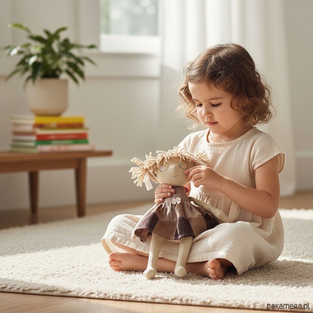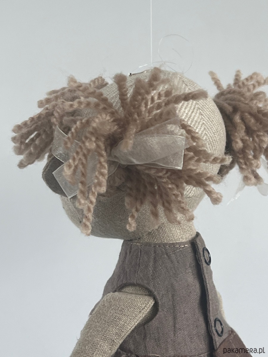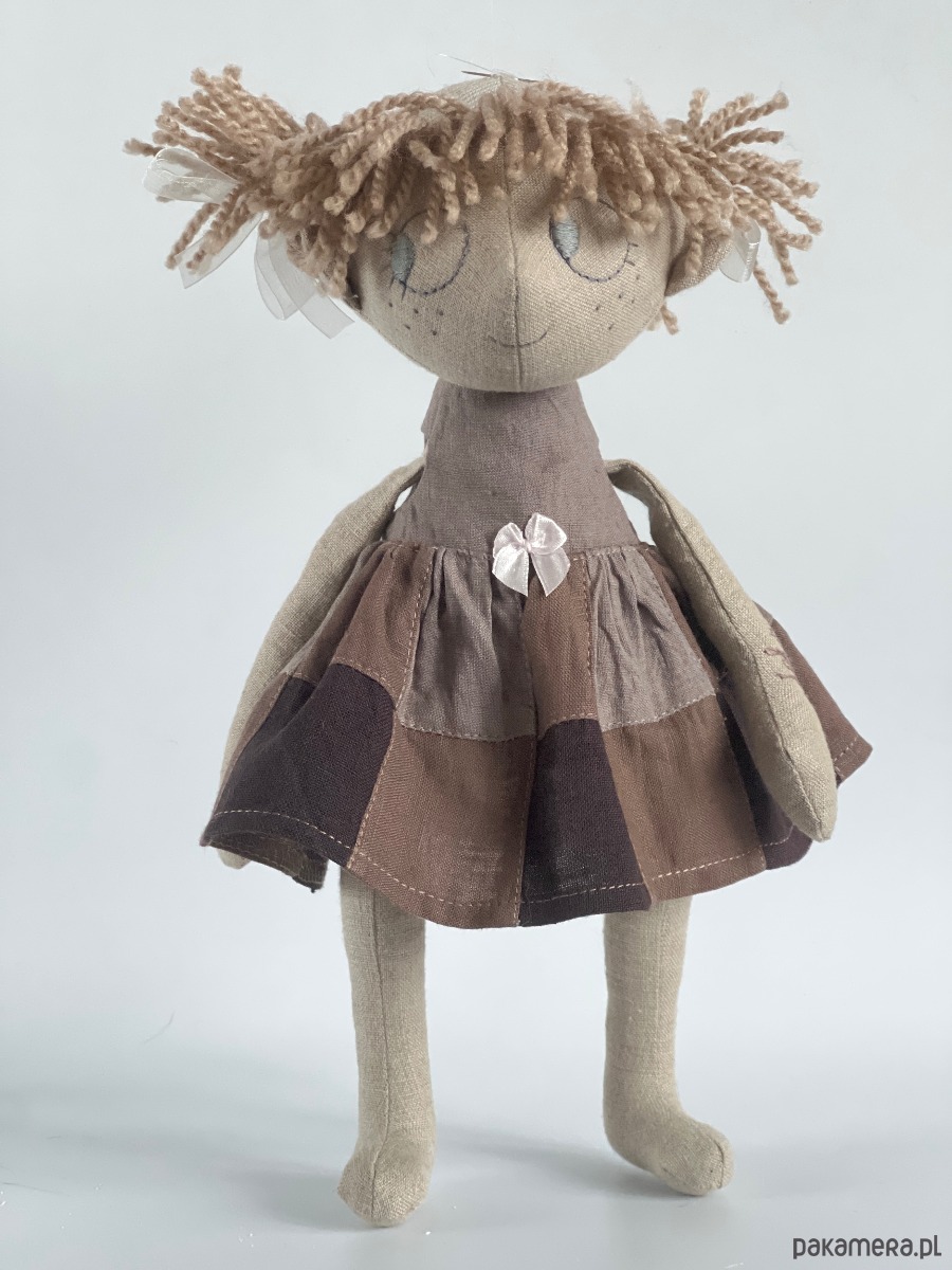 Oczywiście jeśli Ty zamówisz wyhaftuję imię wybrane przez Ciebie.Całą uszyłam z polskiego lnu 100% z certyfikatem OEKO TEX i wypchałam certyfikowanym silikonem , dlatego jest mięciutka i gotowa do przytulenia. Włosy zrobiłam z wełny a oczy i buzię wyhaftowałam bawełnianą nicią.