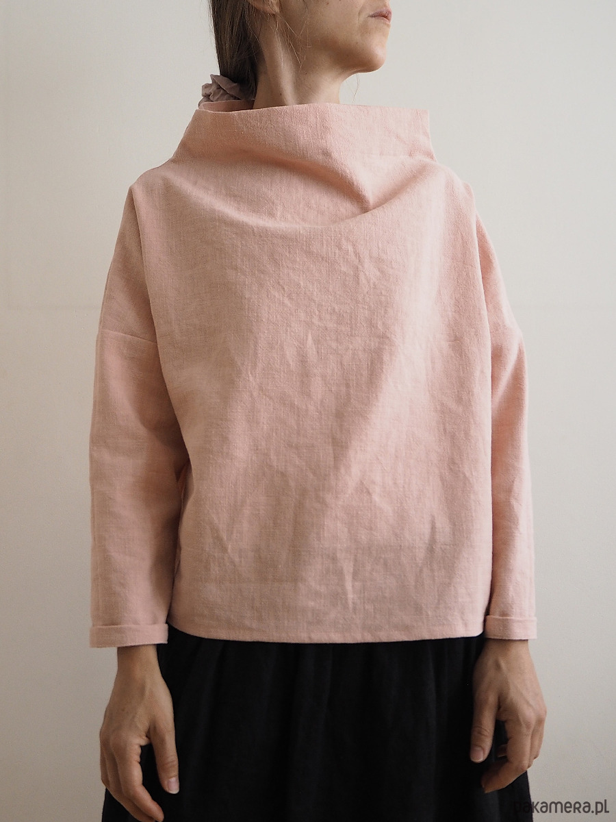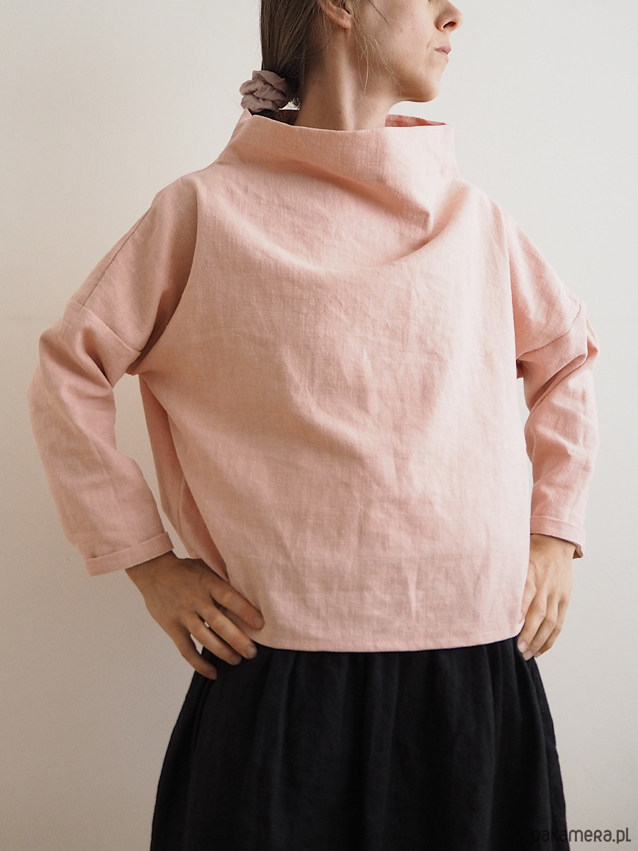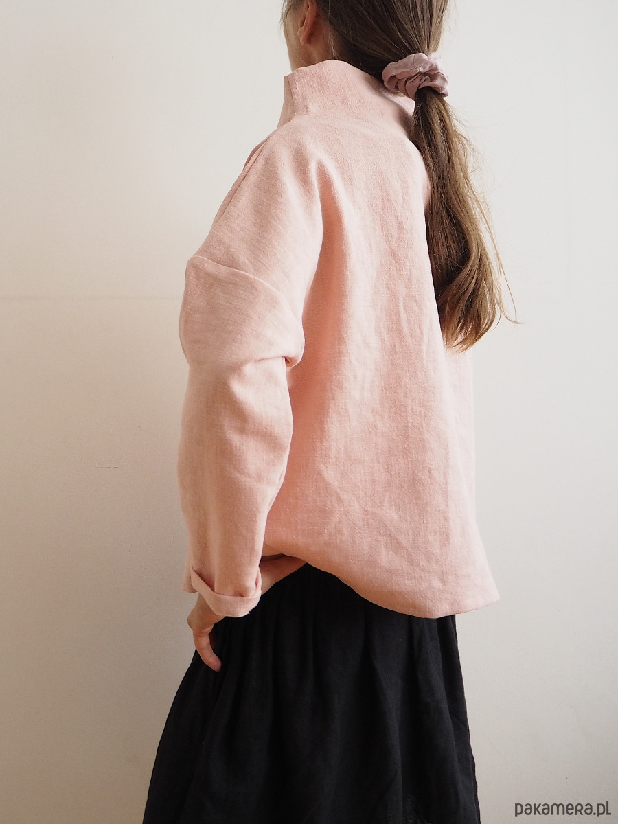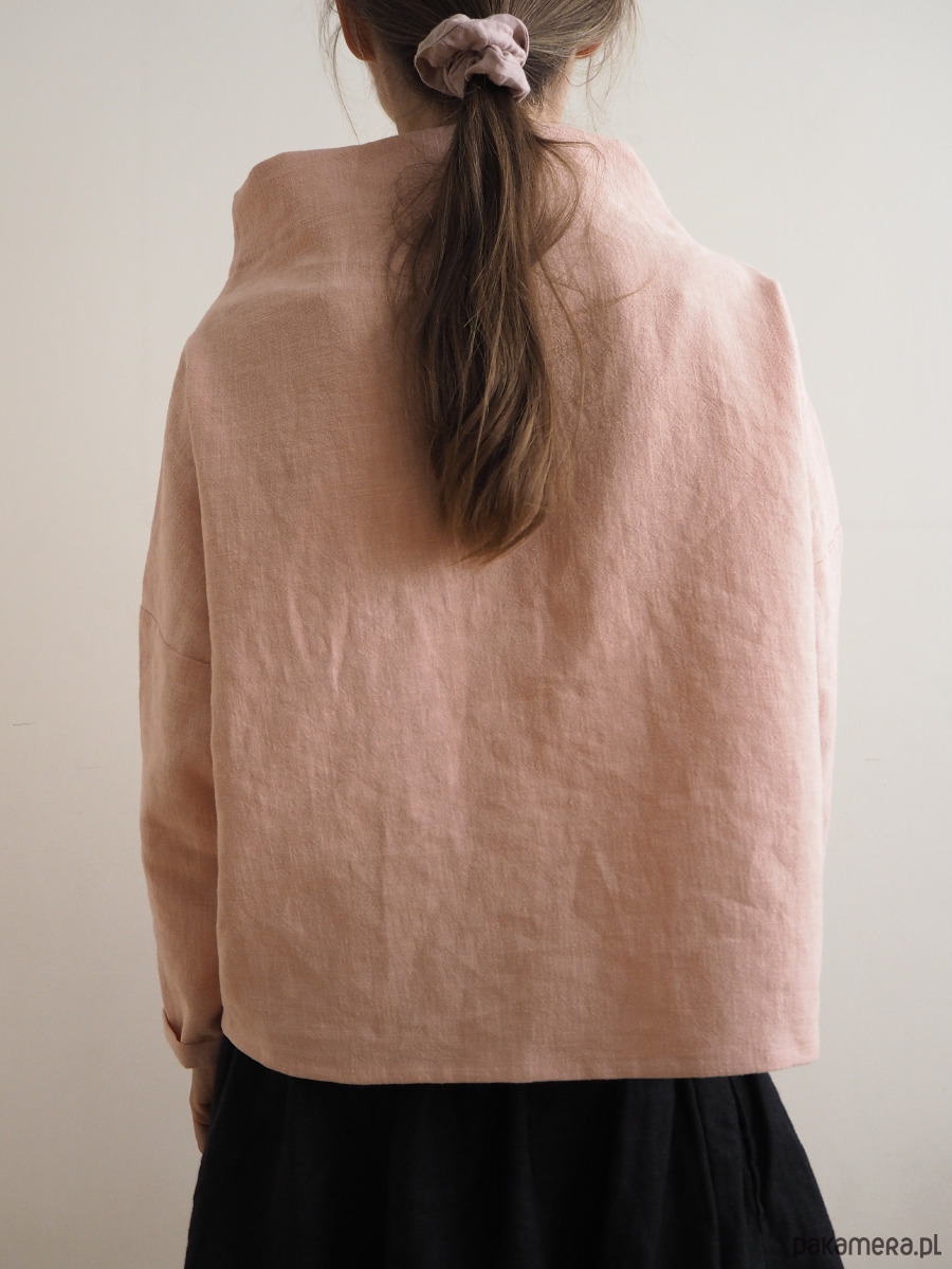 Bluza ma piękny łososiowy kolor, wykonana z stonewashed 100% len, jest wygodna, stylowa, krótka, szeroka, typu oversize.