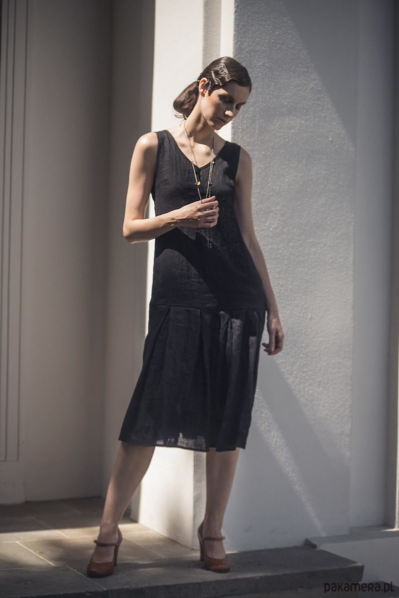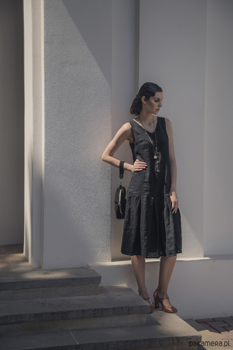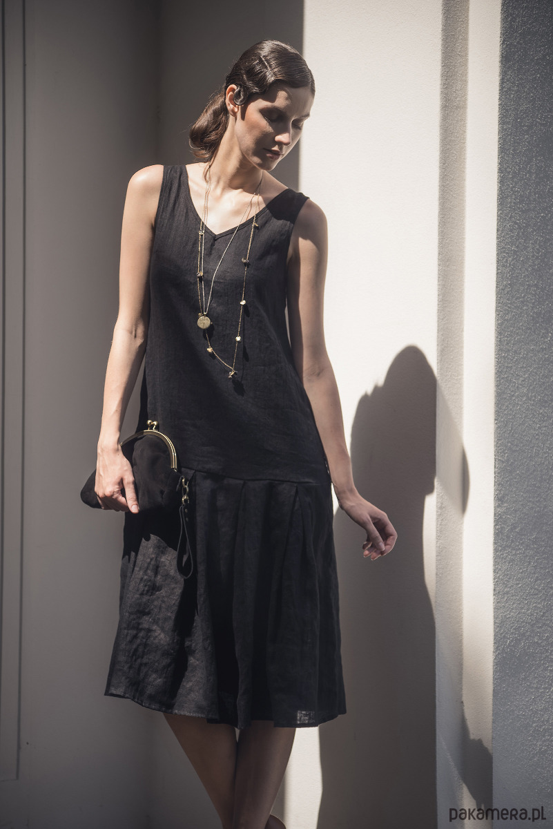 Sukienka stylizowana na lata 20-ste, z szeroką falbaną na dole. Sukienka jest uszyta z miękkiej w dotyku 100% tkaniny lnianej kreszowanej w kolorze czarnym.