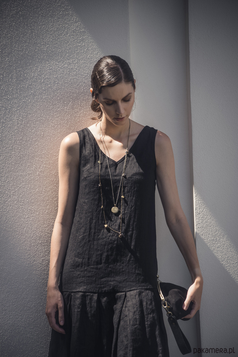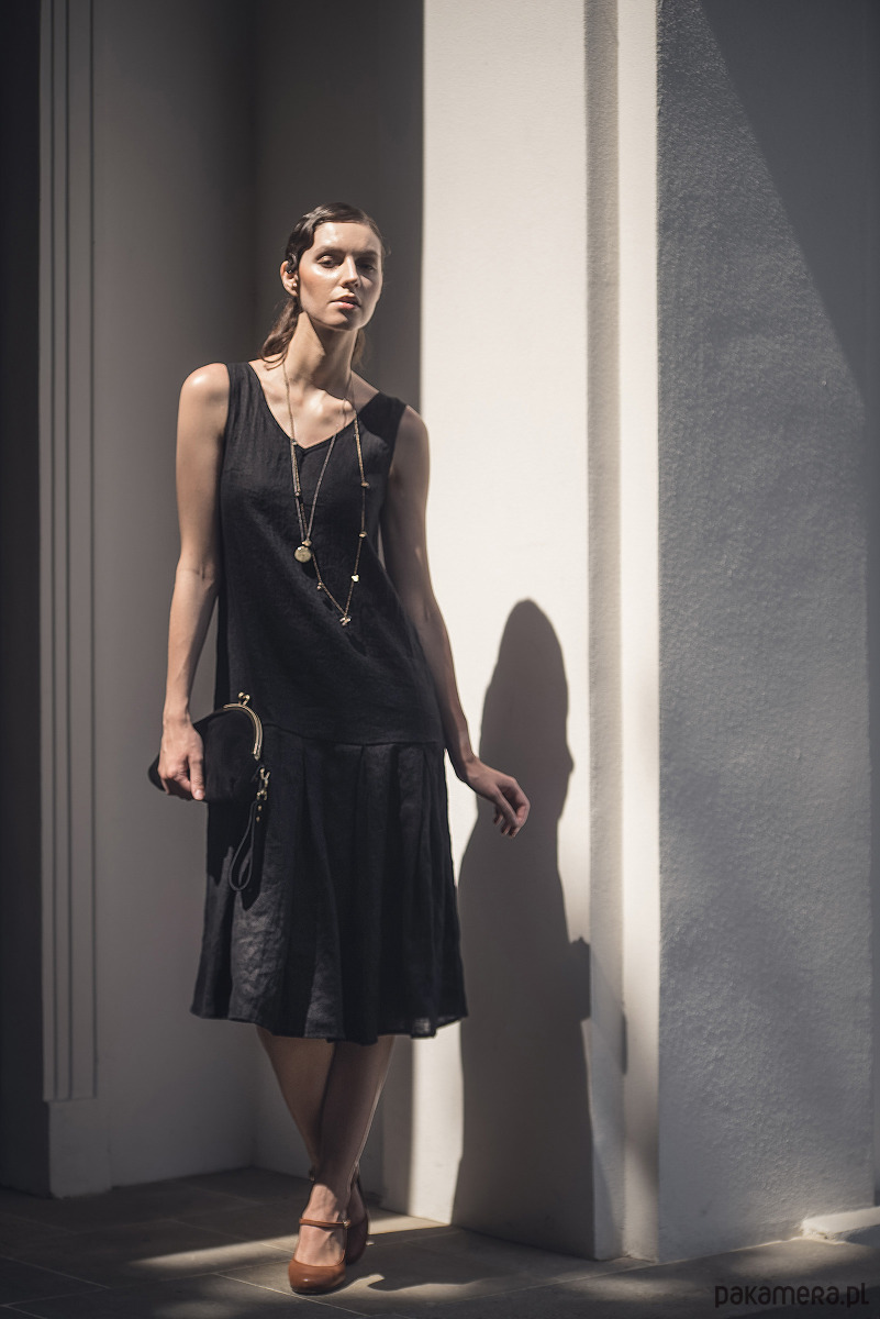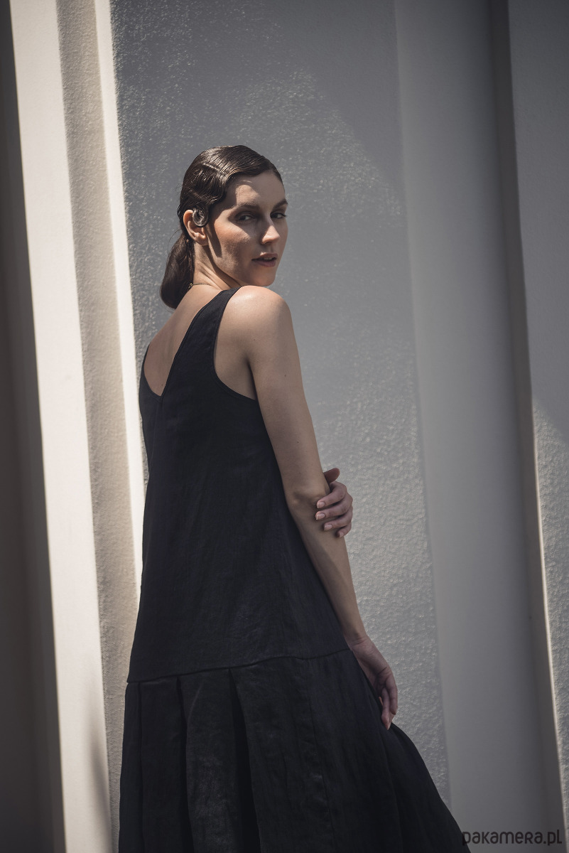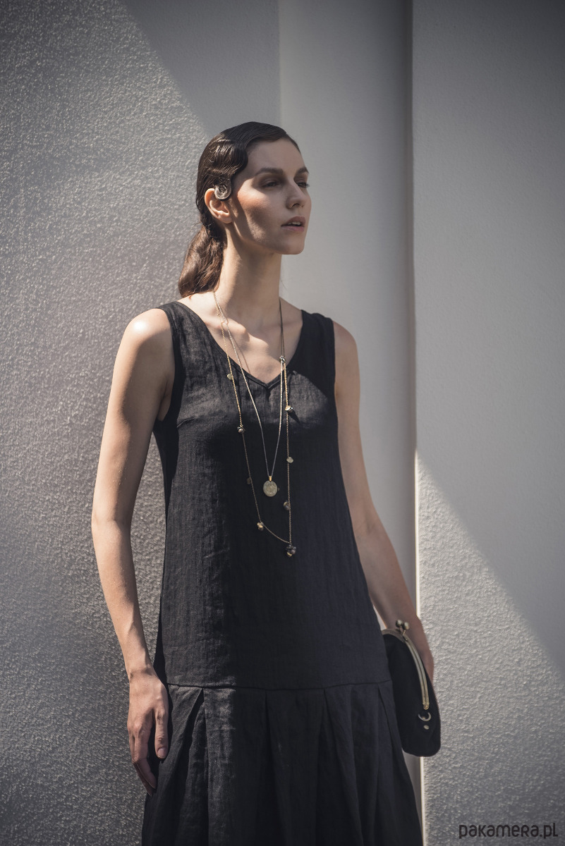 Sukienka stylizowana na lata 20-ste, z szeroką falbaną na dole. Sukienka jest uszyta z miękkiej w dotyku 100% tkaniny lnianej kreszowanej w kolorze czarnym.