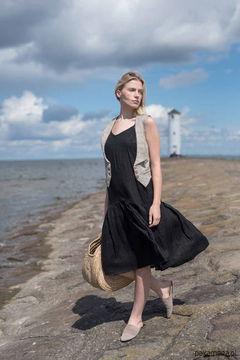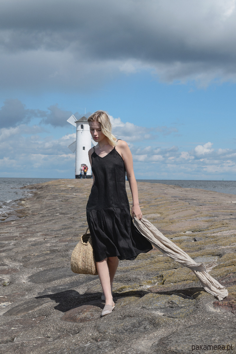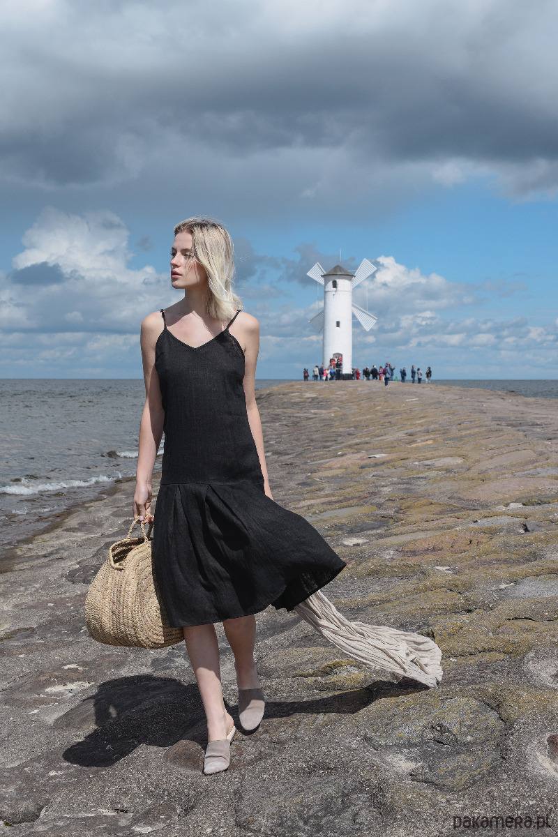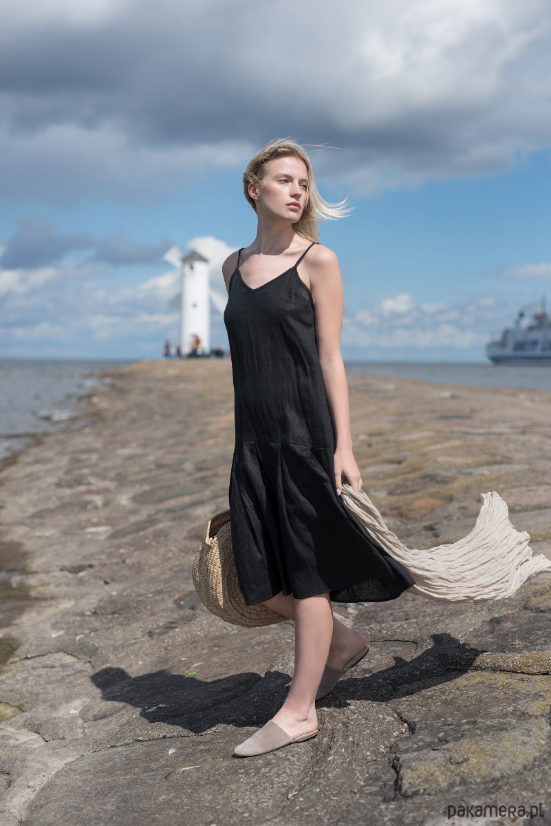 Sukienka na regulowanych ramiączkach, z szeroką falbaną na dole. Sukienka jest uszyta z miękkiej w dotyku 100% tkaniny lnianej w kolorze czarnym