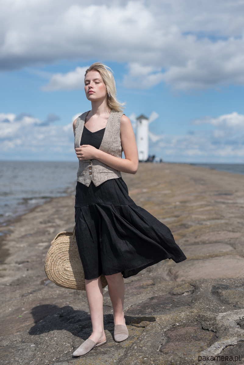 Lniana midi z falbaną czarna