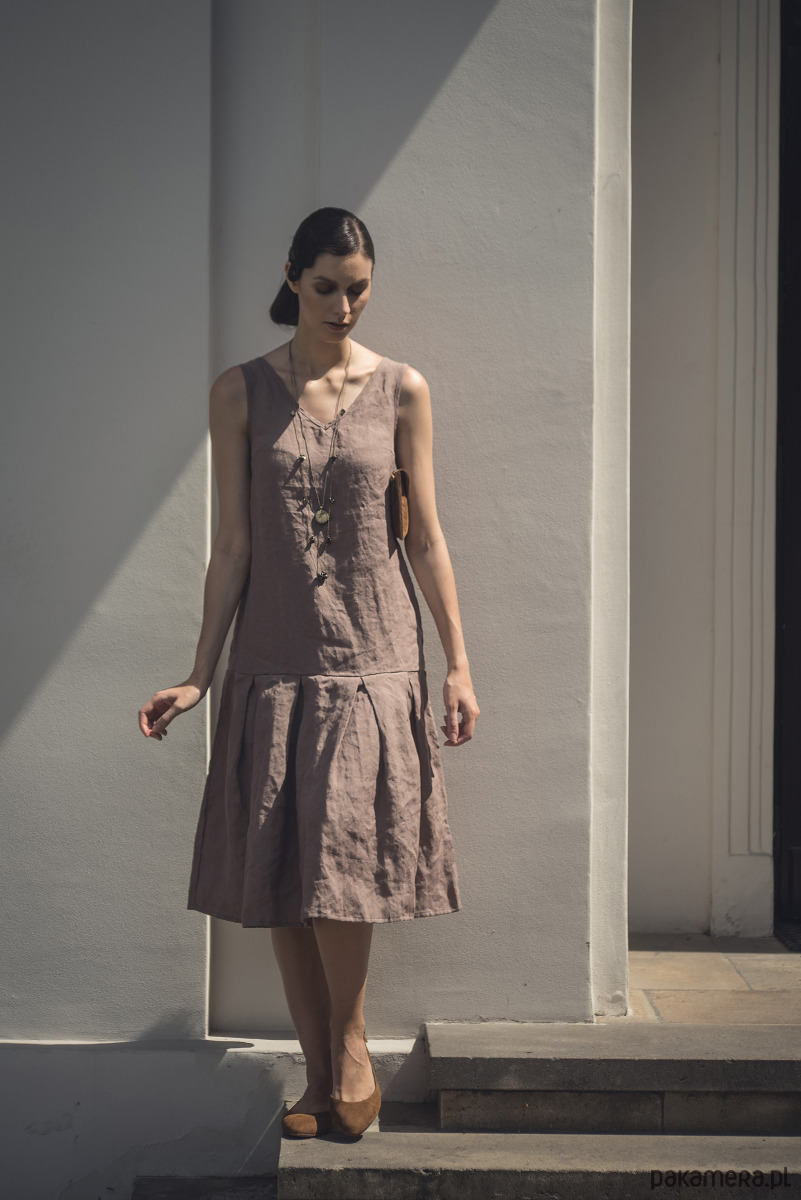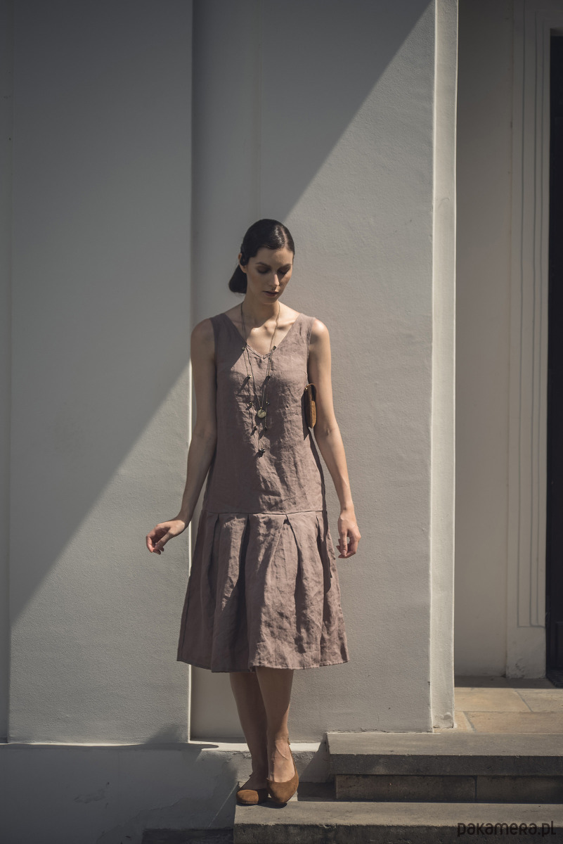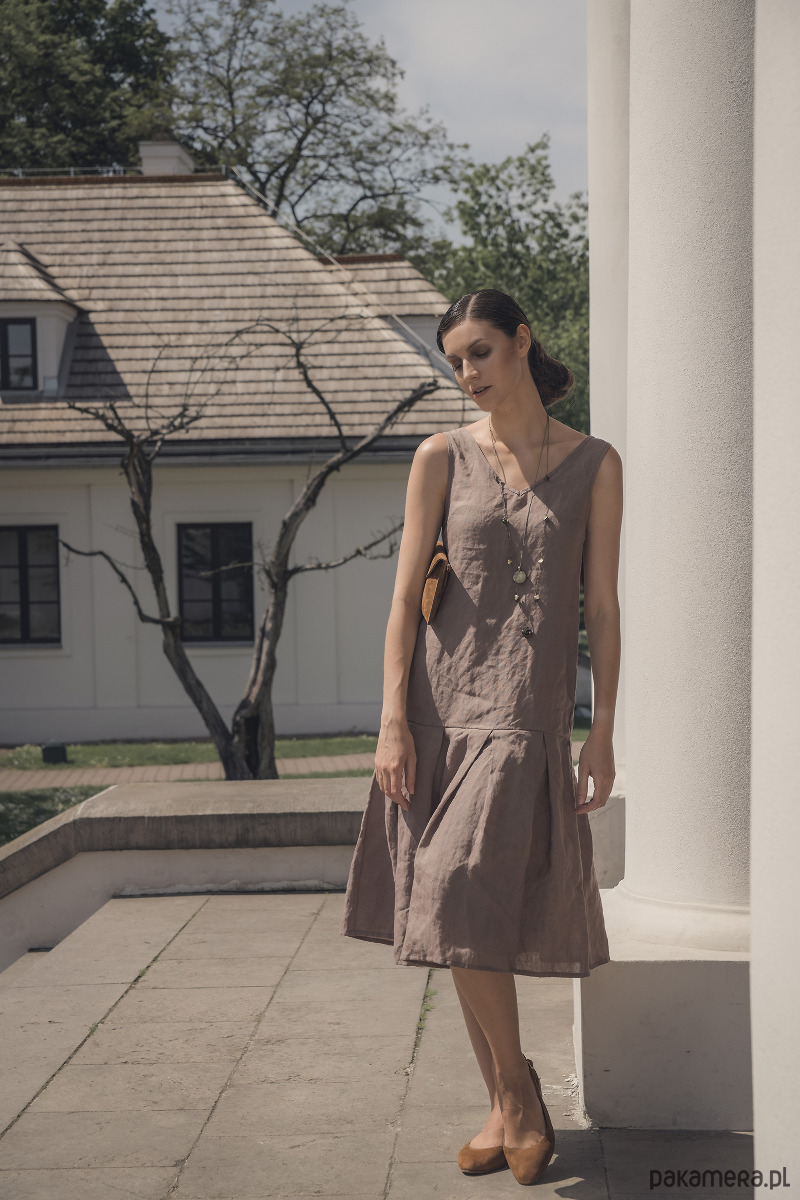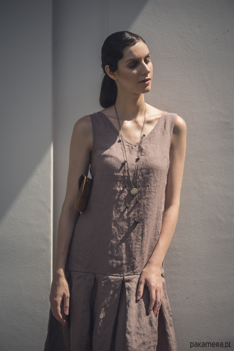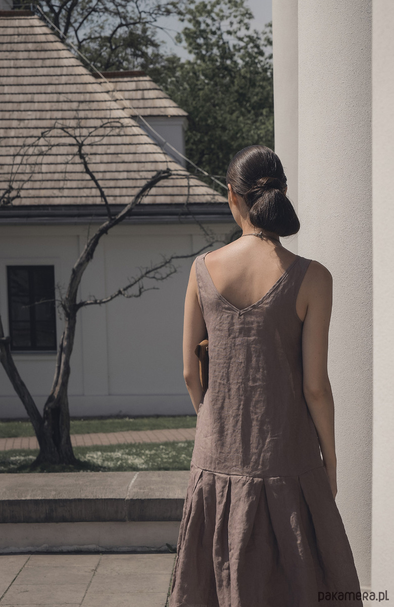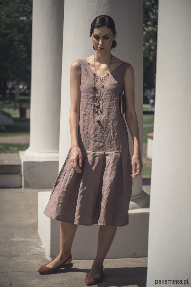 Sukienka stylizowana na lata 20-ste, z szeroką falbaną na dole. Sukienka jest uszyta z miękkiej w dotyku 100% tkaniny lnianej kreszowanej w kolorze mlecznej czekolady.