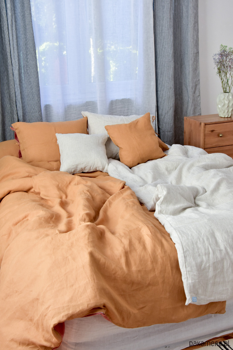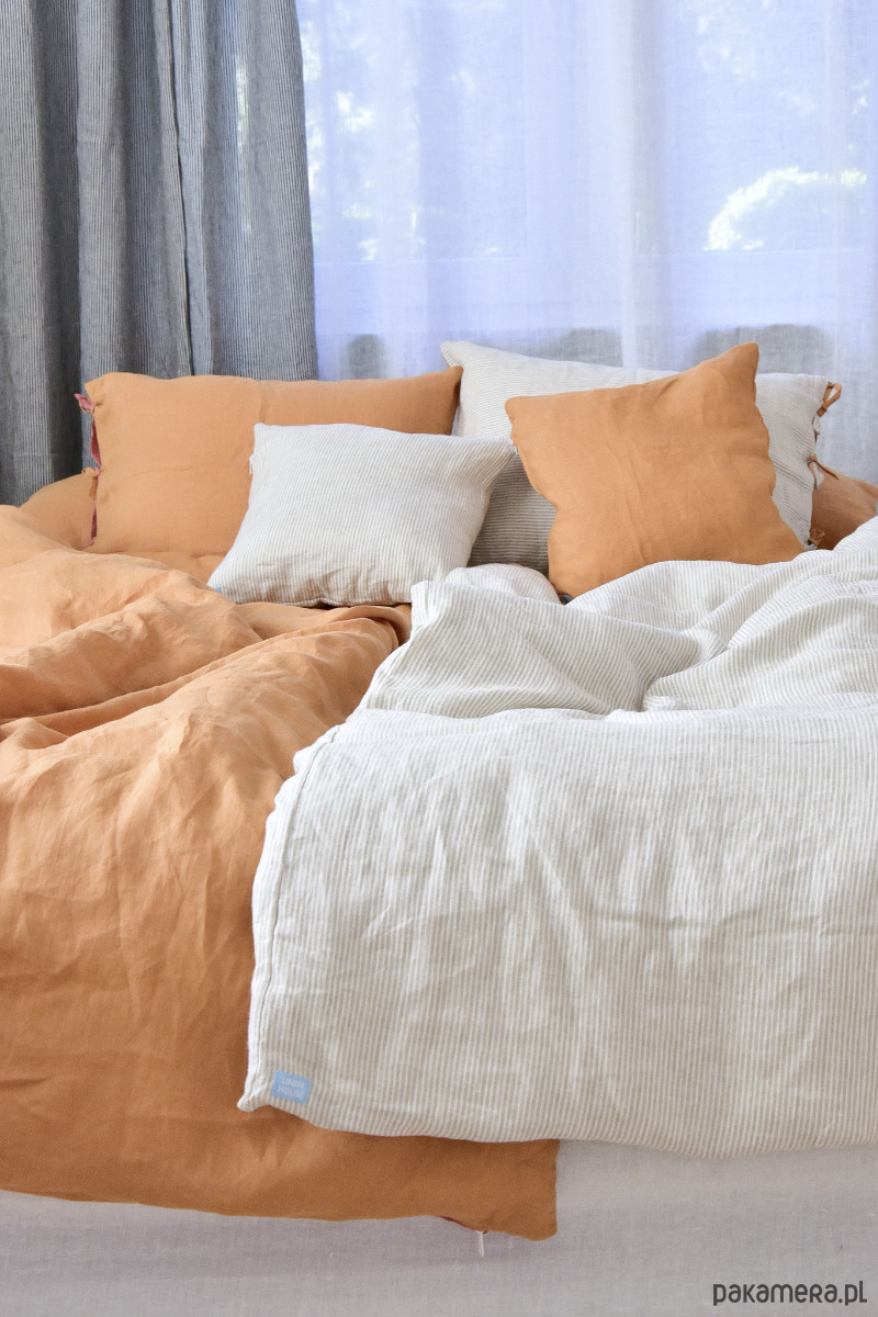 Dwukolorowa lniana poszewka na poduszkę to idealne rozwiązanie dla osób, które nie lubią, gdy w sypialni wieje nudą. Daj się ponieść kreatywności i wybierz np. połączenie karmelowego z tkaniną w jasne paski. Sprawdź, jak dwustronna poduszka prezentuje się na naszych zdjęciach.