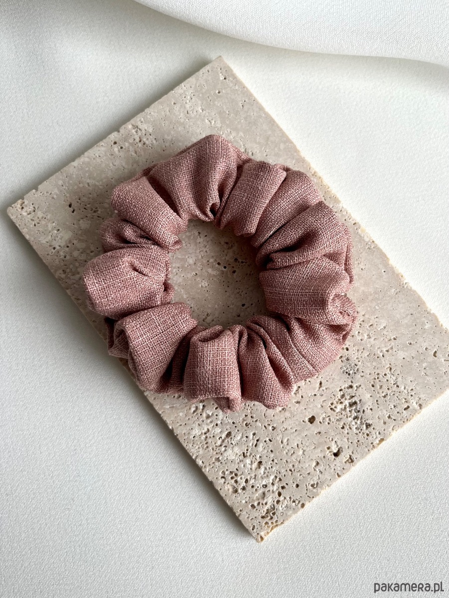 Urocza lniana scrunchie Andrea w delikaynym odcieniu różu z uszkami to połączenie delikatności, funkcjonalności i wyjątkowego uroku.