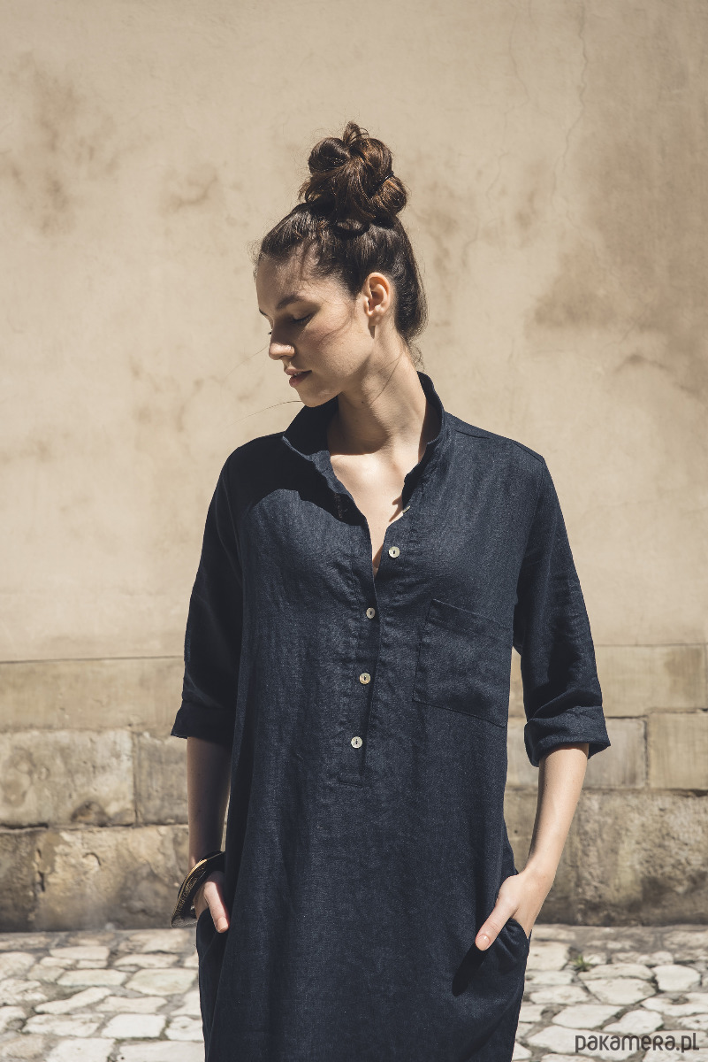 Sukienka koszulowa dostępna w rozmiarze S i M, uszyta jest z przyjemnej w dotyku, zmiękczanej tkaniny lnianej w kolorze granatowym. Na jednym boku znajduje się rozcięcie ~35cm. Przód zapinany jest na guziczki z masy perłowej, na bokach są kieszenie.