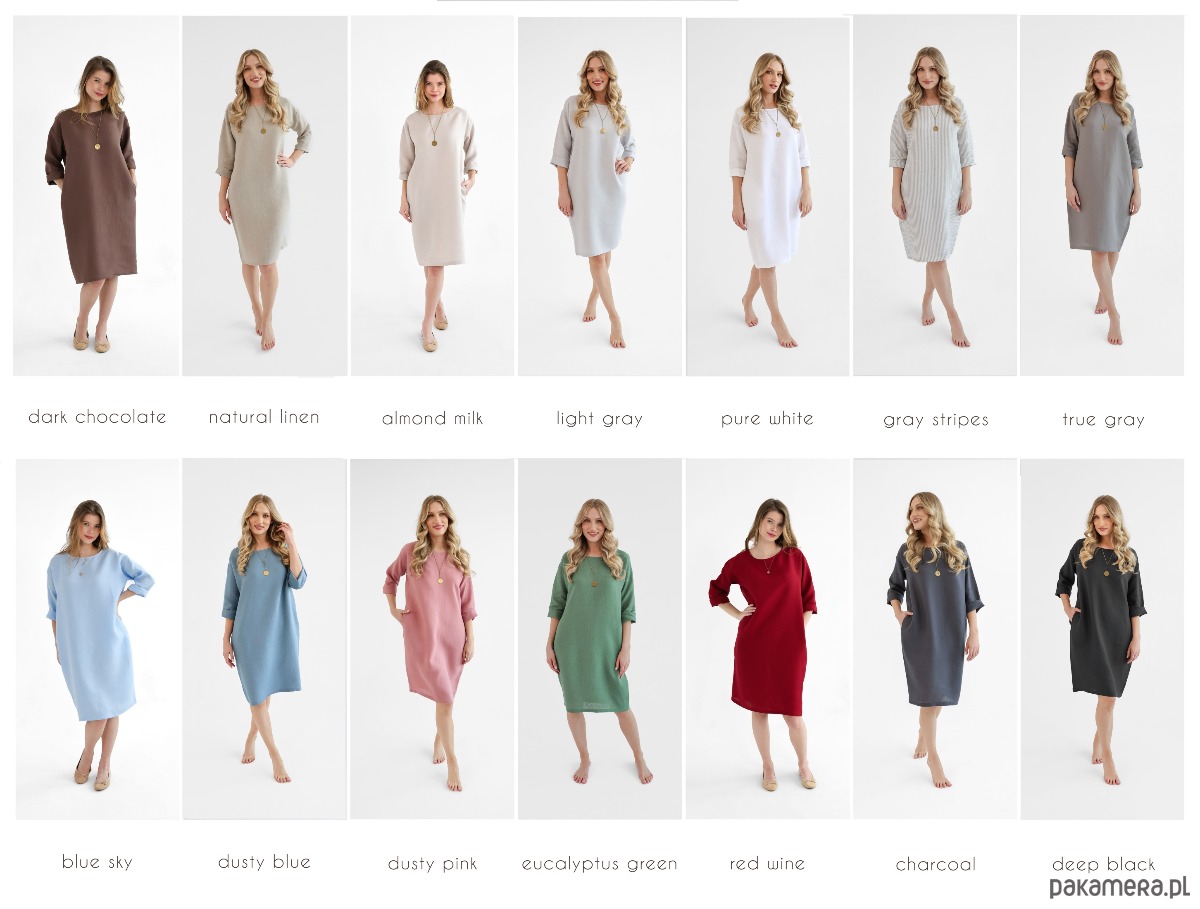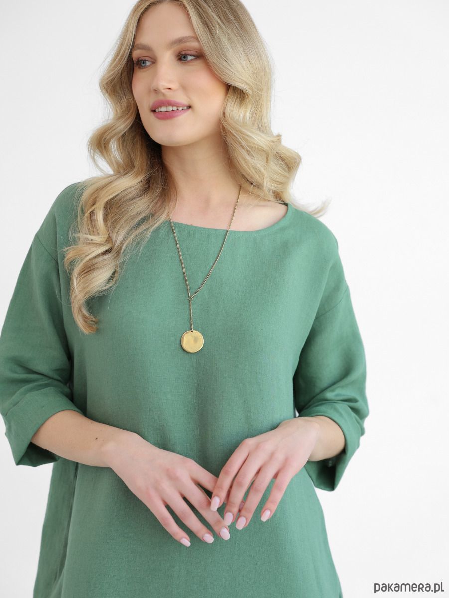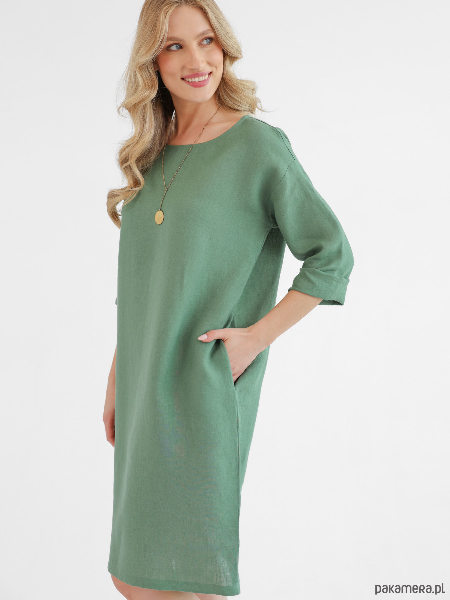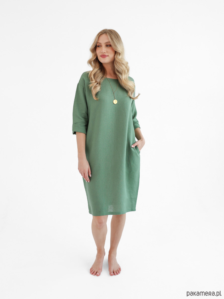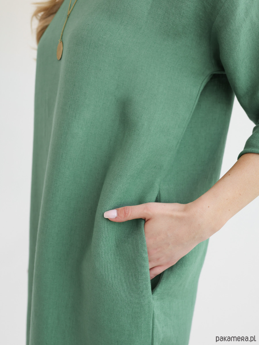 Lniana sukienka oversize, uszyta z miękkiego i naturalnego lnu typu stonewashed. Można nosić ją dodając pasek podkreślający talię lub bez paska jeśli preferujemy swobodne, luźne kroje. Rękawy można dowolnie podwinąć regulując w ten sposób ich długość. Sukienka posiada praktyczne i wygodne kieszenie.