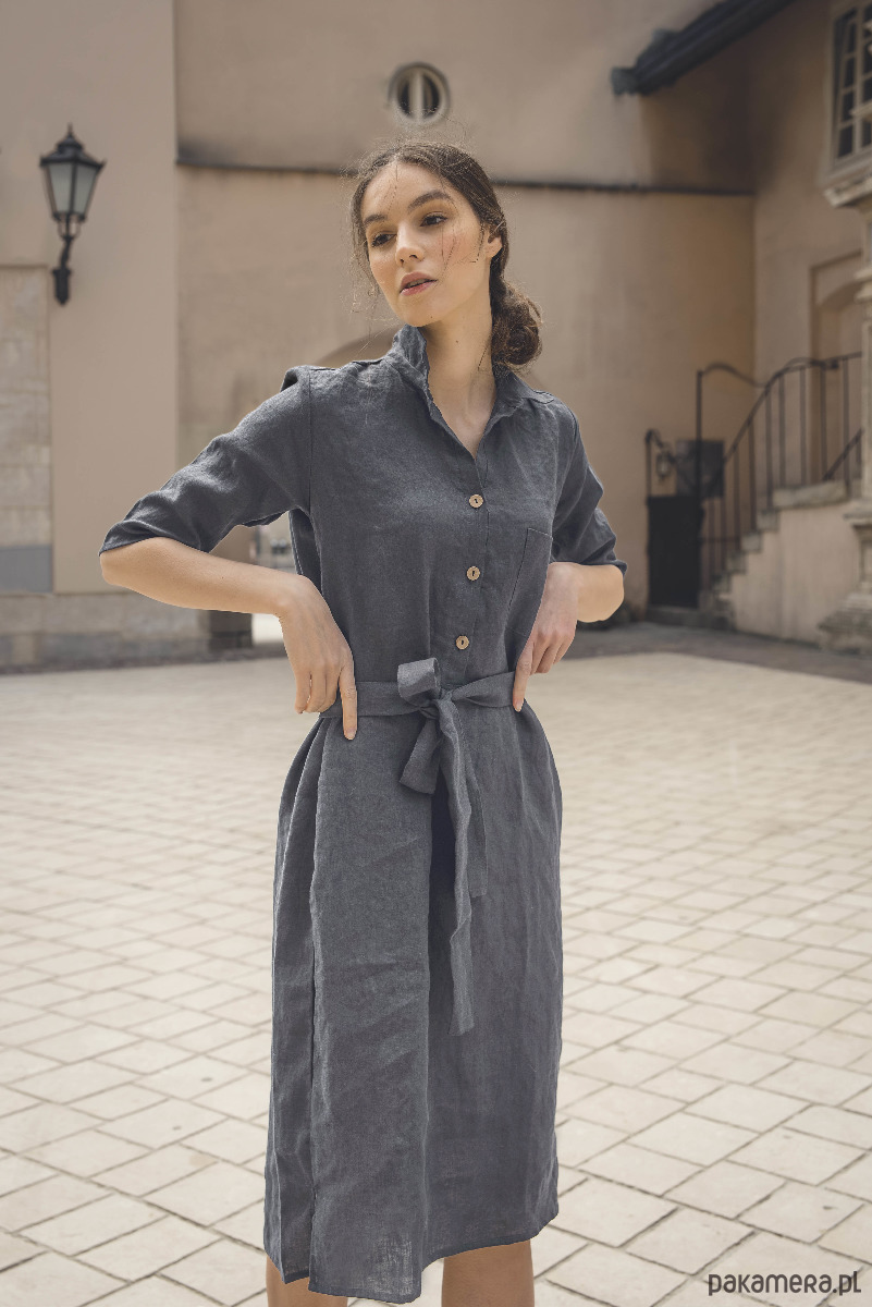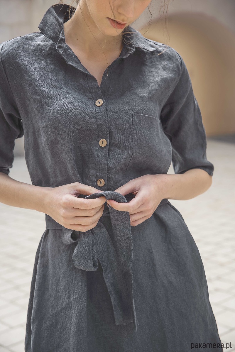 Lniana sukienka szmizjerka w kolorze grafitowym, dostępna w rozmiarze S i M, uszyta jest z przyjemnej w dotyku, zmiękczanej tkaniny lnianej, z przodu zapinana na 3 guziczki kokosowe, wiązana paskiem.
