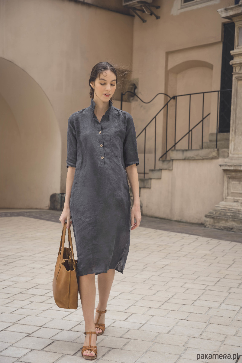 Lniana sukienka szmizjerka w kolorze grafitowym, dostępna w rozmiarze S i M, uszyta jest z przyjemnej w dotyku, zmiękczanej tkaniny lnianej, z przodu zapinana na 3 guziczki kokosowe, wiązana paskiem.