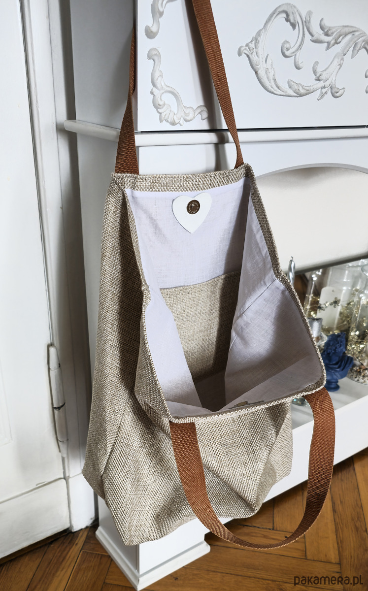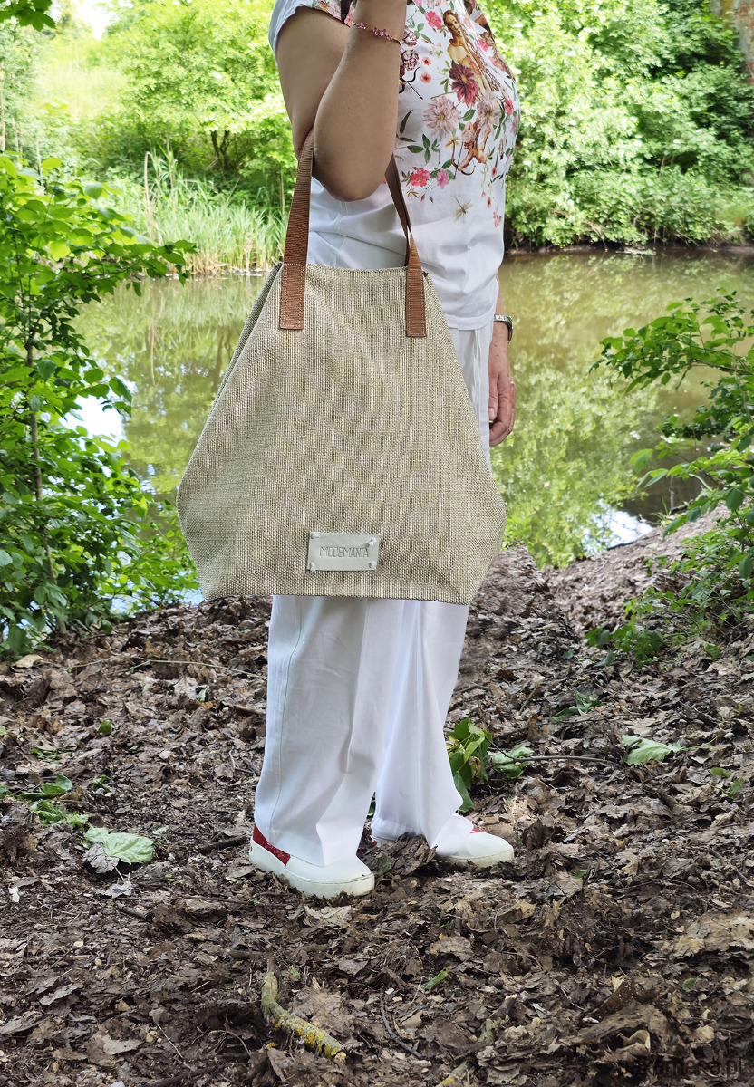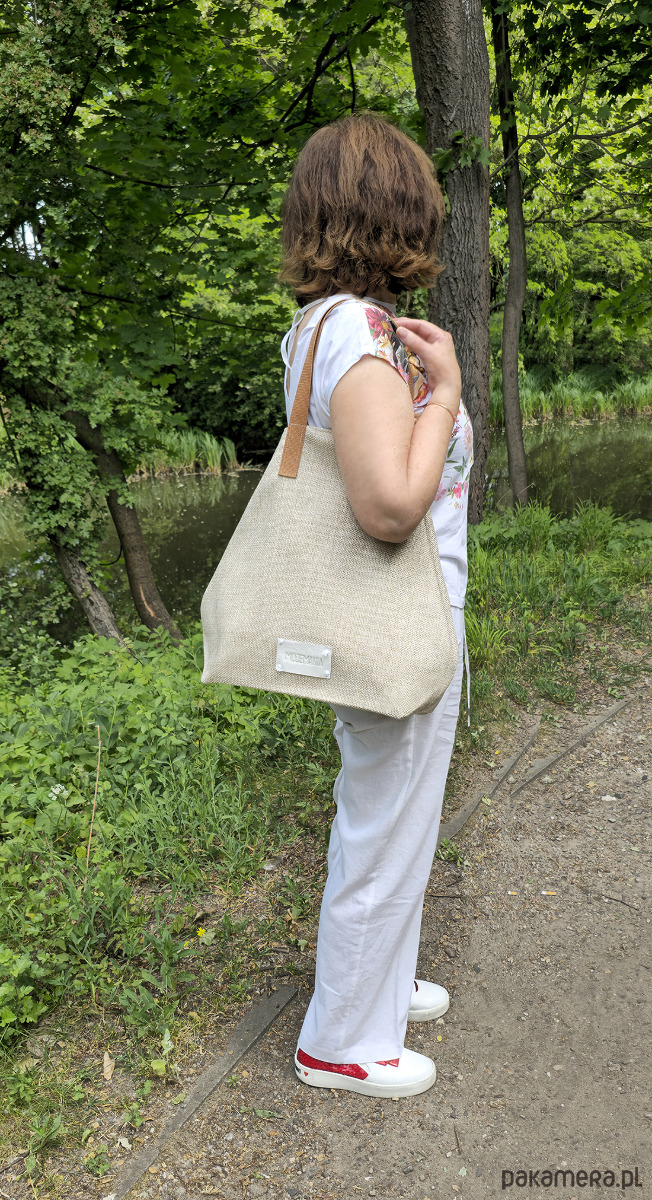 Składane boki do wewnątrz powodują, że torebka zyskuje formę trójkątną, po ich rozłożeniu otrzymujemy obszerną torbę, idealną na zakupy.
