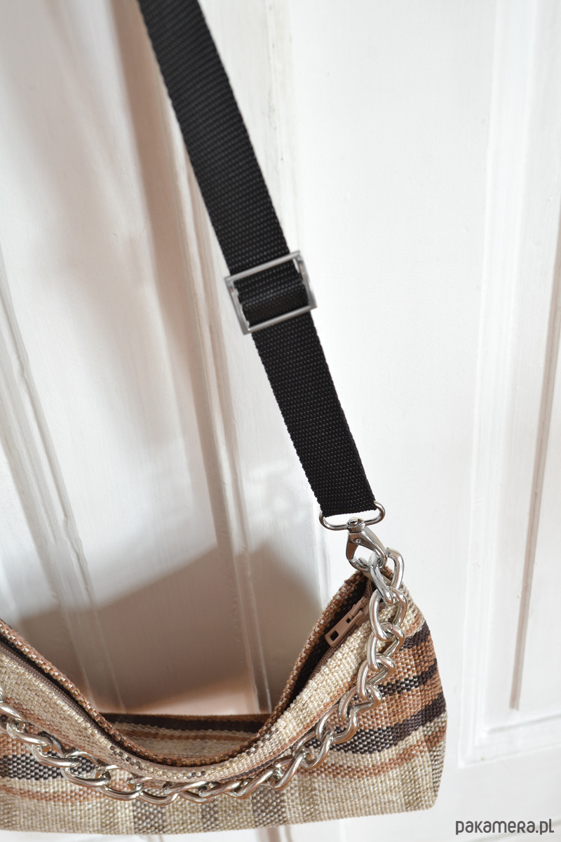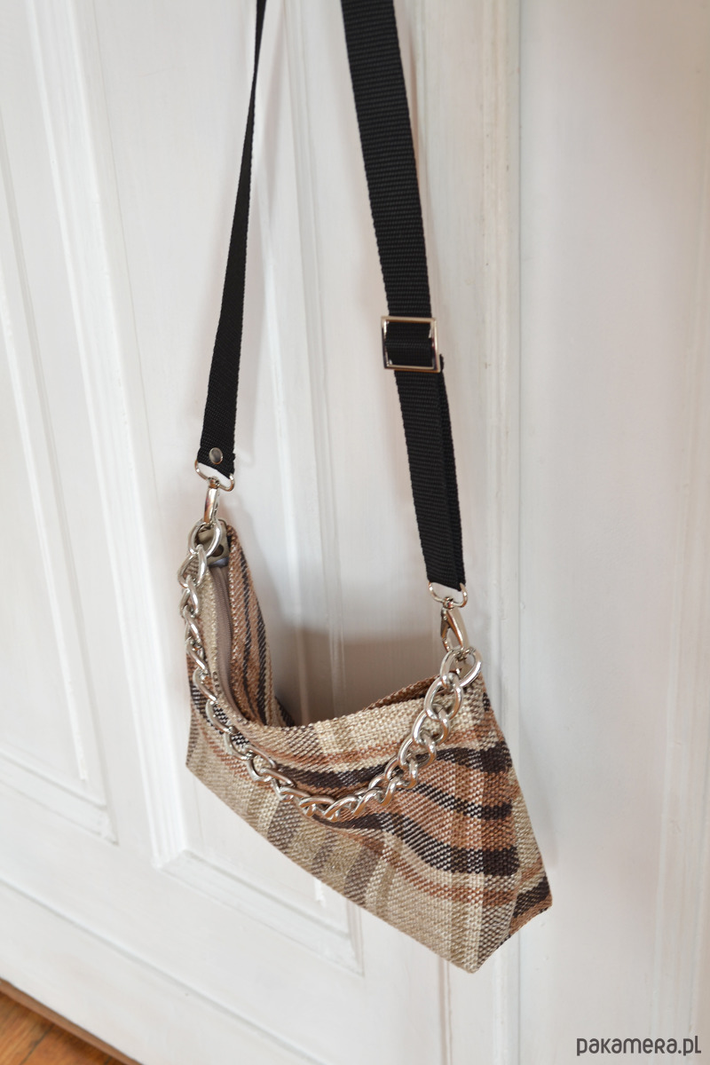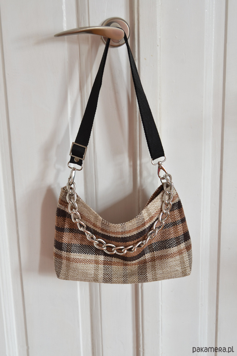 Torebka wykonana z grubo tkanego lnu w odcieniach piasku i brązów.