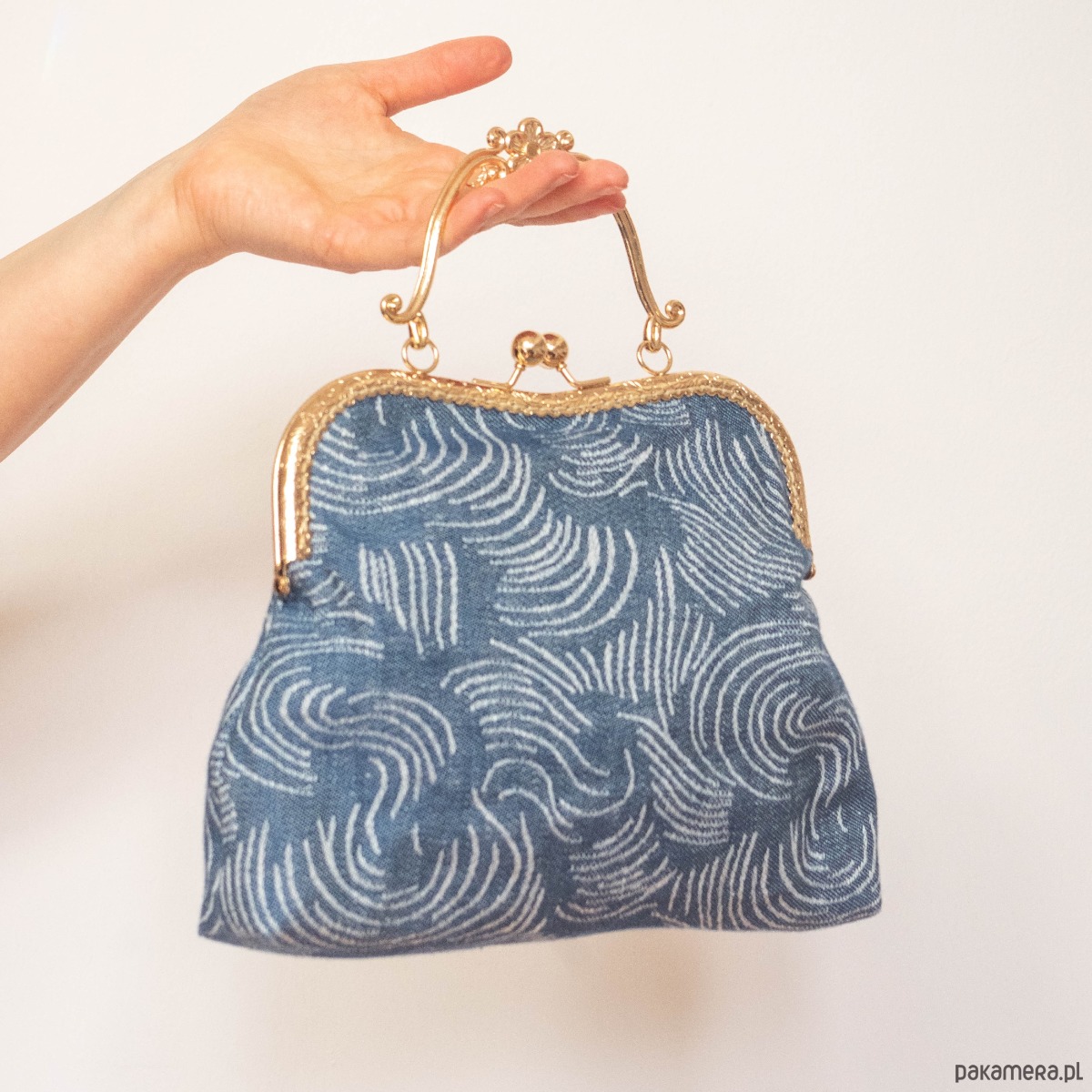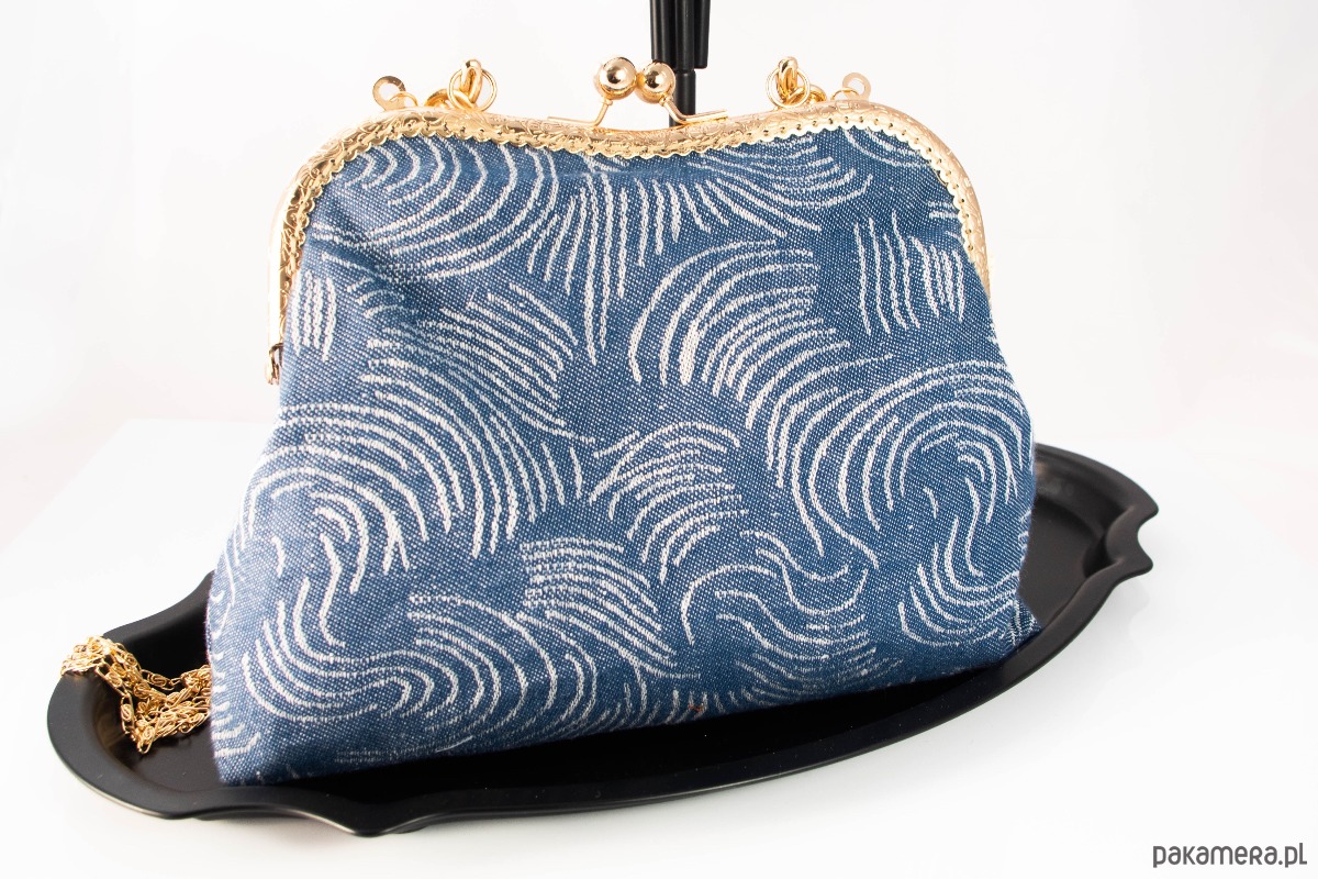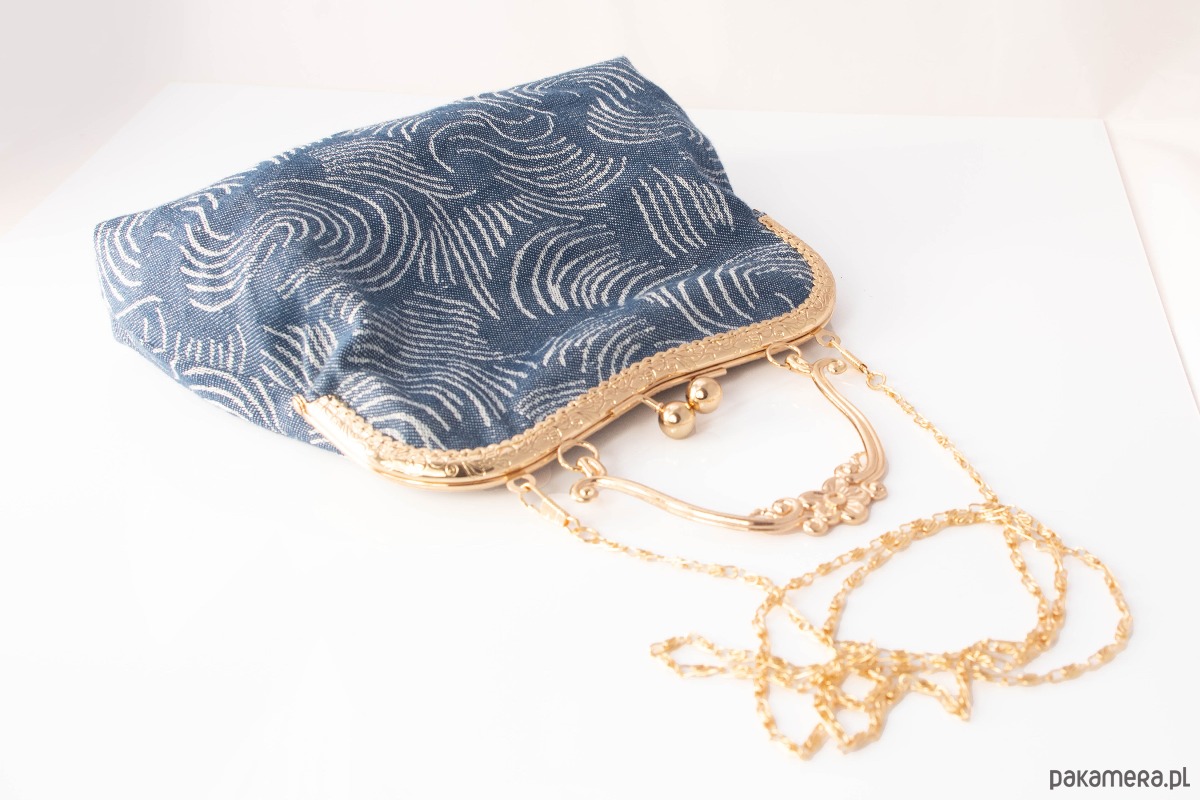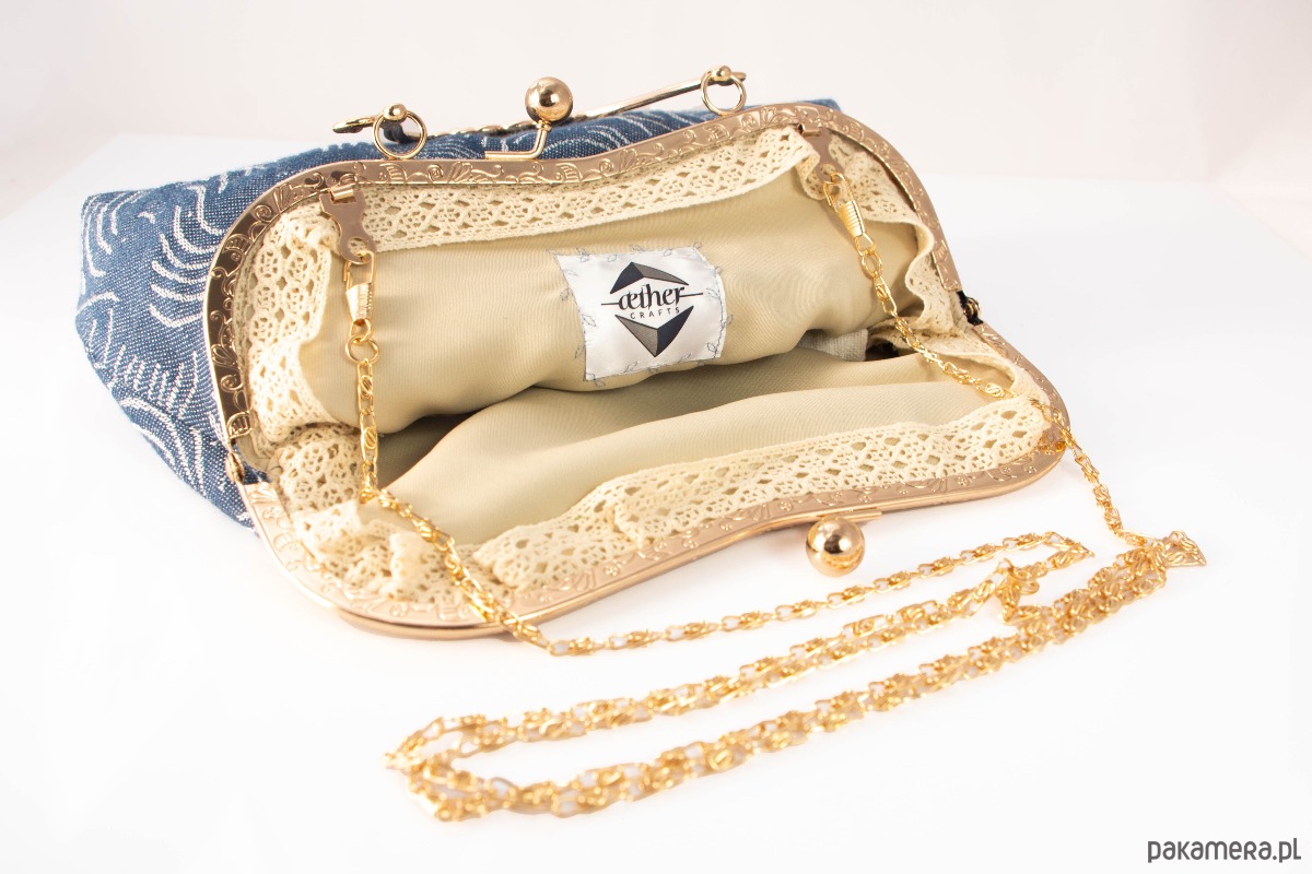 Torebka w kolorze niebieskim, na kremowej podszewce. Zapięcie jest wszyte ręcznie (nie ma niebezpieczeństwa, że się odczepi od tkaniny). Po wewnętrznej stronie szycie wykończone kremową koronką. Zapięcie i łańcuszek wykonane z metalu w kolorze złota. Łańcuszek można odczepić lub wymienić.