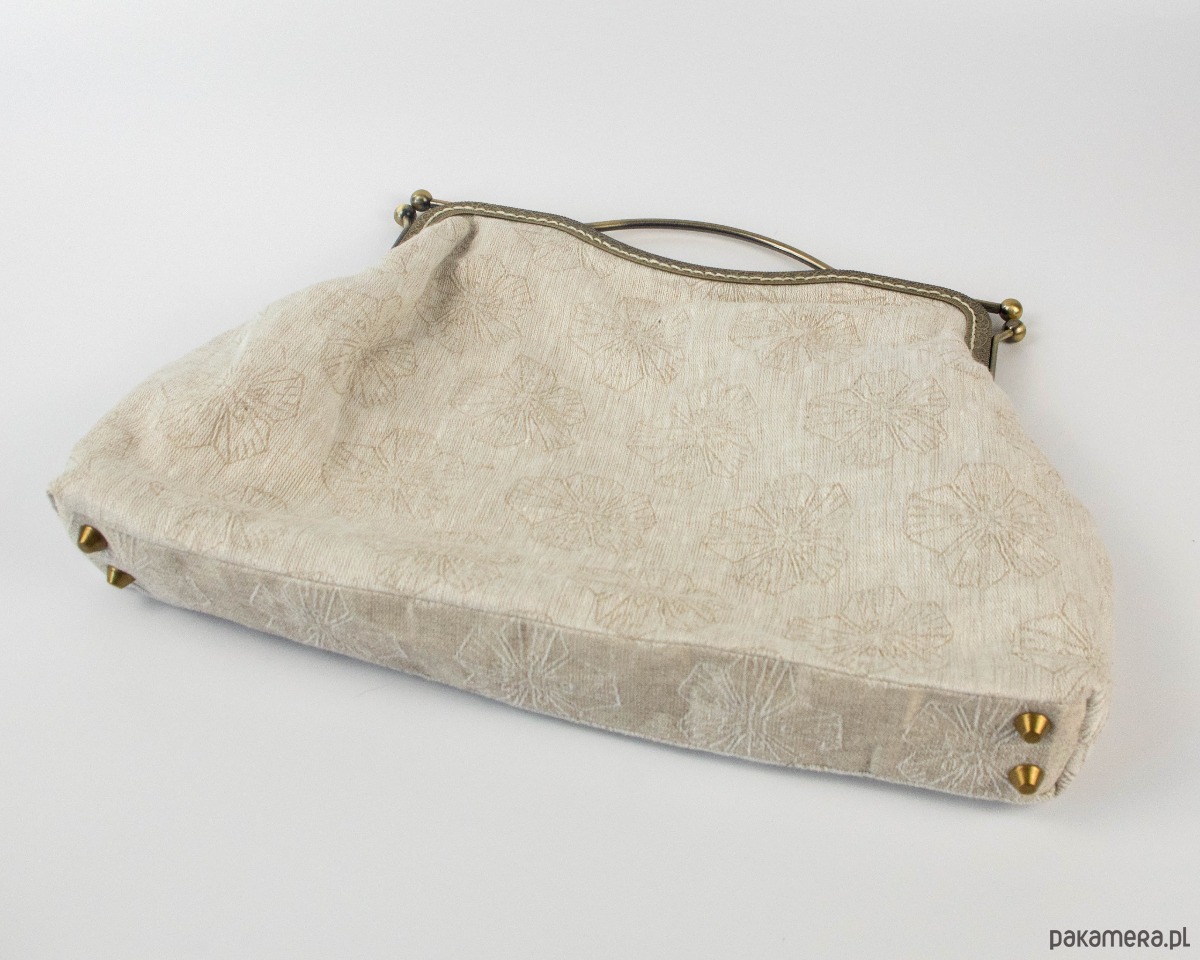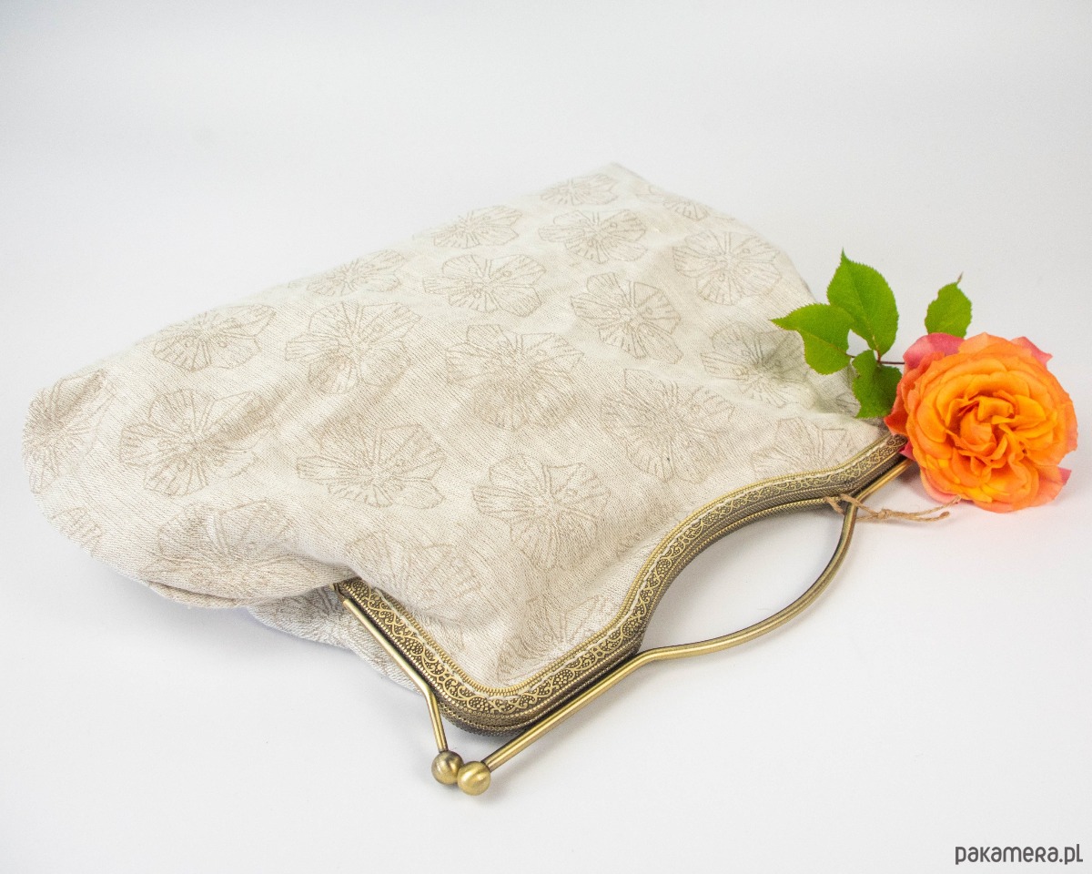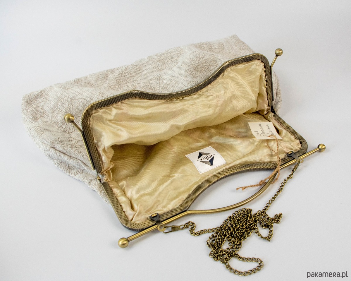 Torebka w kolorze naturalnego lnu w ciemniejsze kwiaty lnu, na podszewce (beż/ecru). Zapięcie jest wszyte ręcznie (nie ma niebezpieczeństwa, że się odczepi od tkaniny). Zapięcie i łańcuszek oraz nóżki wykonane z metalu w kolorze starego mosiądzu. Łańcuszek można odczepić lub wymienić.