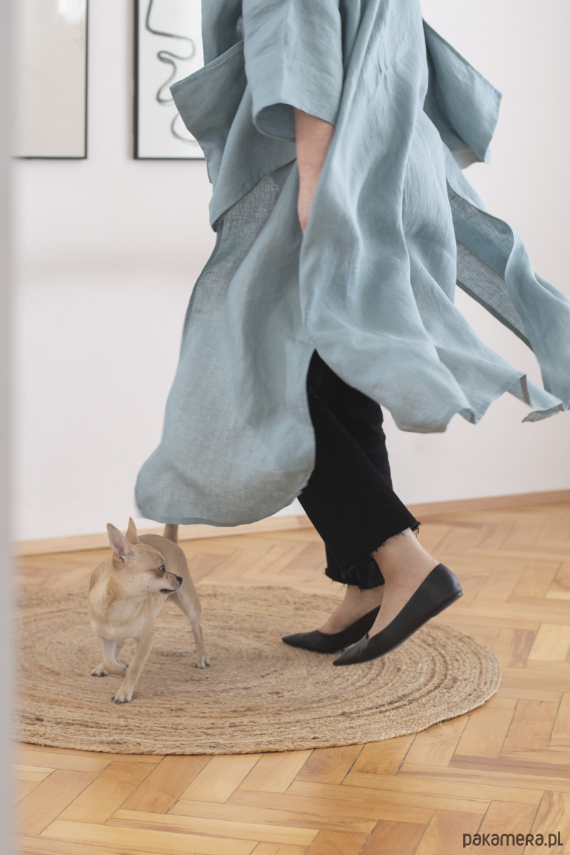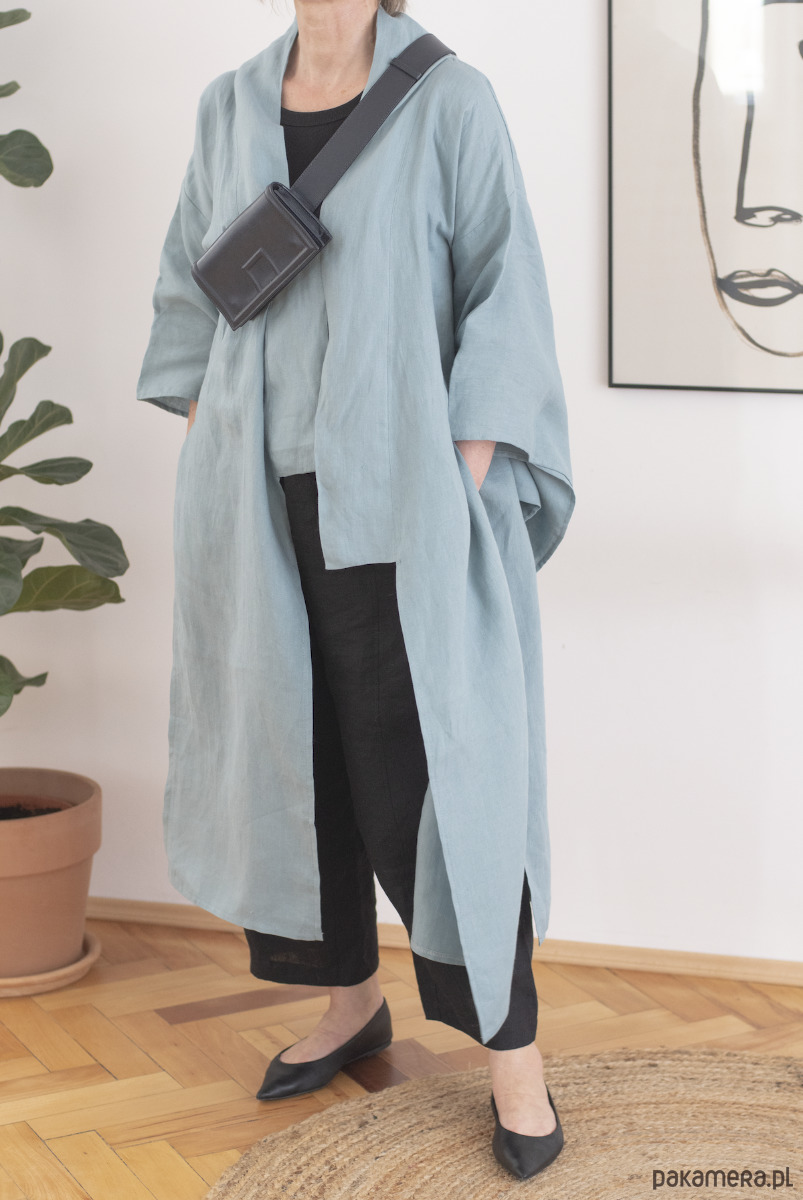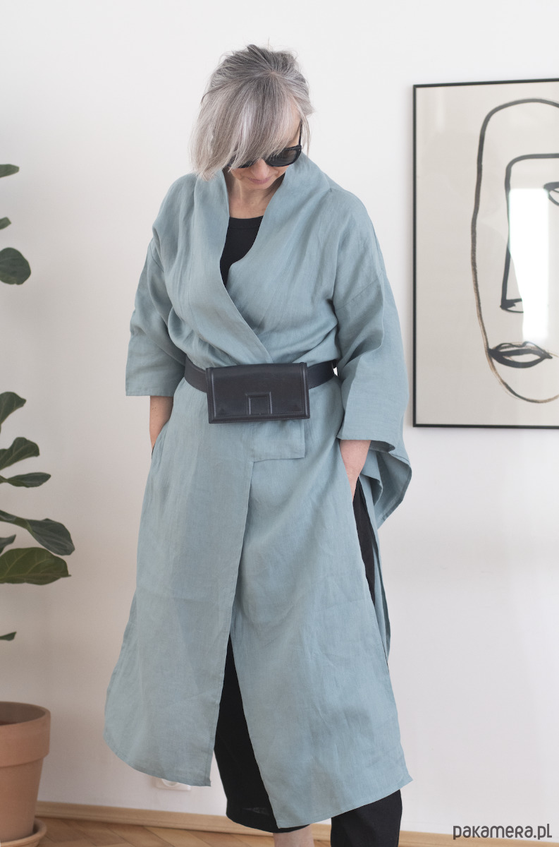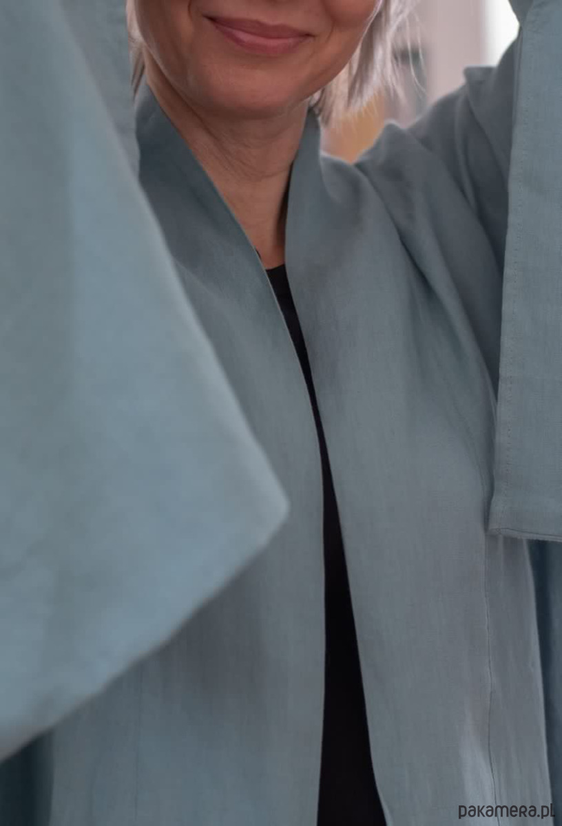 Lniane kimono „fruwa” jest lekkie i celowo nie ma paska, jeśli masz taką potrzebę, użyj cienkiego skórzanego paska lub zapnij nerkę.Możesz też zamówić lniany pasek AKI w odpowiednim kolorze.