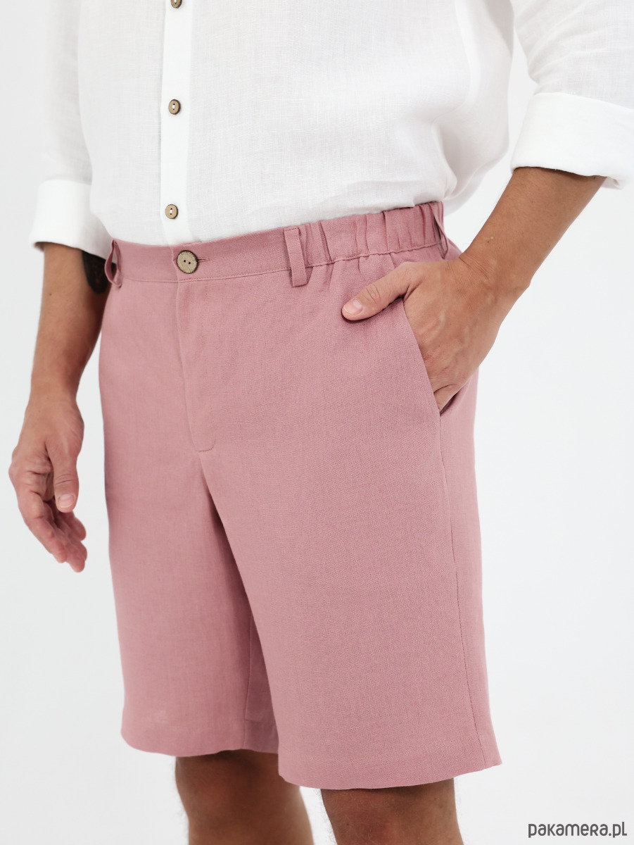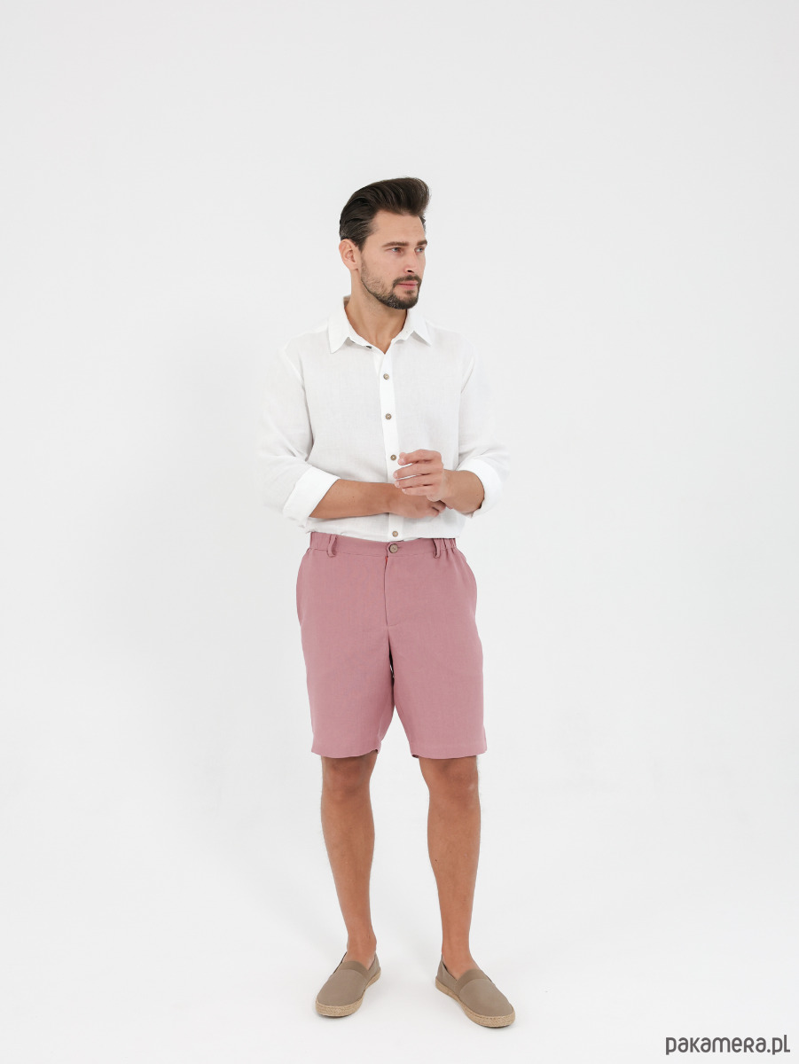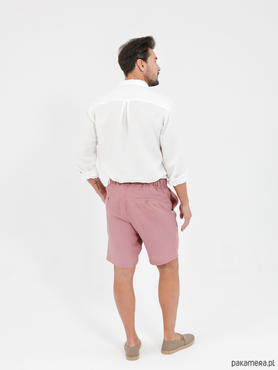 Męskie lniane spodenki o klasycznym kroju, wykonane z miękkiego, naturalnego lnu typu stonewashed. Spodenki zapinane są na zamek i kokosowe guziki. Posiadają dwie pojemne kieszenie z przodu oraz ozdobną imitację kieszeni z tyłu. Pas szortów został zaprojektowany z dbałością o każdy szczegół - z przodu jest gładki i elegancki, a z tyłu wszyta gumka, dzięki czemu styl SUNRISE jest wyjątkowo wygodny i odpowiedni dla każdego typu sylwetki. Otwarty splot lnianej tkaniny sprawia, że wykonane z niej ubrania są wyjątkowo oddychające i „chłodne” w dotyku, zapewniając komfort skóry podczas letnich upałów.