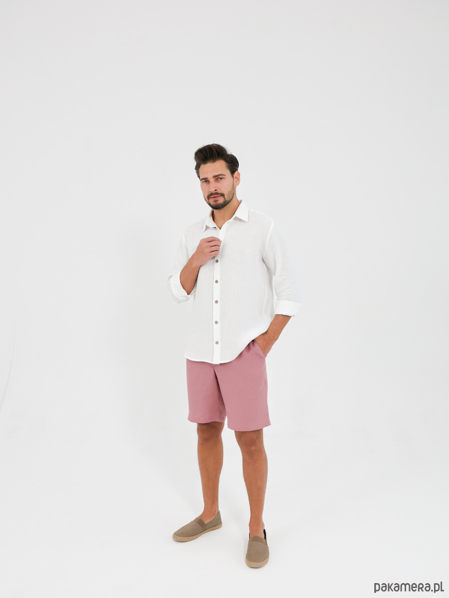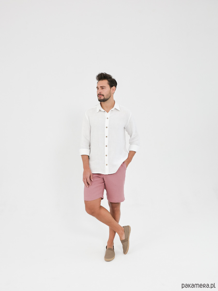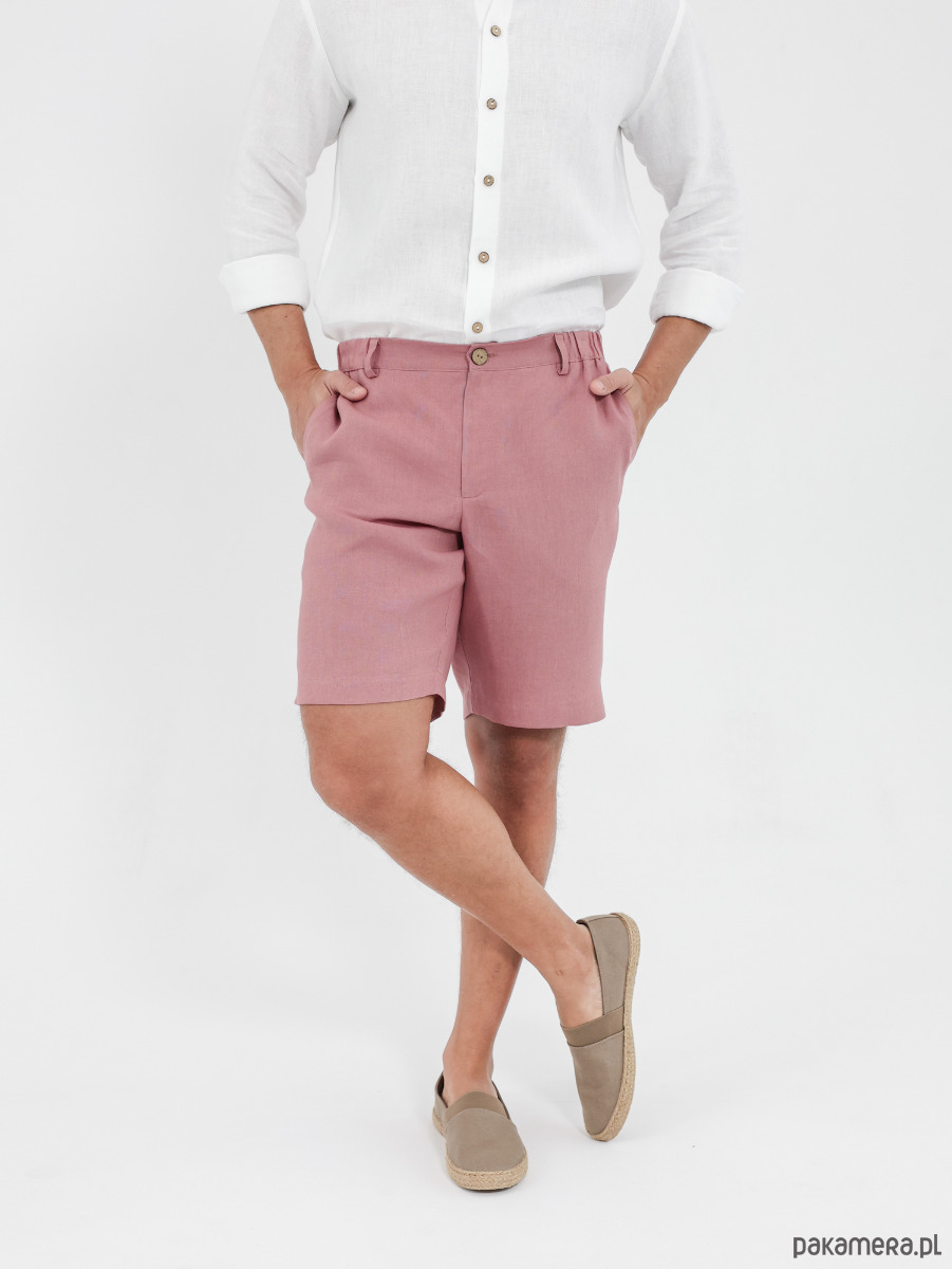 Męskie lniane spodenki o klasycznym kroju, wykonane z miękkiego, naturalnego lnu typu stonewashed. Spodenki zapinane są na zamek i kokosowe guziki. Posiadają dwie pojemne kieszenie z przodu oraz ozdobną imitację kieszeni z tyłu. Pas szortów został zaprojektowany z dbałością o każdy szczegół - z przodu jest gładki i elegancki, a z tyłu wszyta gumka, dzięki czemu styl SUNRISE jest wyjątkowo wygodny i odpowiedni dla każdego typu sylwetki. Otwarty splot lnianej tkaniny sprawia, że wykonane z niej ubrania są wyjątkowo oddychające i „chłodne” w dotyku, zapewniając komfort skóry podczas letnich upałów.