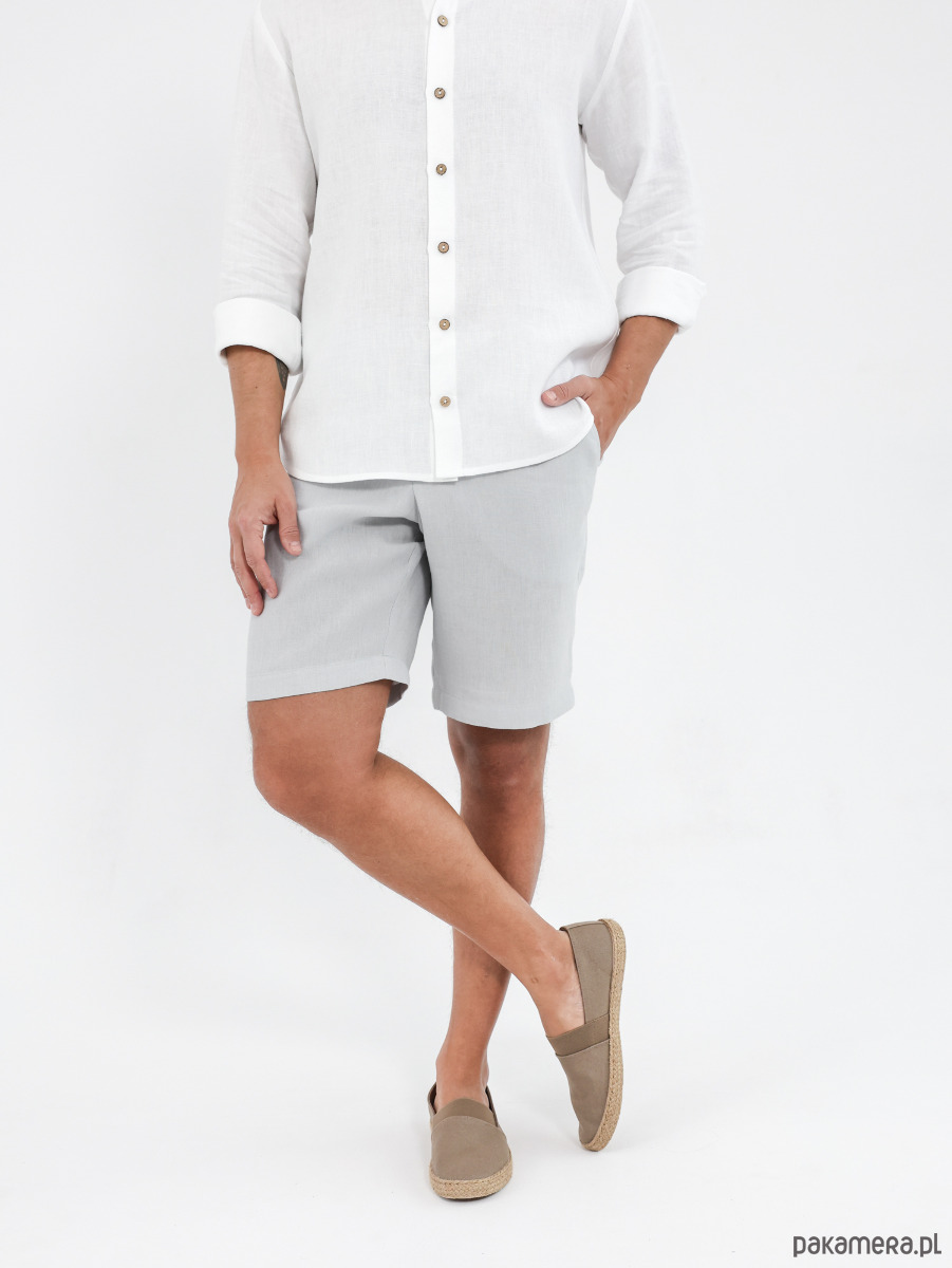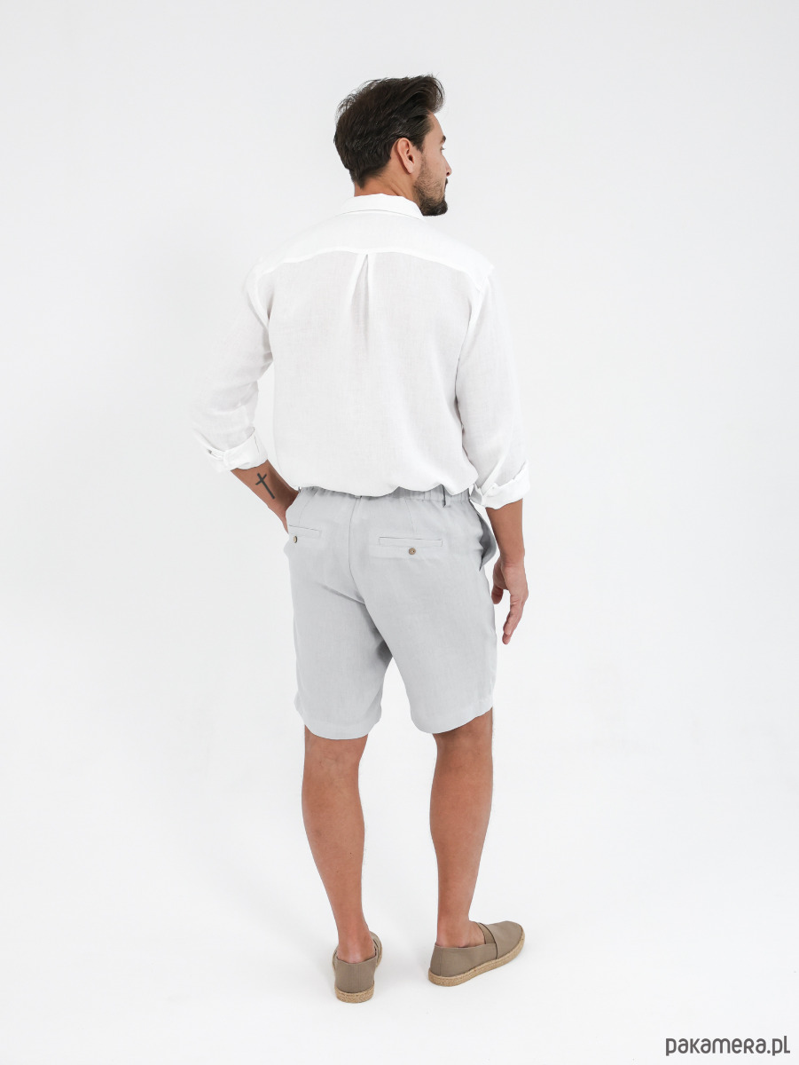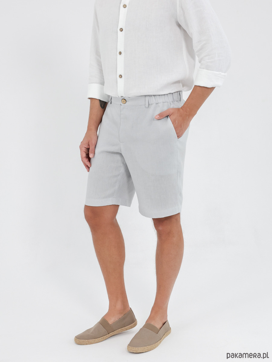 Męskie lniane spodenki o klasycznym kroju, wykonane z miękkiego, naturalnego lnu typu stonewashed. Spodenki zapinane są na zamek i kokosowe guziki. Posiadają dwie pojemne kieszenie z przodu oraz ozdobną imitację kieszeni z tyłu. Pas szortów został zaprojektowany z dbałością o każdy szczegół - z przodu jest gładki i elegancki, a z tyłu wszyta gumka, dzięki czemu styl SUNRISE jest wyjątkowo wygodny i odpowiedni dla każdego typu sylwetki. Otwarty splot lnianej tkaniny sprawia, że wykonane z niej ubrania są wyjątkowo oddychające i „chłodne” w dotyku, zapewniając komfort skóry podczas letnich upałów.