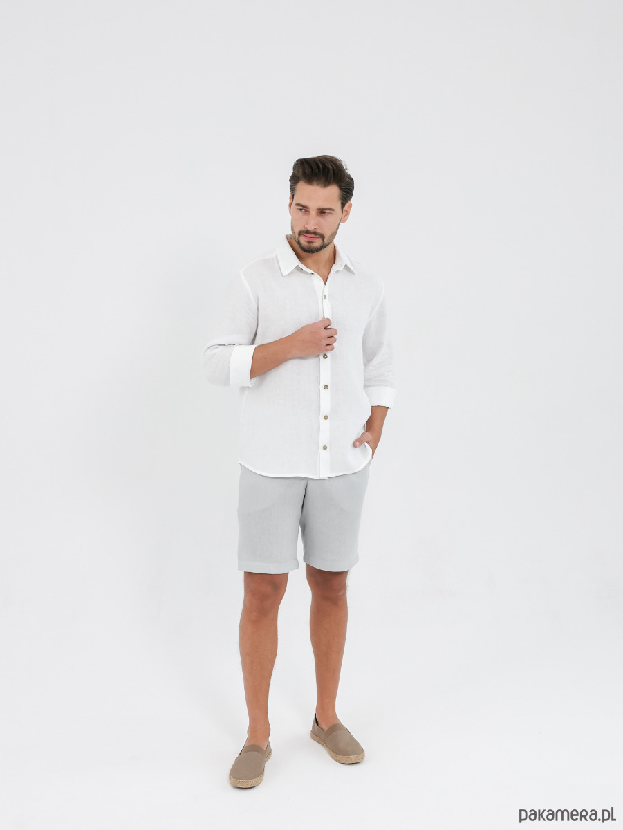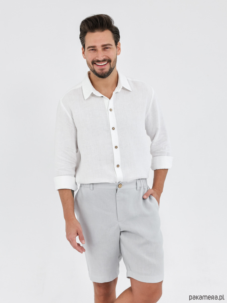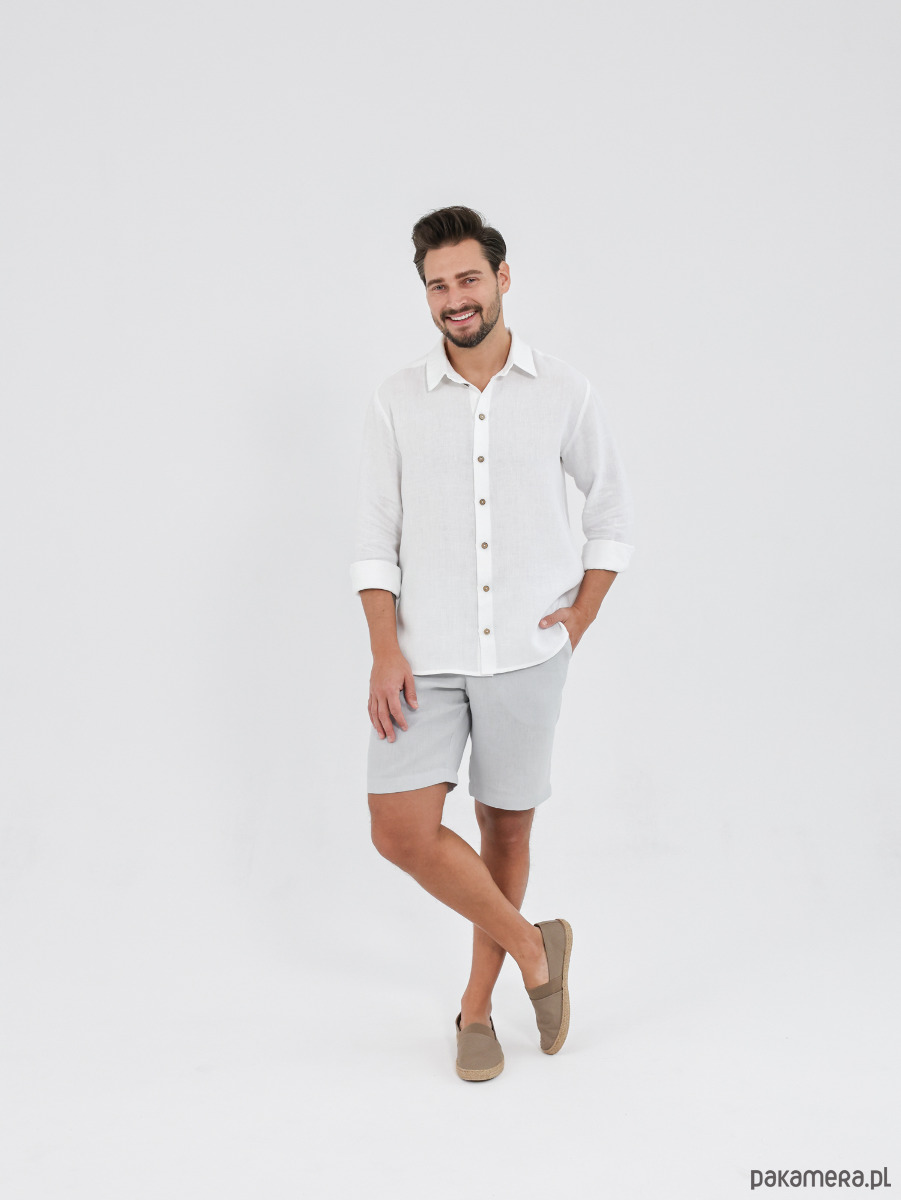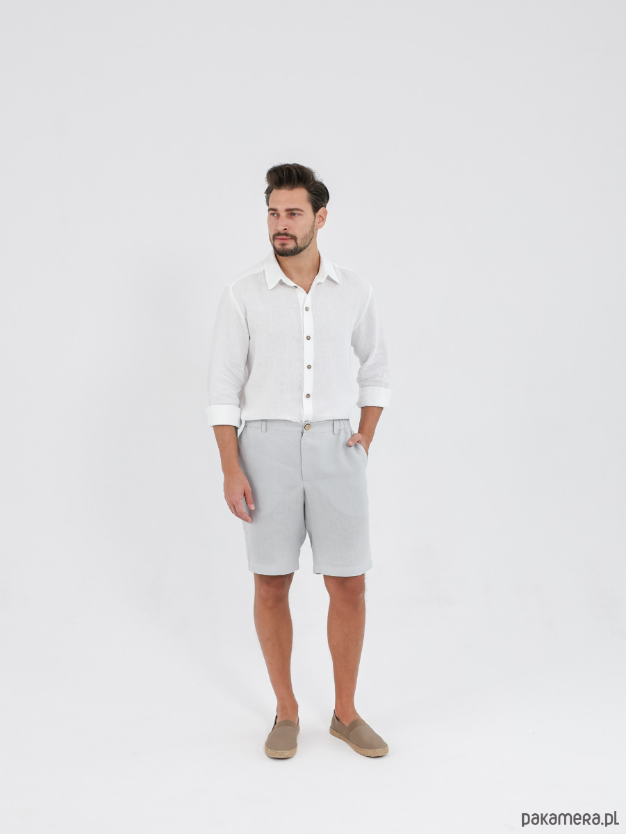 Męskie lniane spodenki o klasycznym kroju, wykonane z miękkiego, naturalnego lnu typu stonewashed. Spodenki zapinane są na zamek i kokosowe guziki. Posiadają dwie pojemne kieszenie z przodu oraz ozdobną imitację kieszeni z tyłu. Pas szortów został zaprojektowany z dbałością o każdy szczegół - z przodu jest gładki i elegancki, a z tyłu wszyta gumka, dzięki czemu styl SUNRISE jest wyjątkowo wygodny i odpowiedni dla każdego typu sylwetki. Otwarty splot lnianej tkaniny sprawia, że wykonane z niej ubrania są wyjątkowo oddychające i „chłodne” w dotyku, zapewniając komfort skóry podczas letnich upałów.