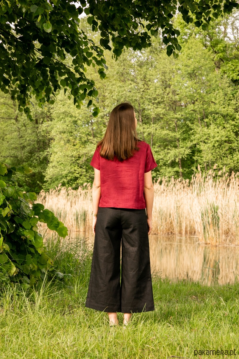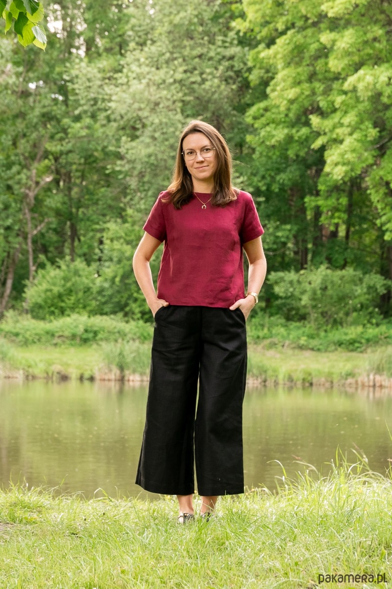 Lniane kuloty charakteryzują się tym, że są niezwykle przewiewne, niezwykle komfortowe, i bardzo wygodne. Kuloty uszyłyśmy z grubszego lnu, dzięki czemu są sztywniejsze. Niech Cię nie zwiedzie sztywność materiału, spodnie po praniu będą układały się bardziej „miękko” 🙂