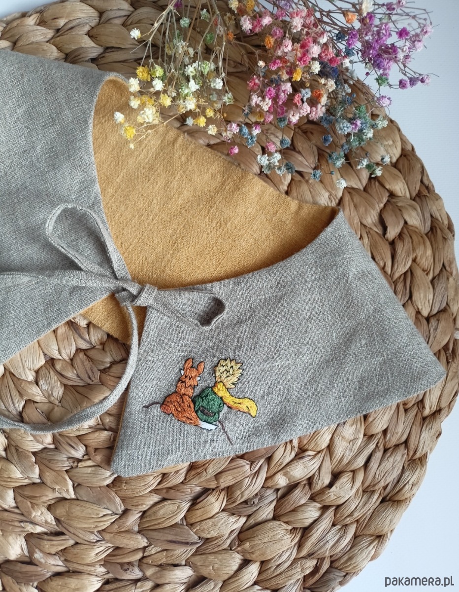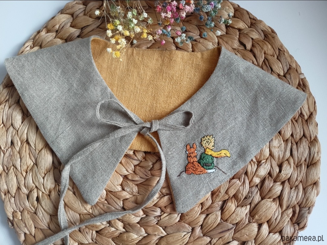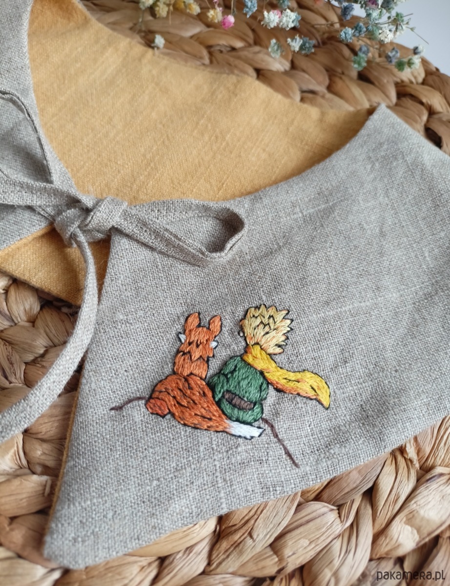Lniany kołnierzyk z wyhaftowanym ręcznie Małym Księciem. Rozmiar 4-8 lat. Idealne dopełnienie sukienki czy bluzki.