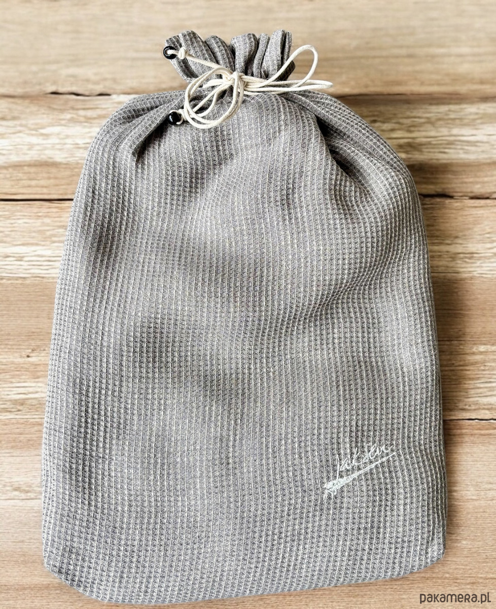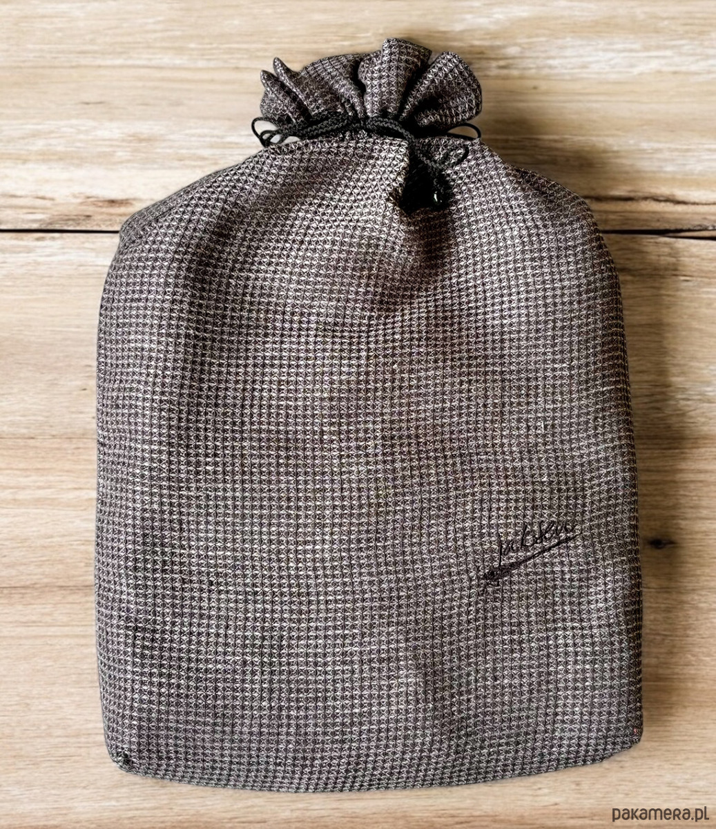 Szlafrok zapakowany jest w lniany worek, który można wykorzystać na