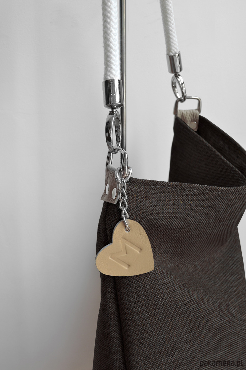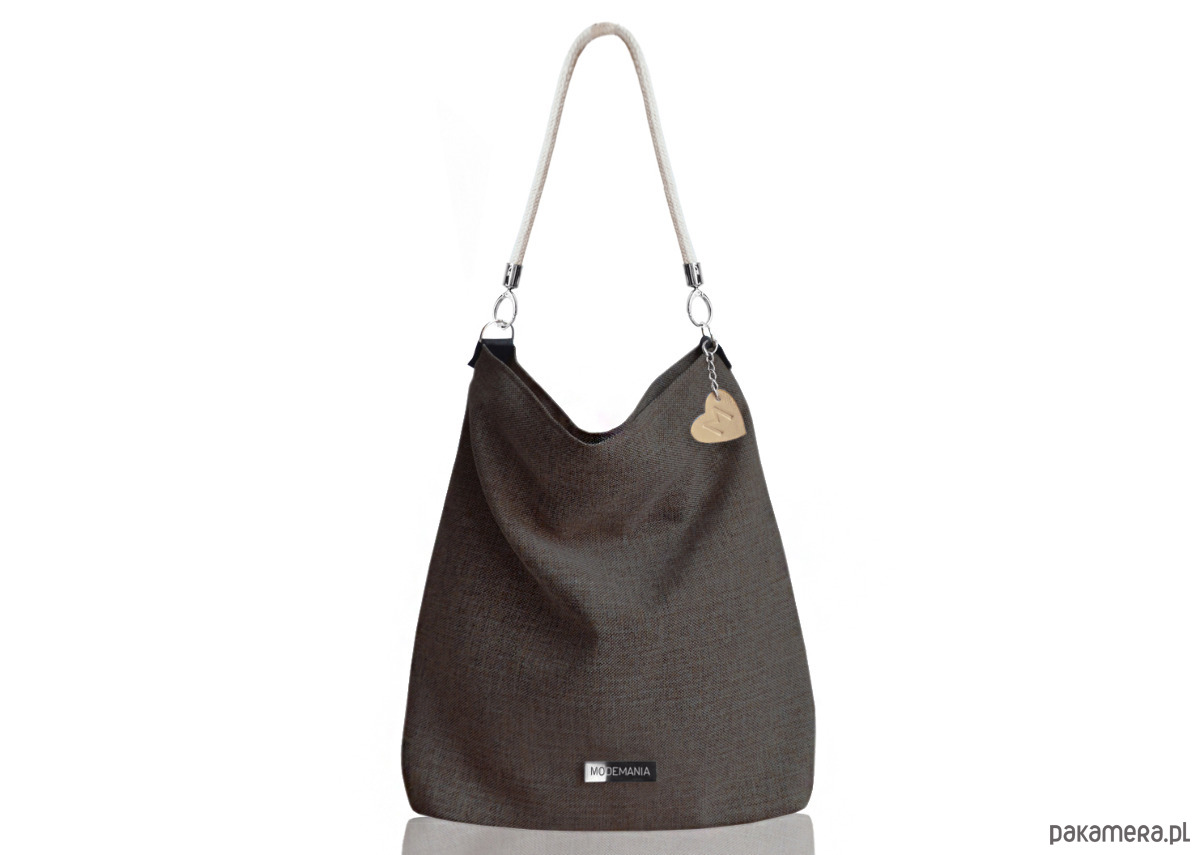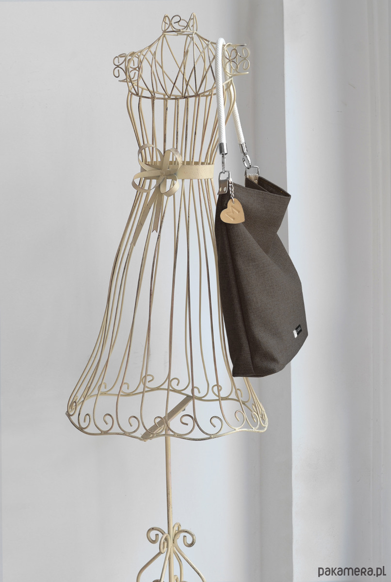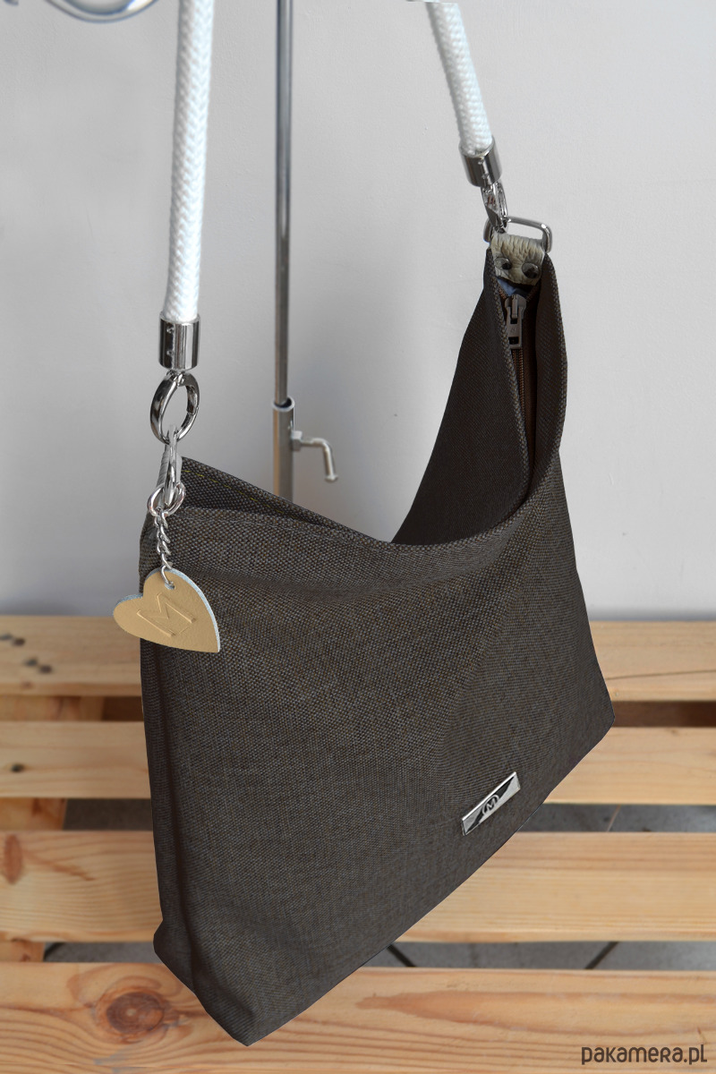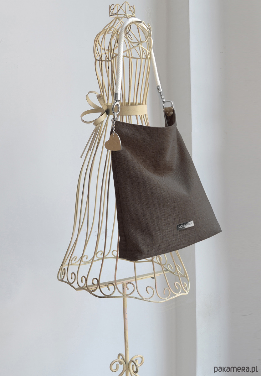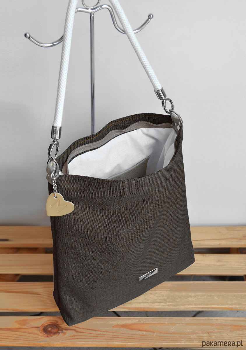 Worek na ramię wykonany z lnu w odcieniach gorzkiej czekolady.