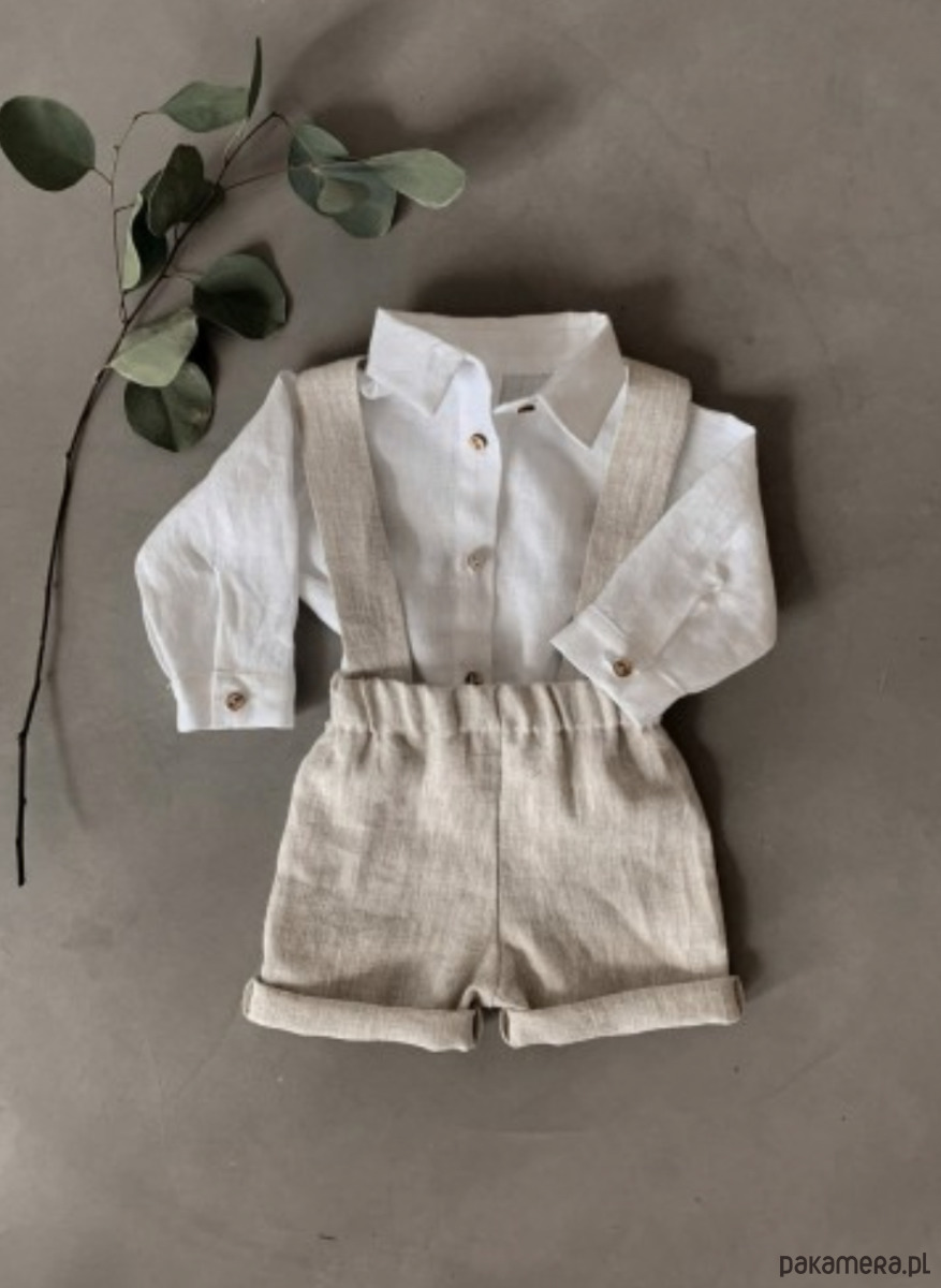 Piękny zestaw dla chłopca wykonany ze 100% lnu. Klasyczna biała koszula plus spodnie na szelkach wykonane z lnu w kolorze naturalnym o strukturalnej fakturze.