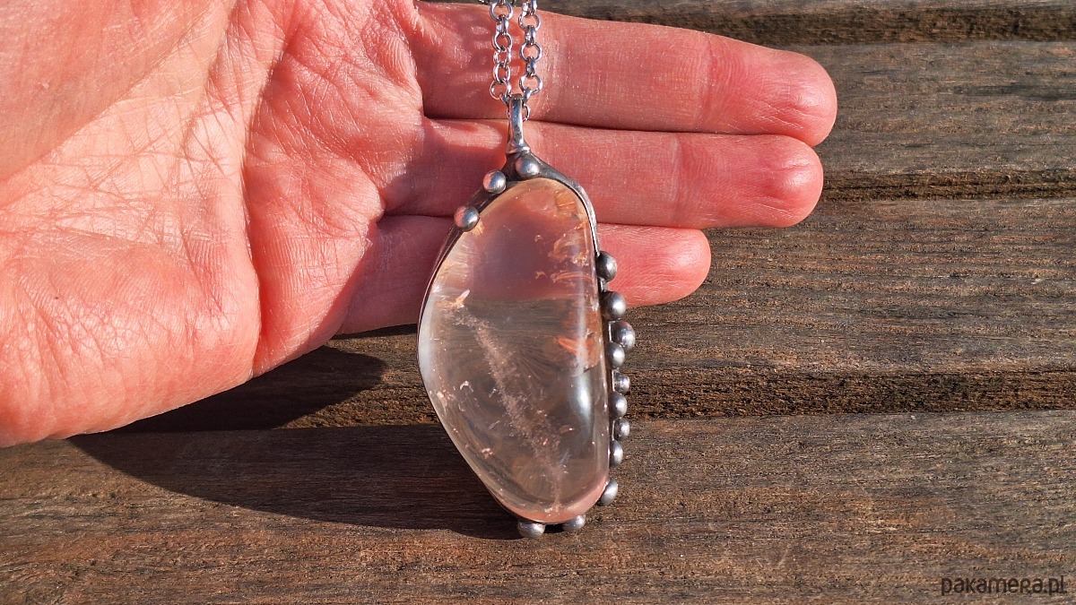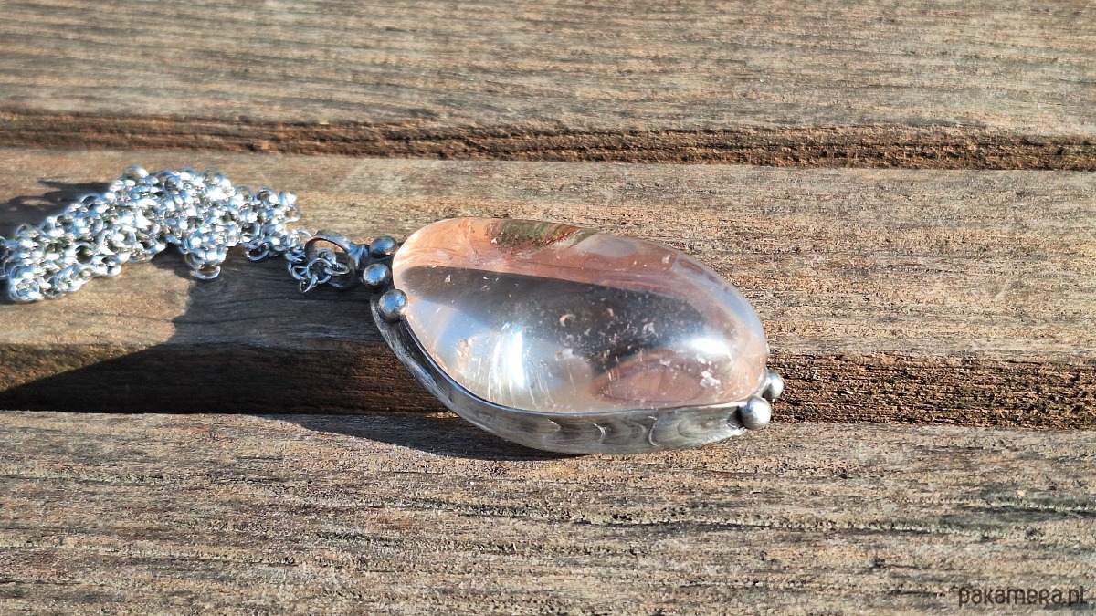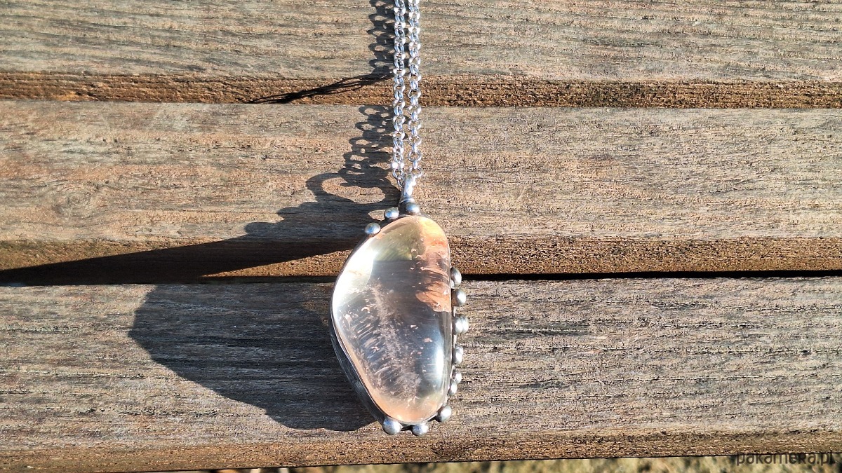 Wisiorek wykonany z miedzi, cyny i kryształu górskiego z chlorytem. Wymiary ok. 5.5 na 3 cm. Zawieszony na łańcuszku o długości ok. 50 cm.