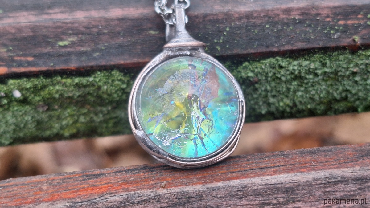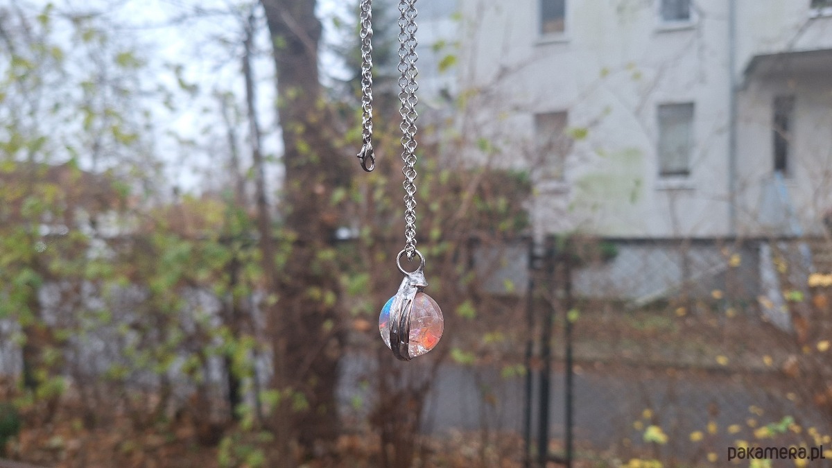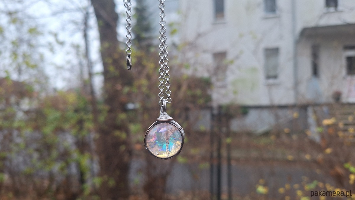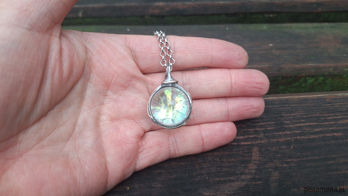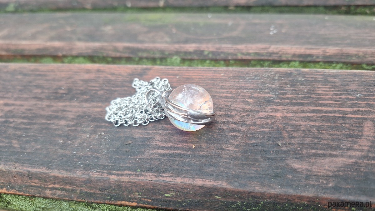 Wisiorek wykonany z miedzi, cyny i kuli kryształu górskiego z tzw. aurą anielską. Wymiary ok. 2 na 2 cm. Zawieszony na łańcuszku o długości ok. 50 cm.