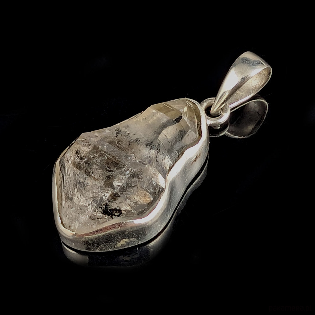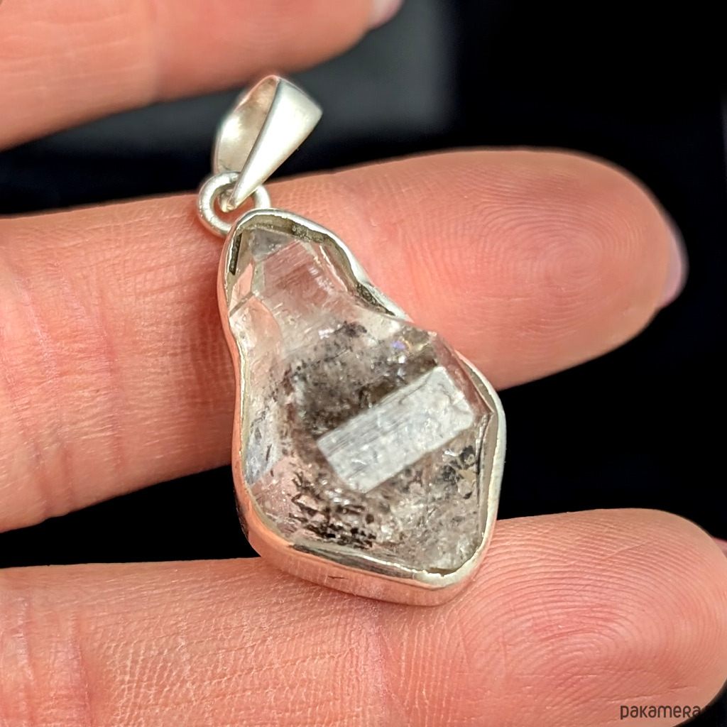 Wisior z oprawionym w srebro próby 925 najczystszym kryształem górskim potocznie zwanym herkimerem- niezwykle czysta odmiana nazywana też diamentem z Herkimer (od nazwy miejsca występowania, okręg Herkimer w stanie Nowy Jork). Wymiary oprawy kamienia 27 x 17 mm . Długość max 37mm. Wewnątrz krystalicznego minerału ciekawe, czarne wrostki. Waga 7,8 g. Wisiorek wykonany przez dostawcę kamieni, zostanie zapakowany w eleganckie pudełeczko