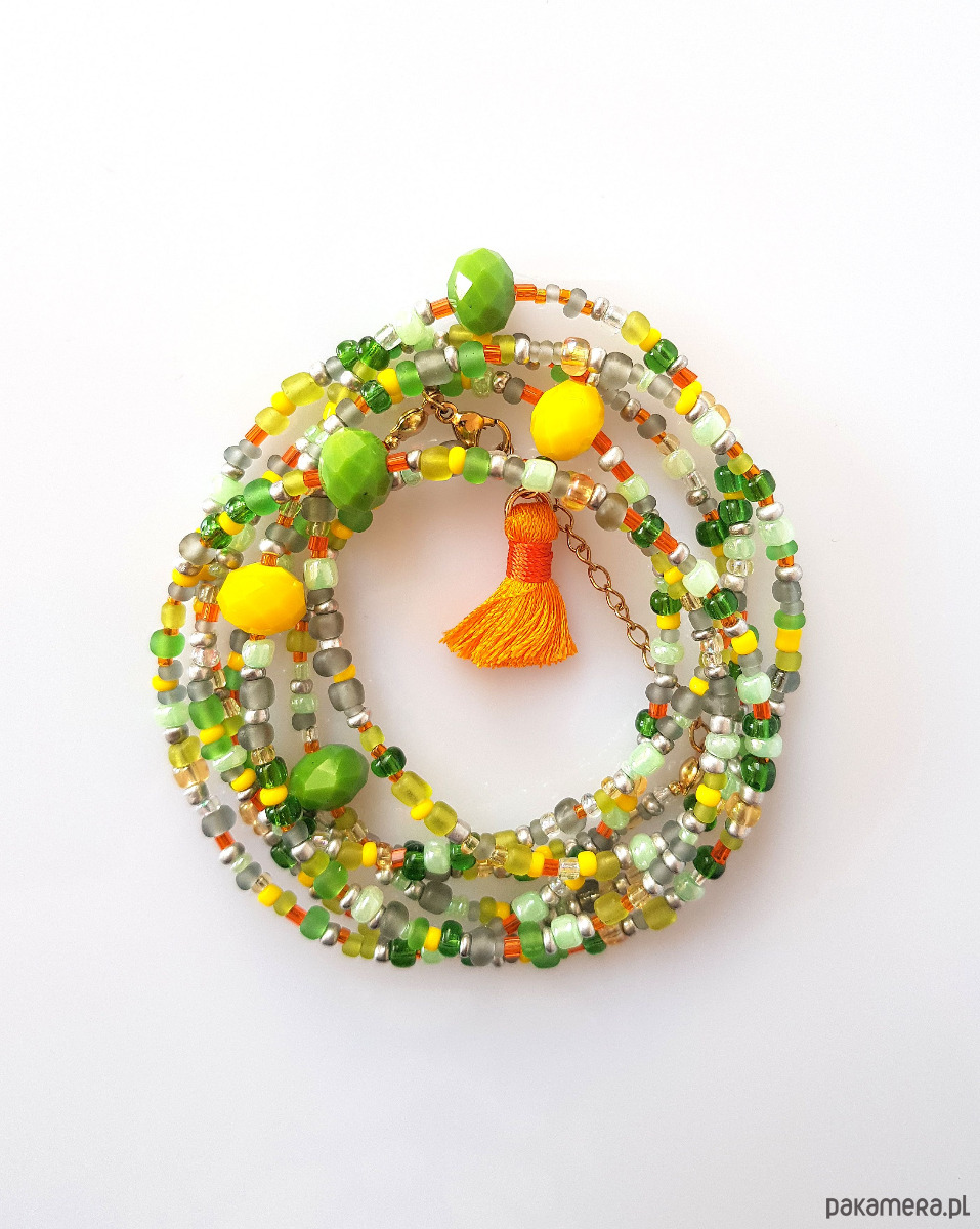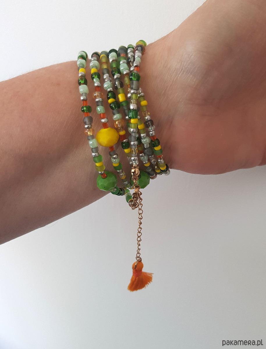 Można go nosić na różne sposoby, także jako bransoletkę owijkę ( na nadgarstek około 17 cm owija się 7 razy ).