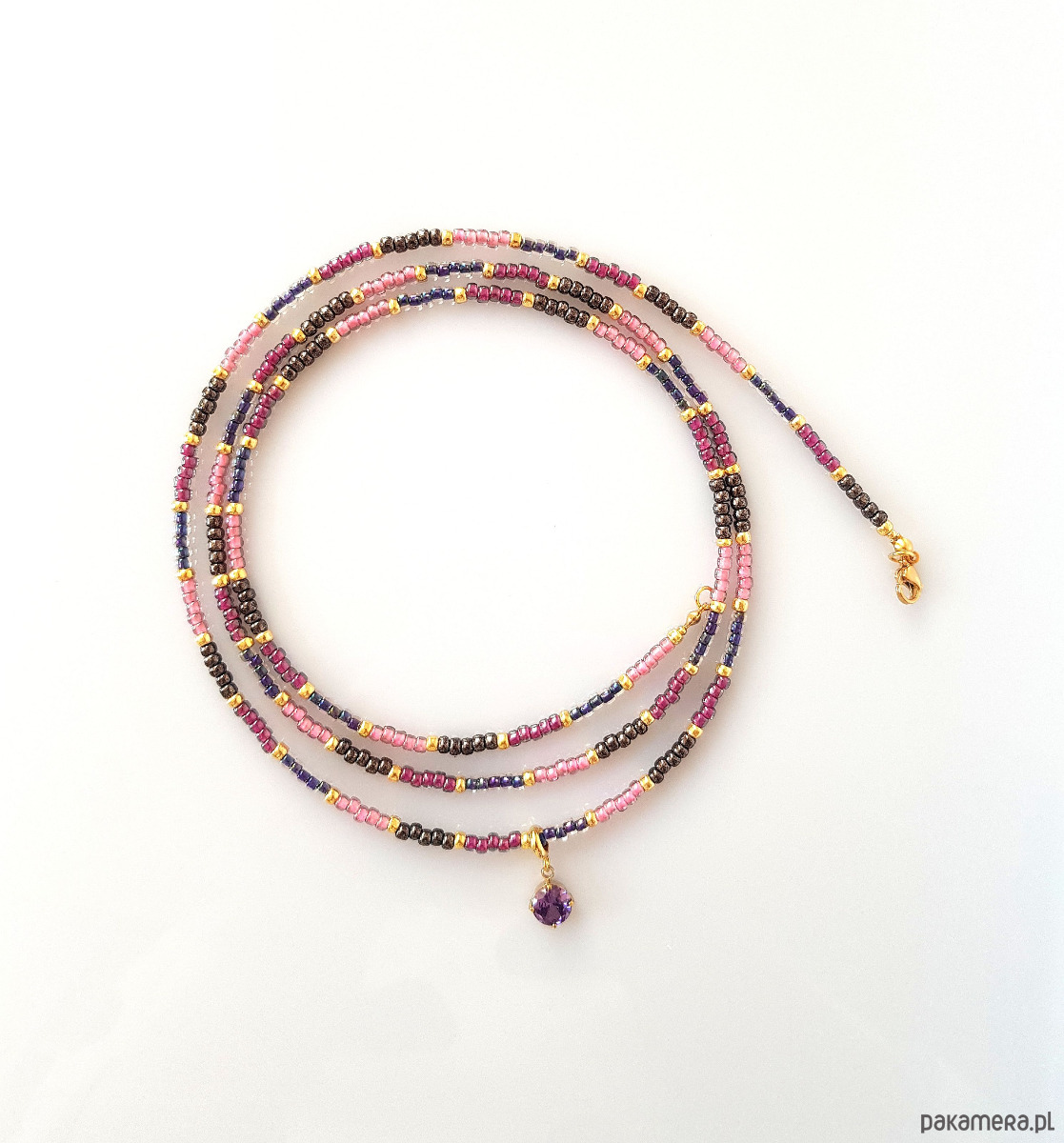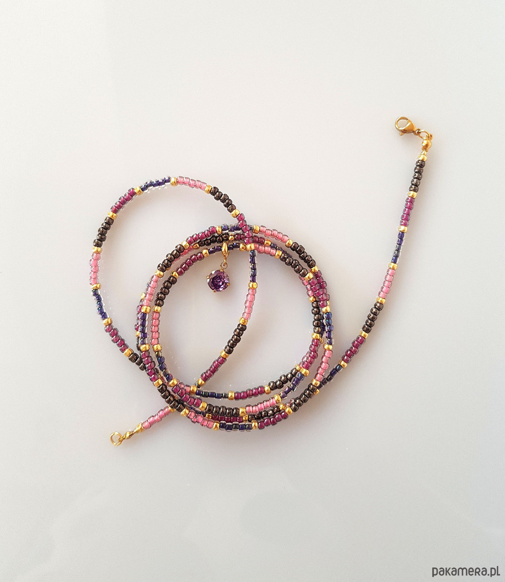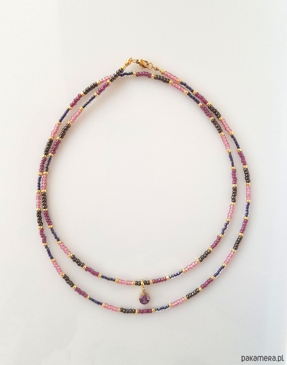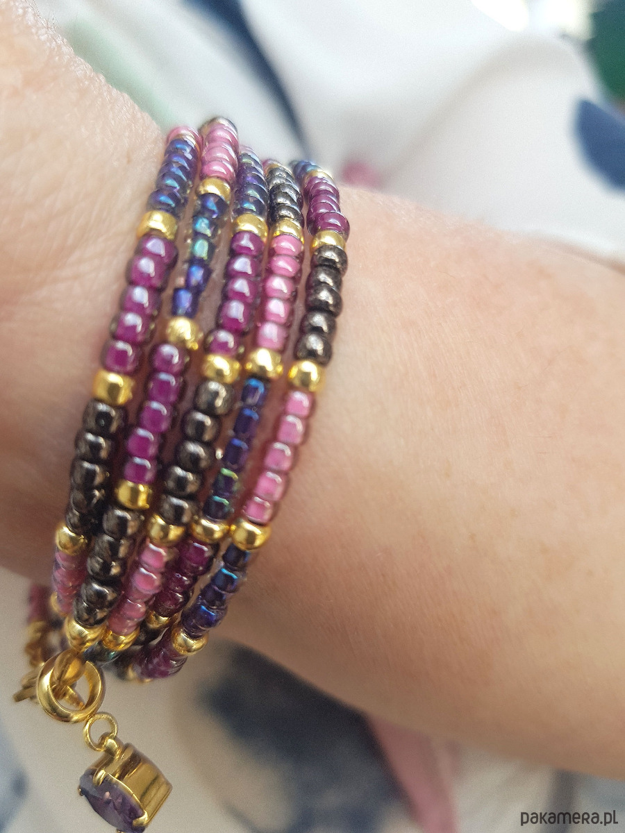 Skomponowany z wielu wysokiej jakości japońskich koralików toho w odcieniach różu i fioletu.