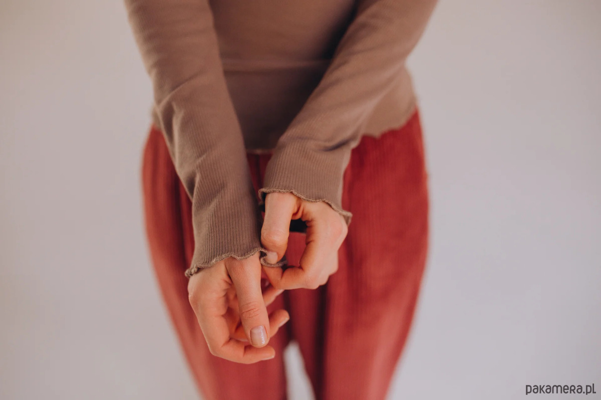 Blisko to ten longsleeve, który zakładasz i od razu czujesz… właśnie to. Miękkość przy skórze, wygodę, która nie udaje, subtelność, która nie narzuca się, tylko jest obok — dokładnie tak, jak lubisz. Uszyliśmy go z prążkowanej, bawełnianej dzianiny, która dopasowuje się do Twojego ciała i rytmu dnia. Oddycha razem z Tobą.