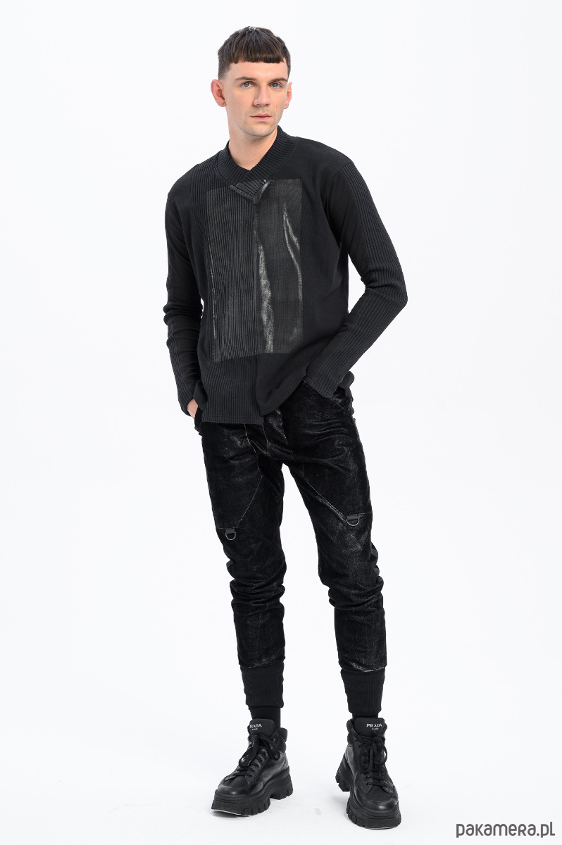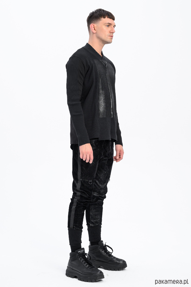Asymetryczny przód z pionowymi łączeniami struktur - delikatny prążek w zestawieniu z mocniejszą strukturą optycznie wydłuża sylwetkę