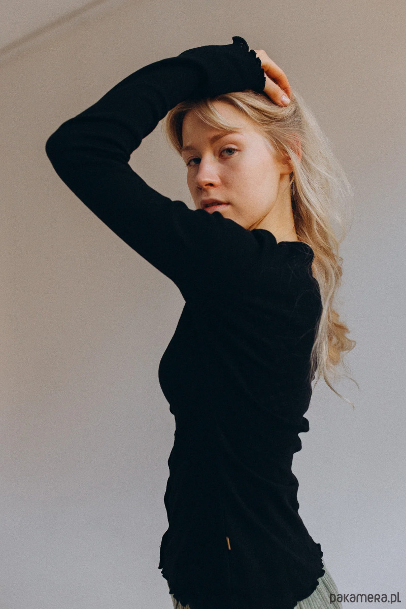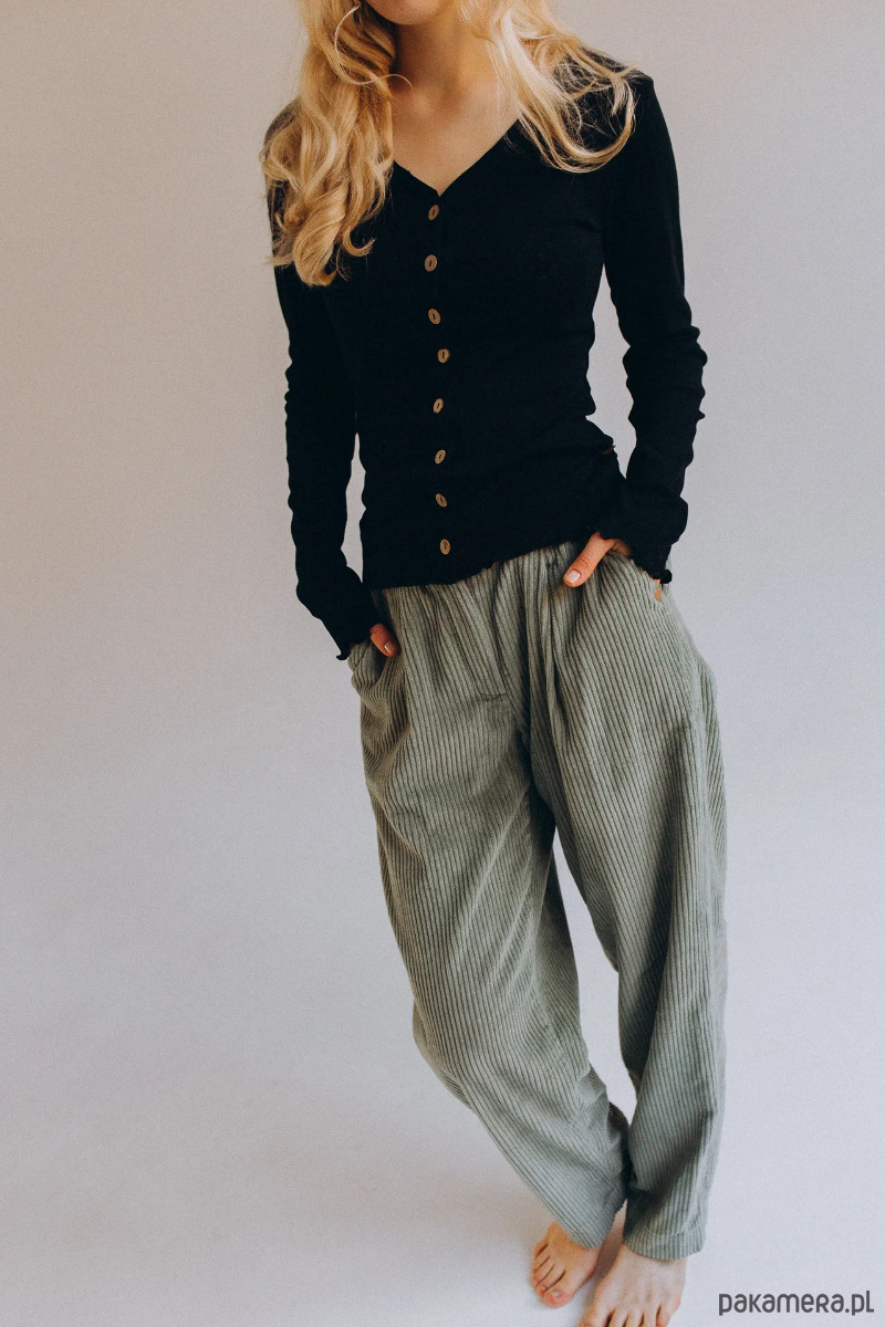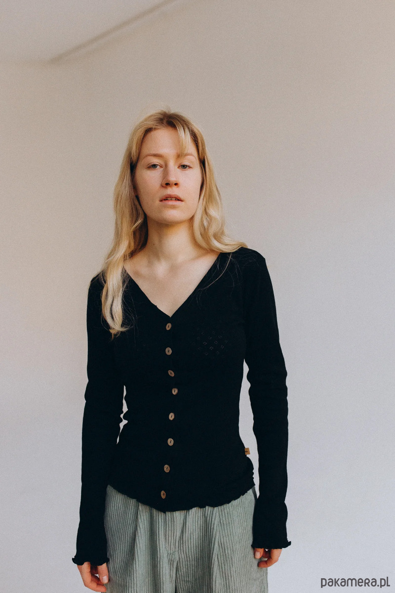 Falbanki nigdy nie były tym, co musiały mieć nasze projekty, ale tutaj – nie mogliśmy się oprzeć. Ale poza tym, że Mellow jest po prostu urocza, jest też niesamowicie praktyczna… Mellow uszyliśmy z dzianinowej bawełny z ażurowym wzorem i wykończyliśmy delikatnymi falbankami. Nie dość, że jest uroczy, to jeszcze niesamowicie praktyczny dzięki kokosowym guzikom na całej długości. Możesz za ich pomocą łatwo regulować głębokość dekoltu albo rozpiąć go zupełnie i nosić jak narzutkę.