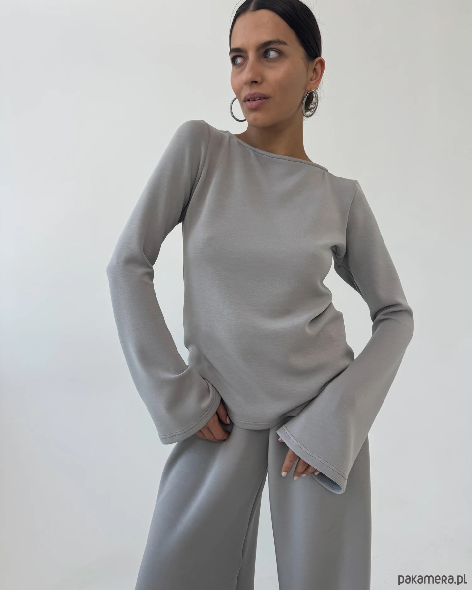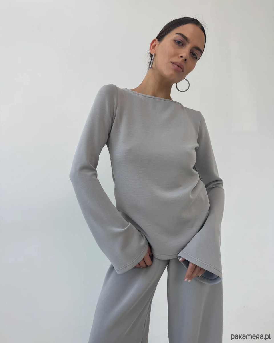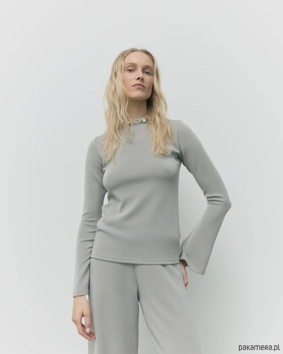 Minimalistyczny krój z rozszerzanymi rękawami nadaje całości lekkości i nowoczesnego charakteru. Jasnoszary odcień paloma jest neutralną bazą, którą łatwo wkomponujesz w kapsułową garderobę – świetnie wygląda zarówno solo, jak i w komplecie ze spodniami Gentle z tej samej tkaniny.