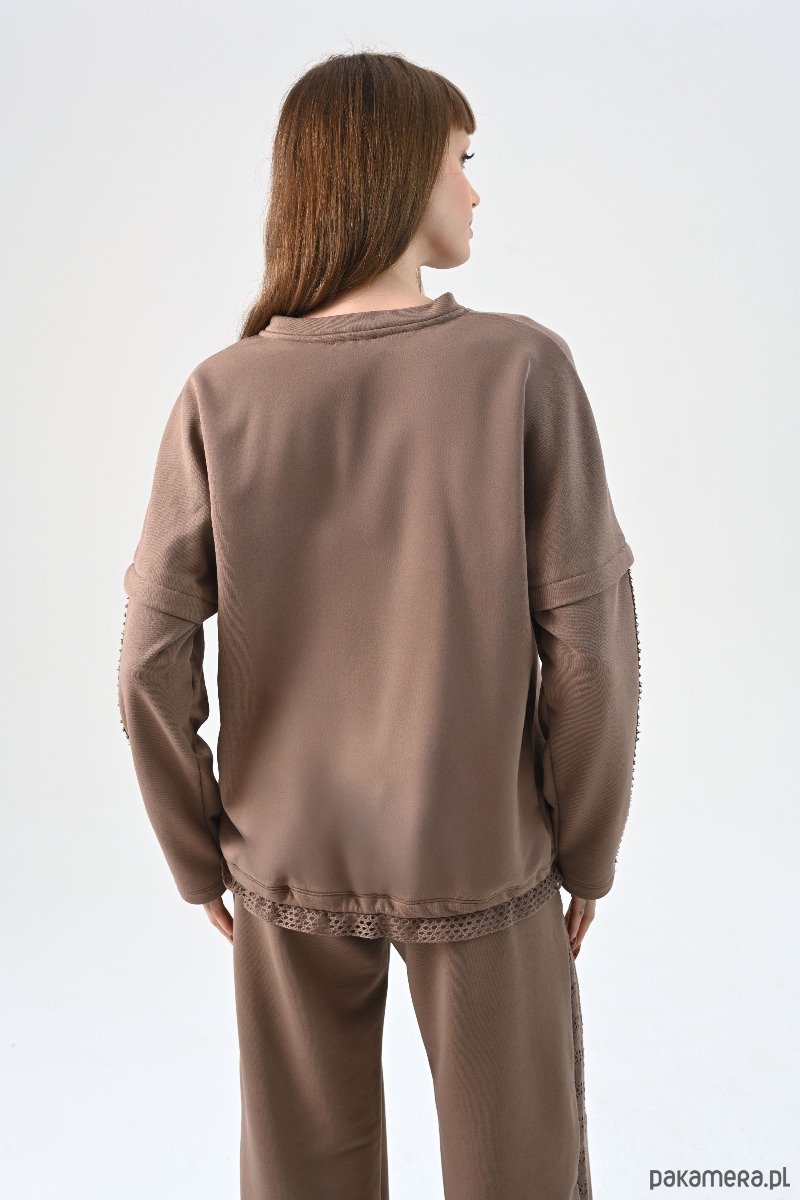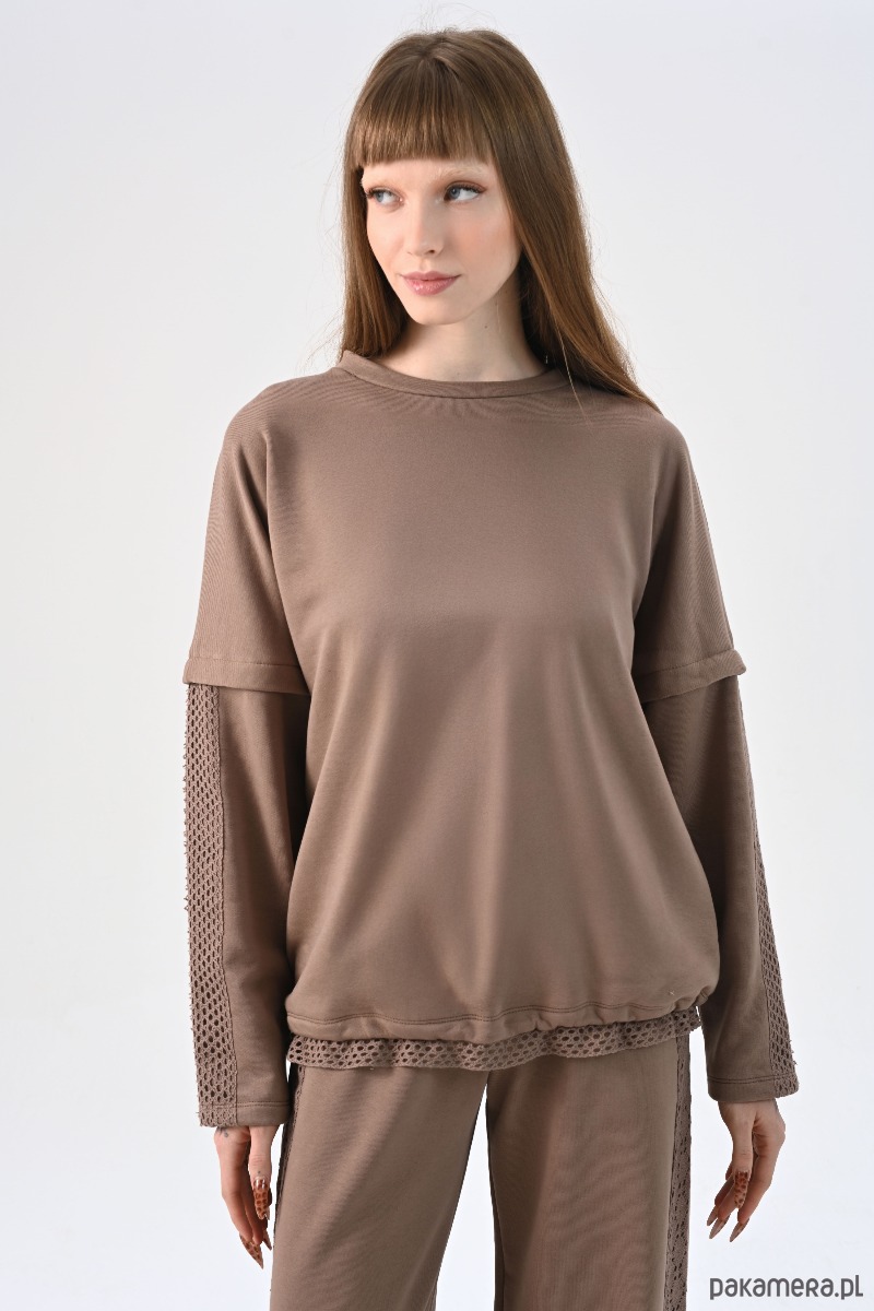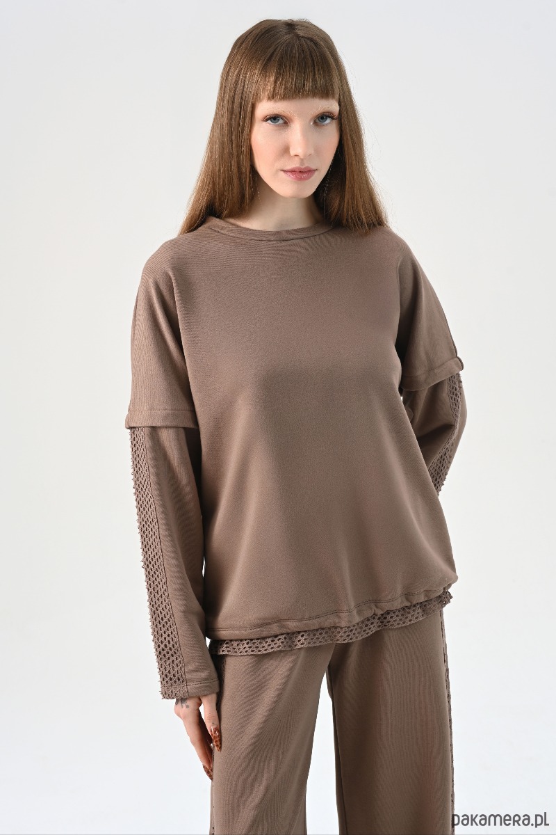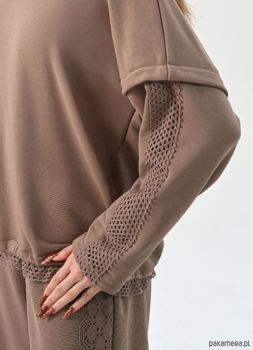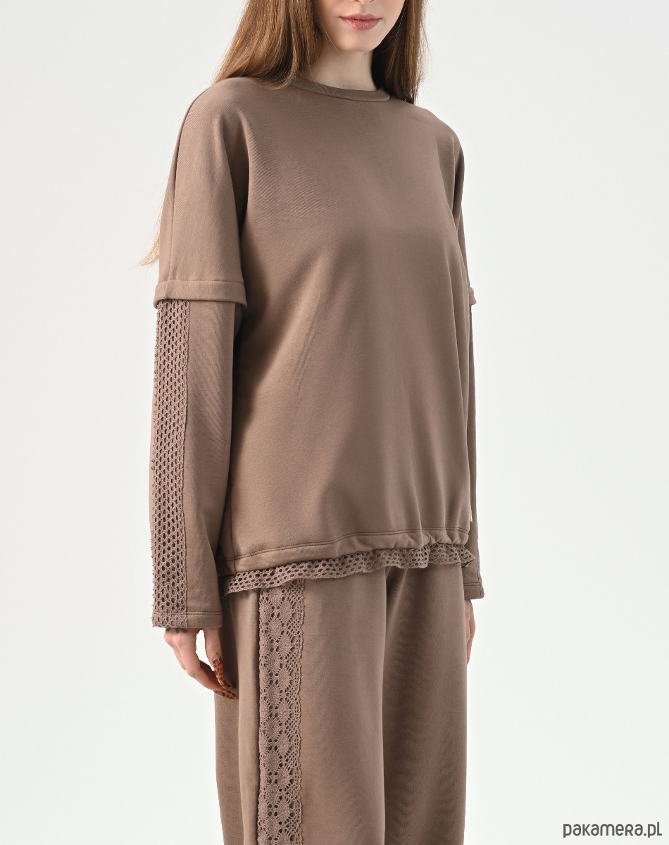 Projekt wyróżniają panele z ażurowej koronki, które poprowadzono wzdłuż rękawów oraz w formie wykończenia dolnej krawędzi, tuż pod ściągaczem. Ta bawełniana bluzka z długim rękawem posiada obniżoną linię ramion i klasyczny, okrągły dekolt. Dzięki stonowanej kolorystyce, ten beżowy longsleeve stanowi uniwersalną bazę do stylizacji, tworząc spójny zestaw z dedykowanymi spodniami dresowymi lub codziennymi jeansami.