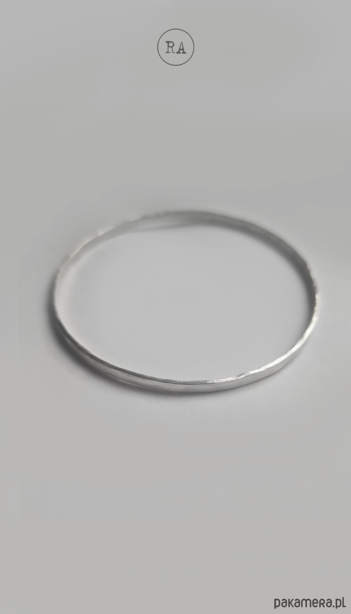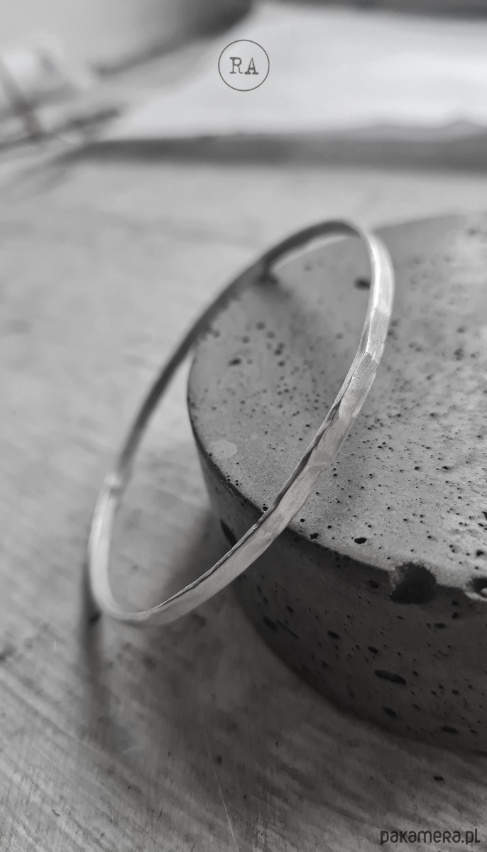Srebrna bransoleta kółko, o szerokości ok. 3,5 mm, młotkowana, lekko oksydowana.