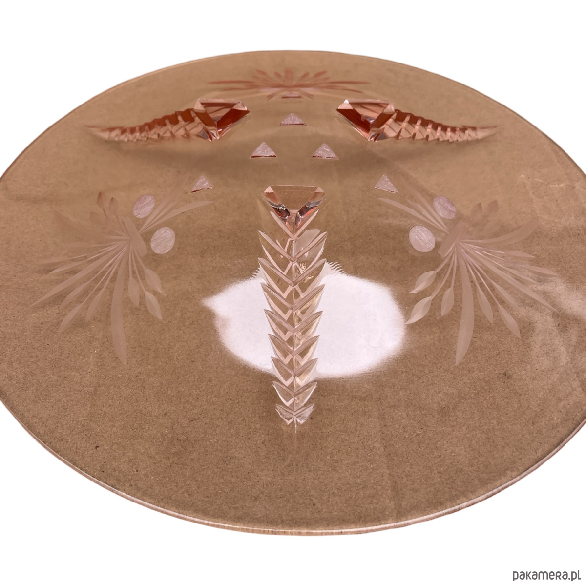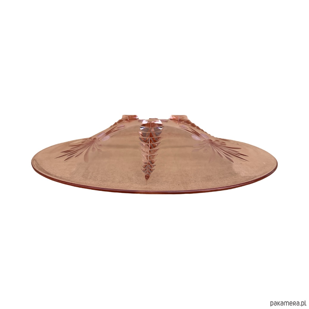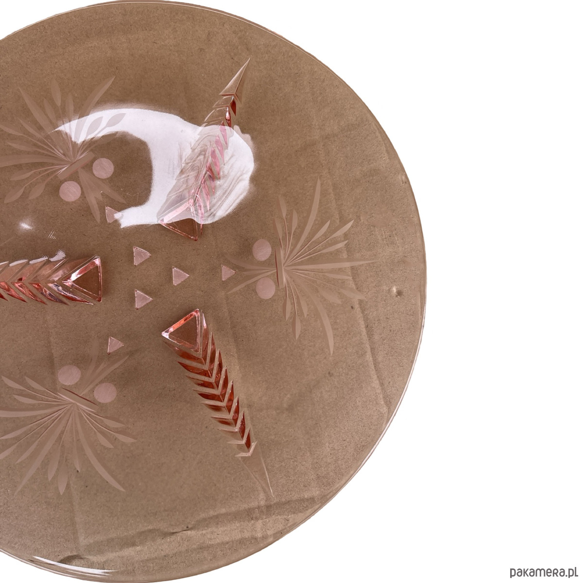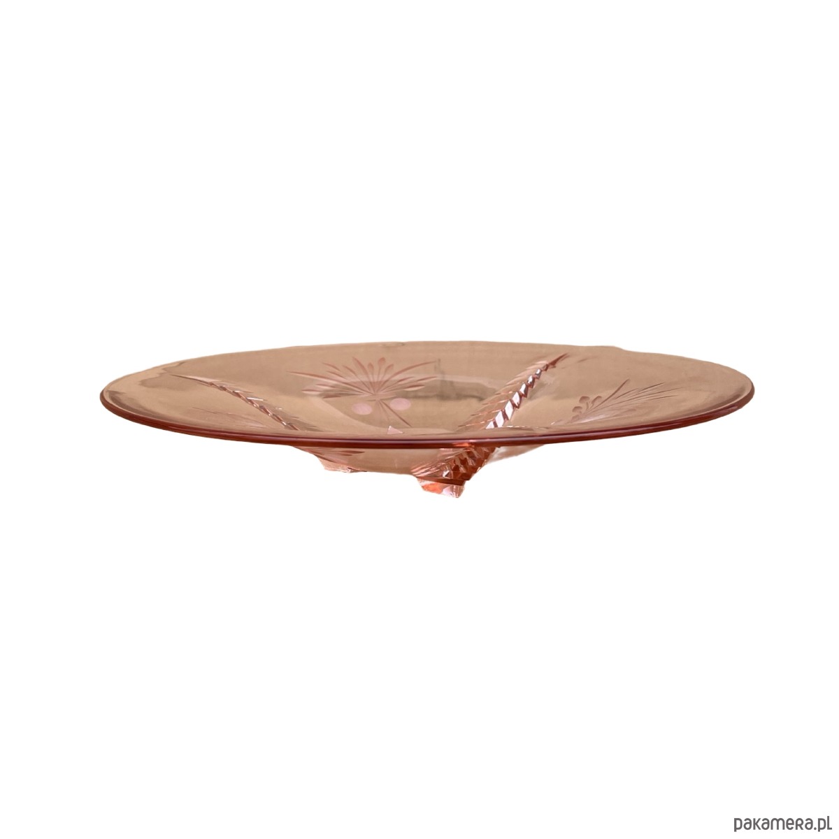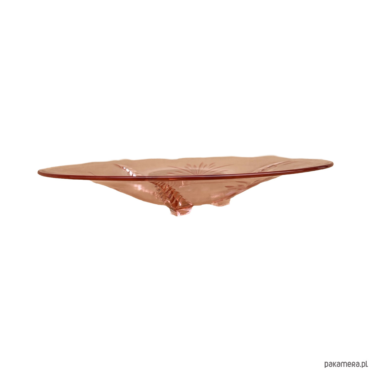 Piękna Patera żardiniera Szkło rozalinowe, przezroczyste i matowe Łososiowa patera w stylu art deco, Brzozówka wyprodukowana w Polsce dla Huty Szkła „Niemen” ok. 1930 Patera wykowna ze szkła szlifowanego. Stan zachowany w stanie oryginalnym bardzo dobrym.