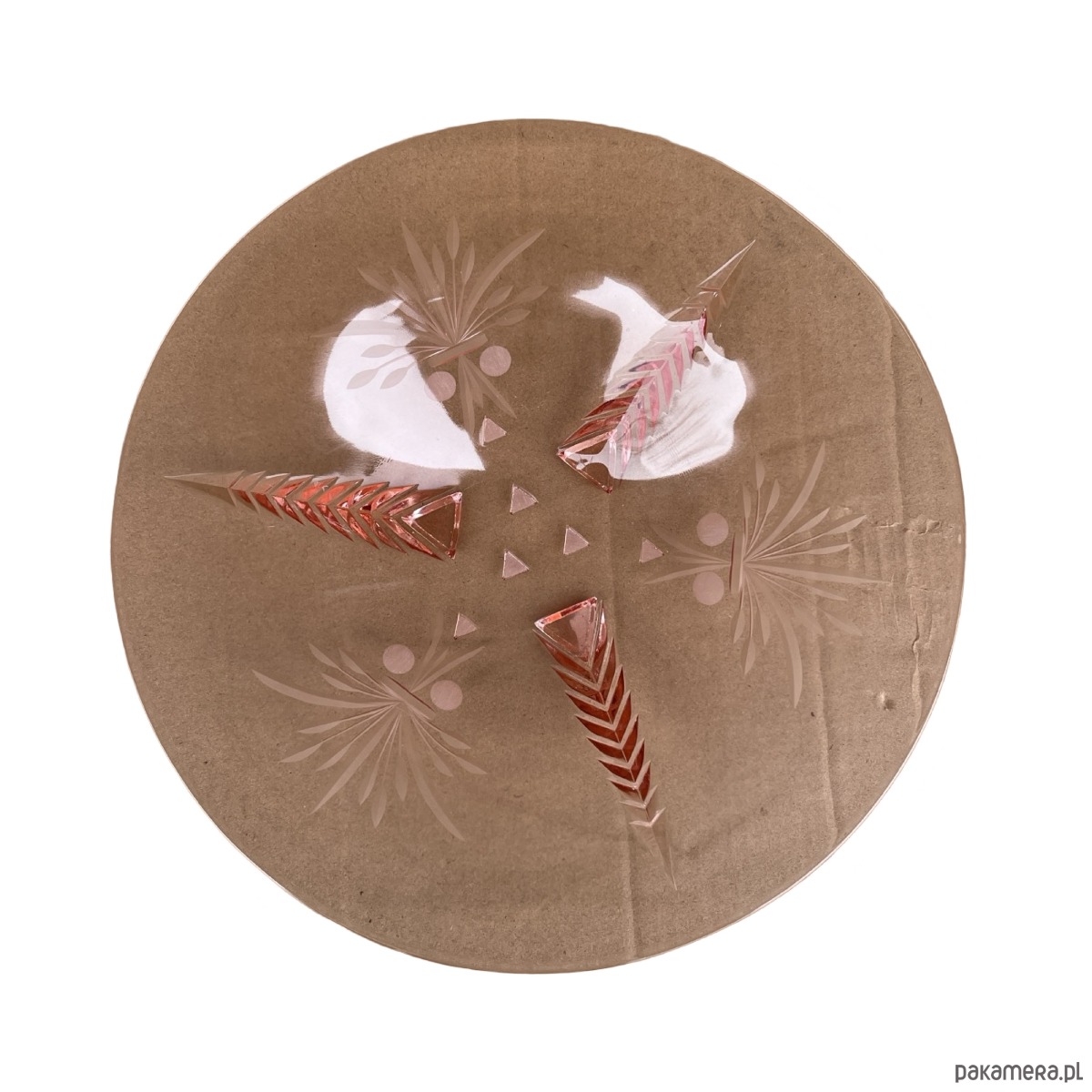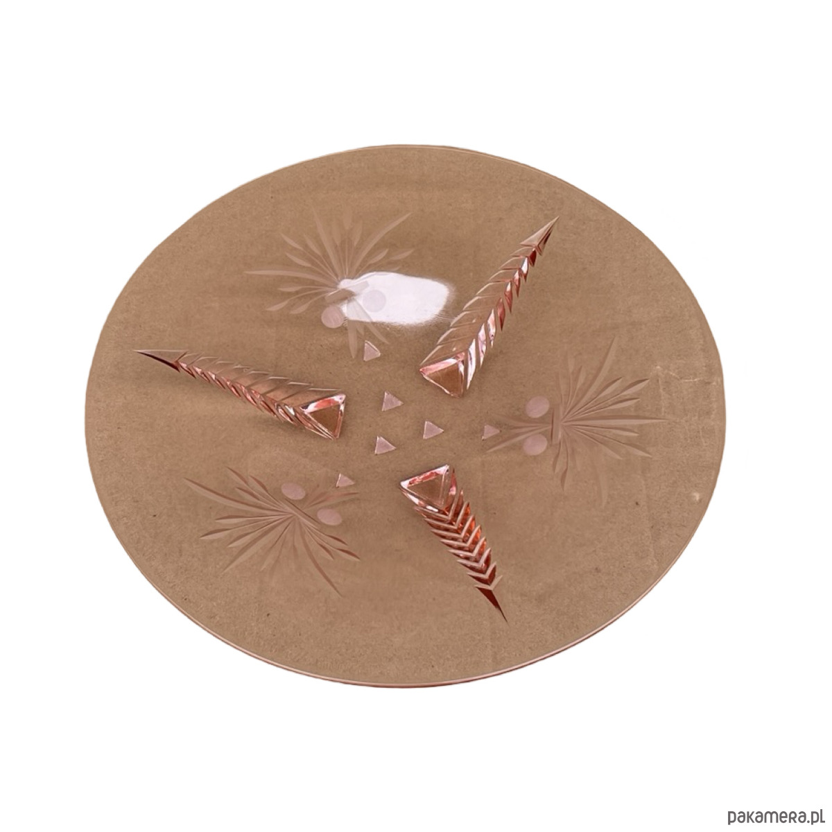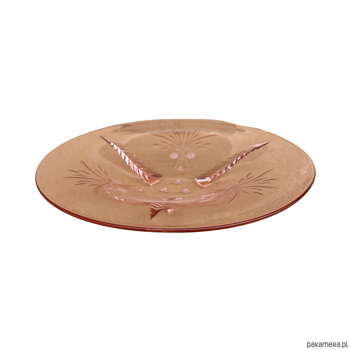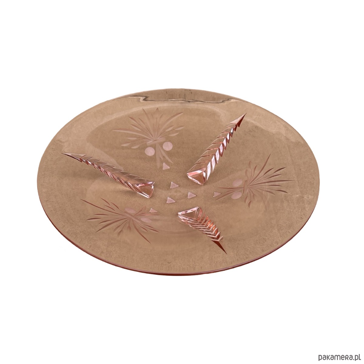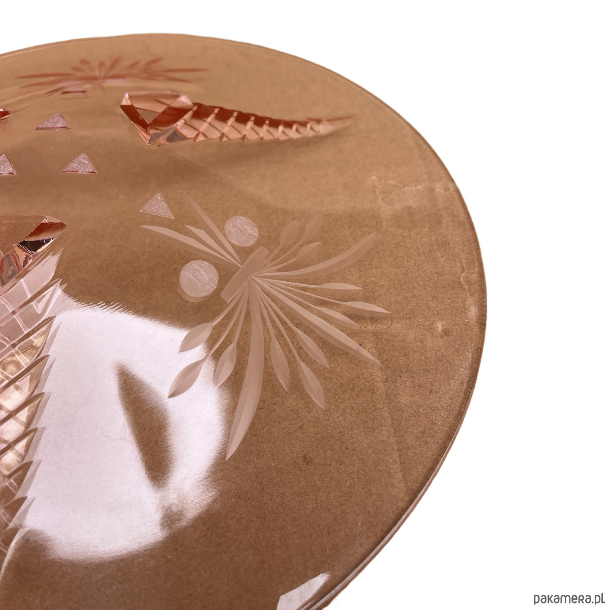 Piękna Patera żardiniera Szkło rozalinowe, przezroczyste i matowe Łososiowa patera w stylu art deco, Brzozówka wyprodukowana w Polsce dla Huty Szkła „Niemen” ok. 1930 Patera wykowna ze szkła szlifowanego. Stan zachowany w stanie oryginalnym bardzo dobrym.