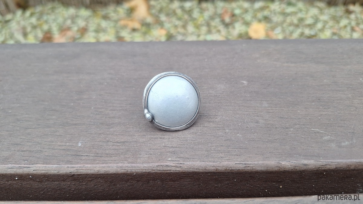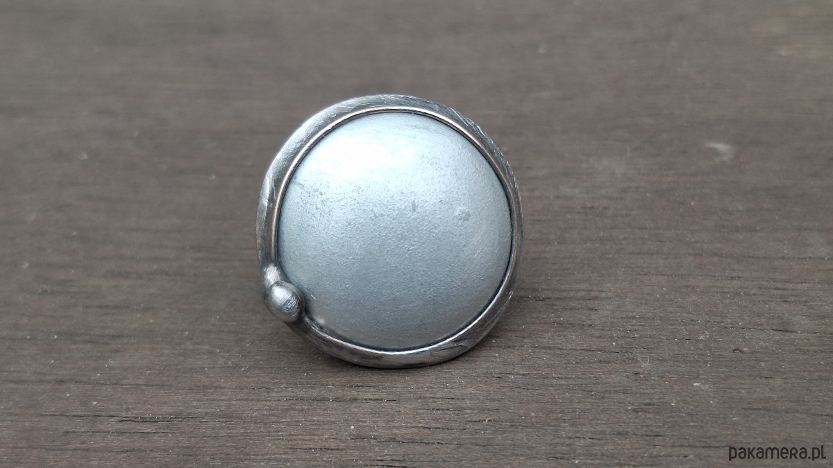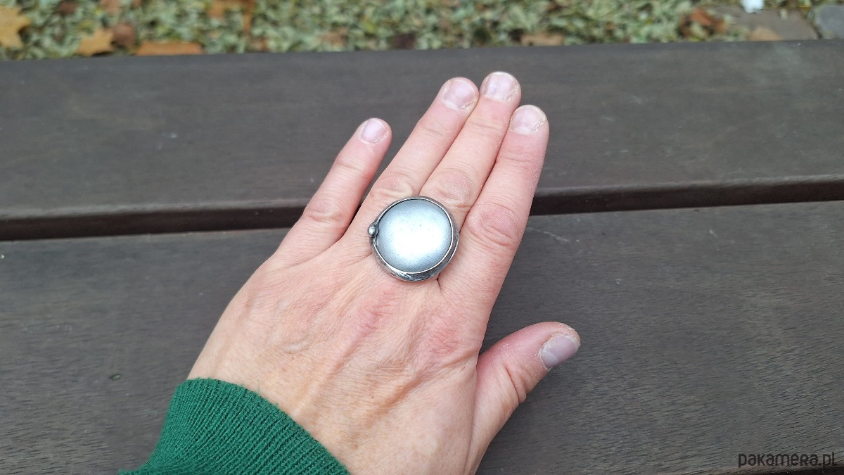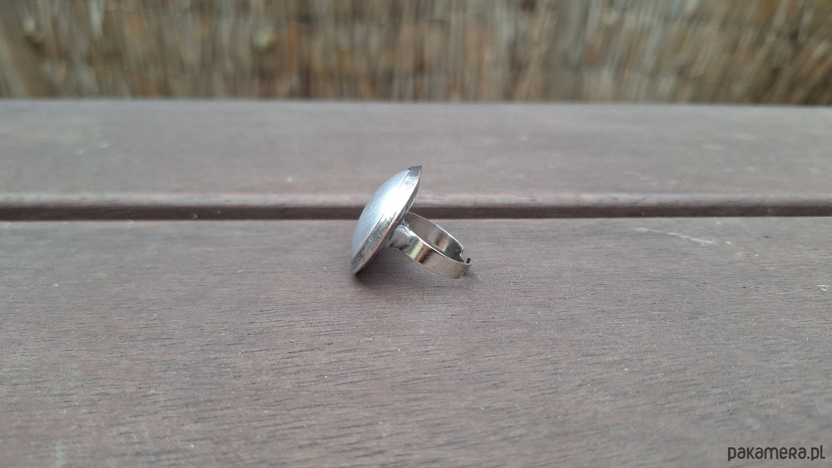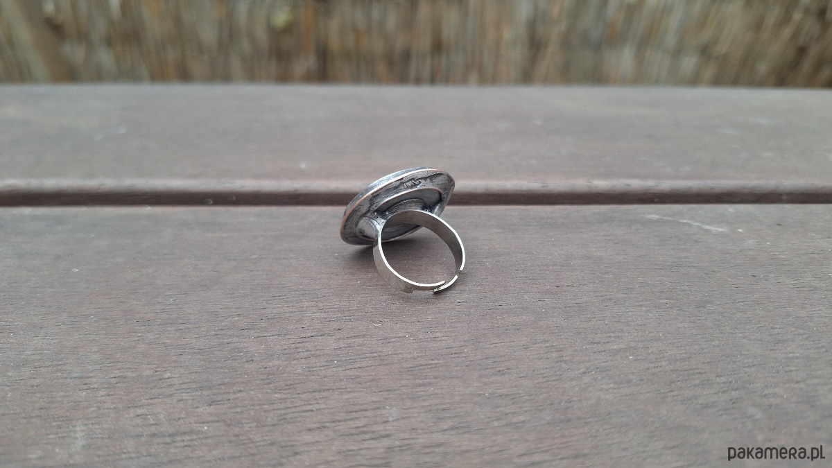 Pierścionek wykonany z miedzi, cyny i szkła. Wymiary ok. 2.5 na 2.5 cm. Regulowany. Nie jest ciężki.