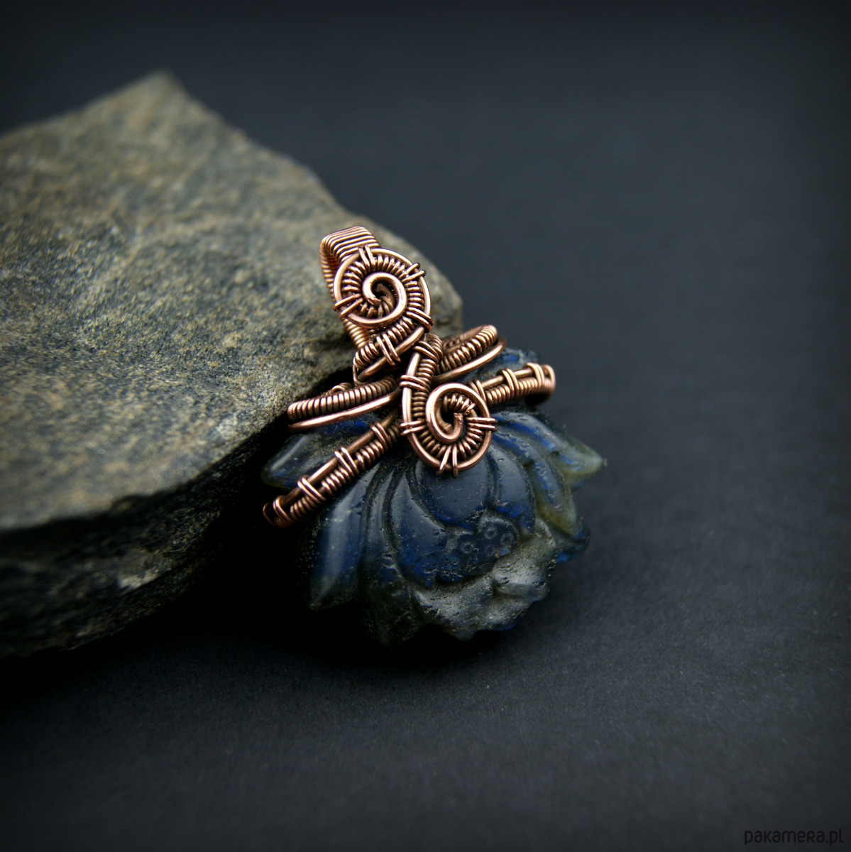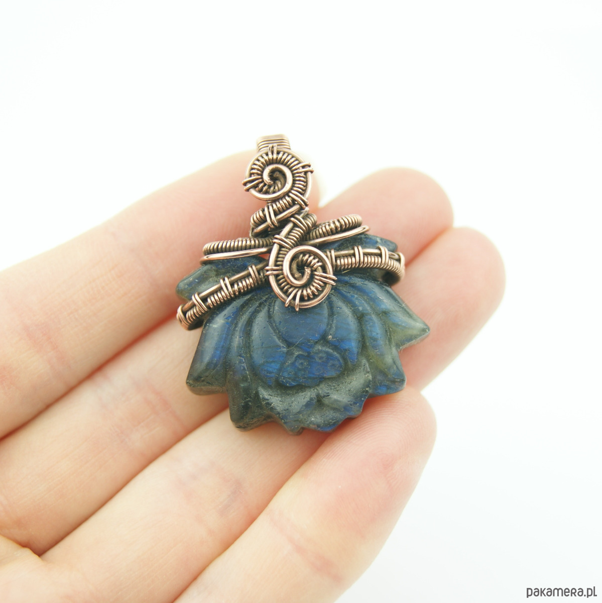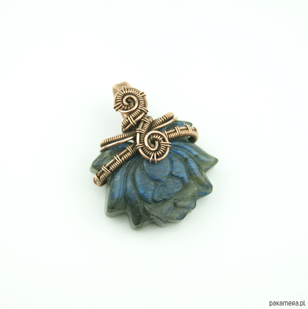 Wisiorek powstał z wyjątkowego kamienia jakim jest labradoryt, jego barwa zmienia się wraz z położeniem względem źródła światła.Kamień jest rzeźbiony w kształt kwiatu lotosu. Całość misternie opleciona miedzią.
