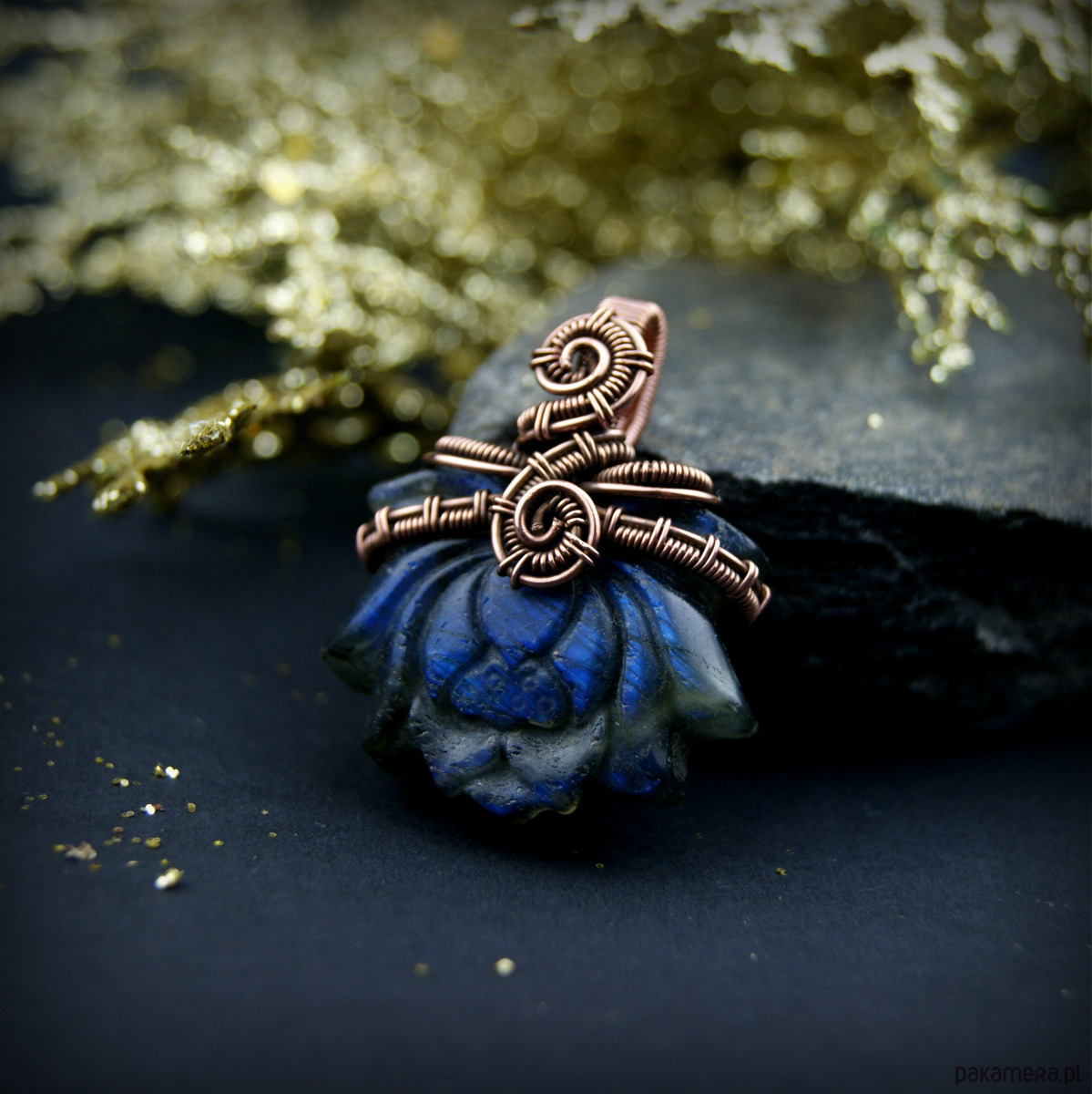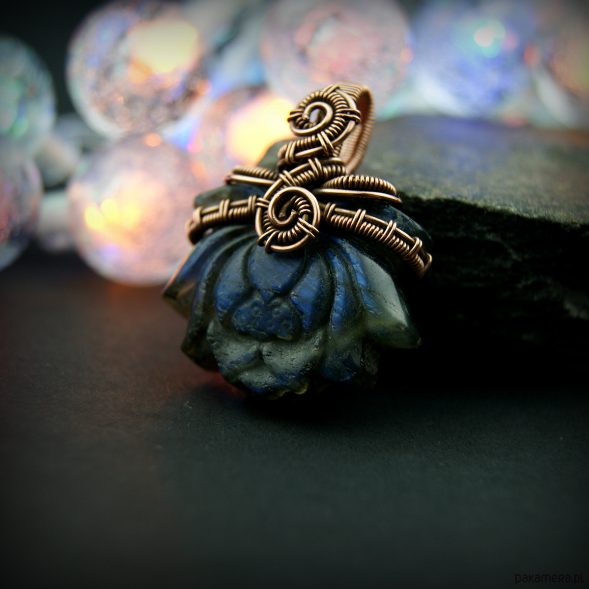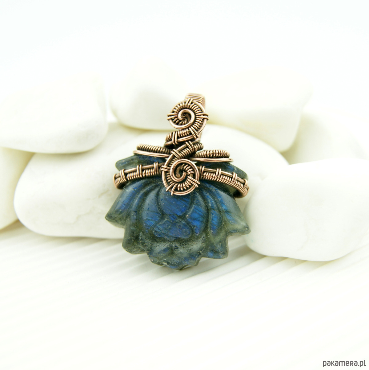 Wisiorek powstał z wyjątkowego kamienia jakim jest labradoryt, jego barwa zmienia się wraz z położeniem względem źródła światła.Kamień jest rzeźbiony w kształt kwiatu lotosu. Całość misternie opleciona miedzią.
