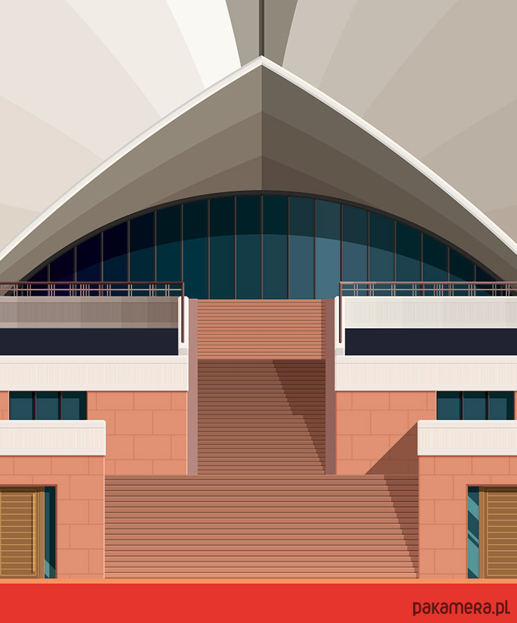 Plakat z autorską grafiką inspirowany Świątynią Lotosu (Lotus Temple) w Delhi. Pochodzi z serii "Dookoła Świata" i przedstawia największą świątynię bahaistyczną w Indiach. Inspiracją dla bryły budynku był kwiat lotosu. Zaprojektowana została przez kanadyjskiego architekta irańskiego pochodzenia, Fariborza Sahre.
